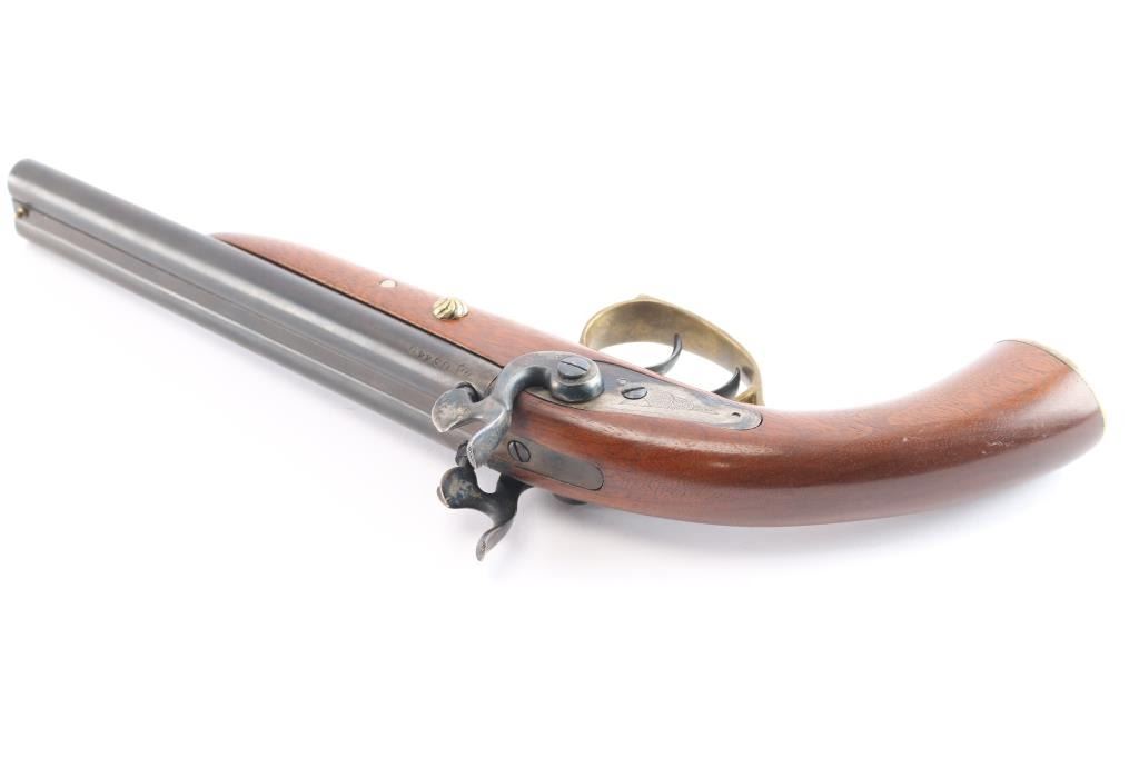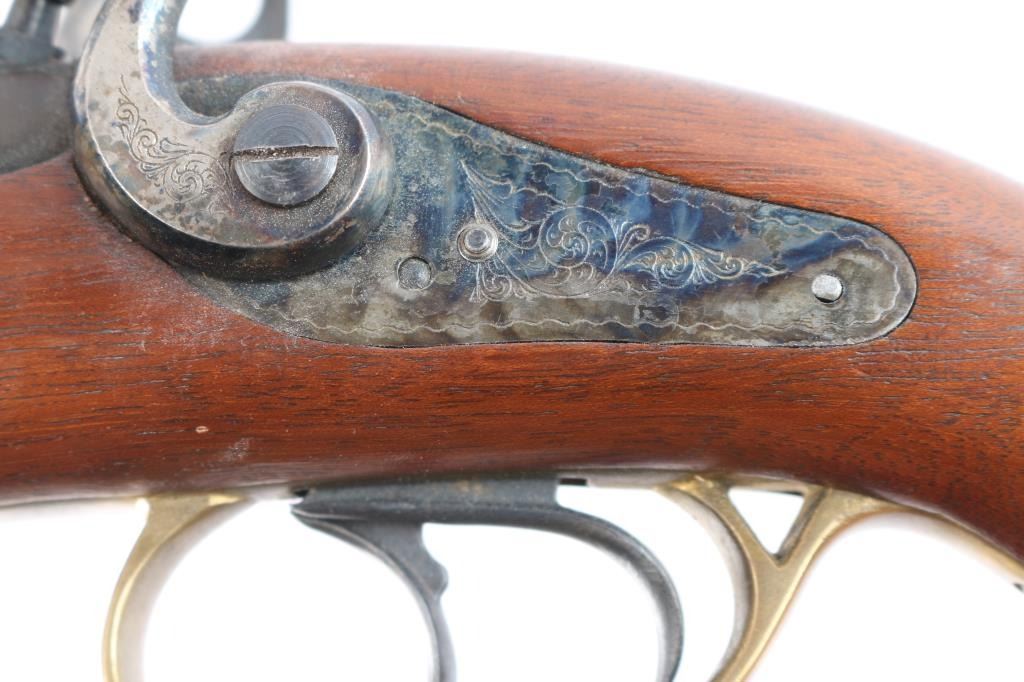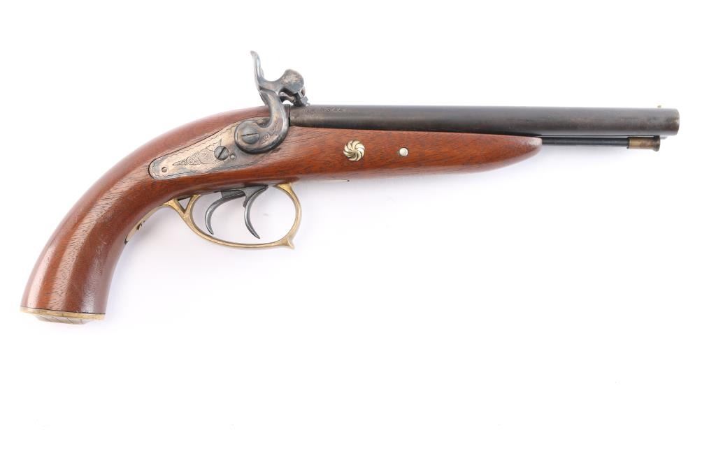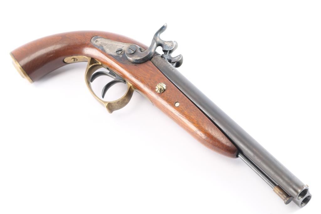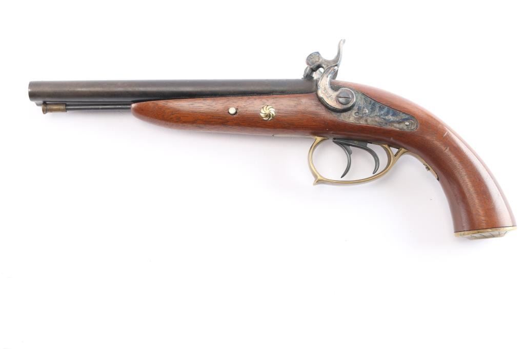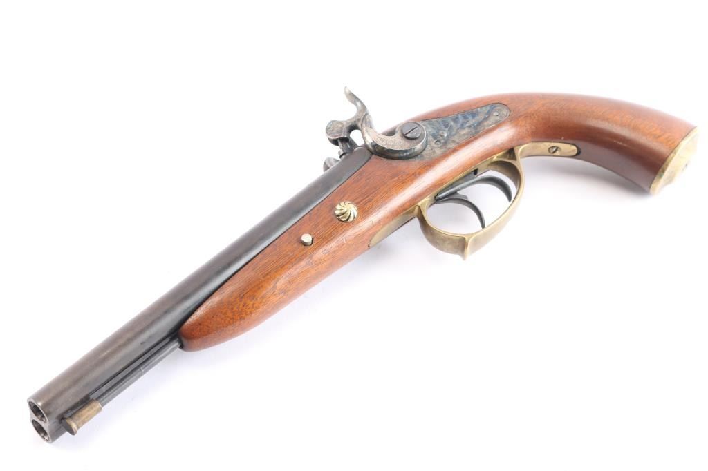 SN: 03440. Nice quality double barrel percussion pistol manufactured in Italy by Armi Chiappa in 1976. In the style of Howdah pistol, similar to a "leopard gun" Features 8" barrels with brass sighting bead, double triggers, brass plated fittings, triggerguard and grip cap, blued barrel, case colored lock plates 7 hammers. the hammers, plates and grip cap are floral engraved. the rifled bores are very good, overall condition is very good with some handling wear to the lock plates. two click hammer actions work well.