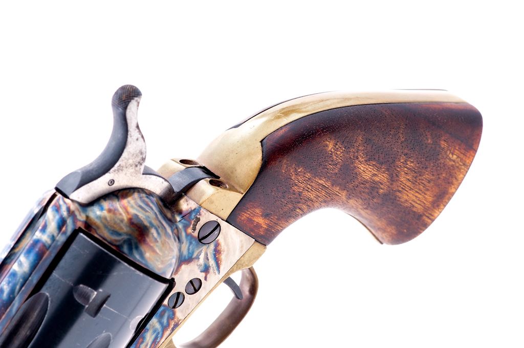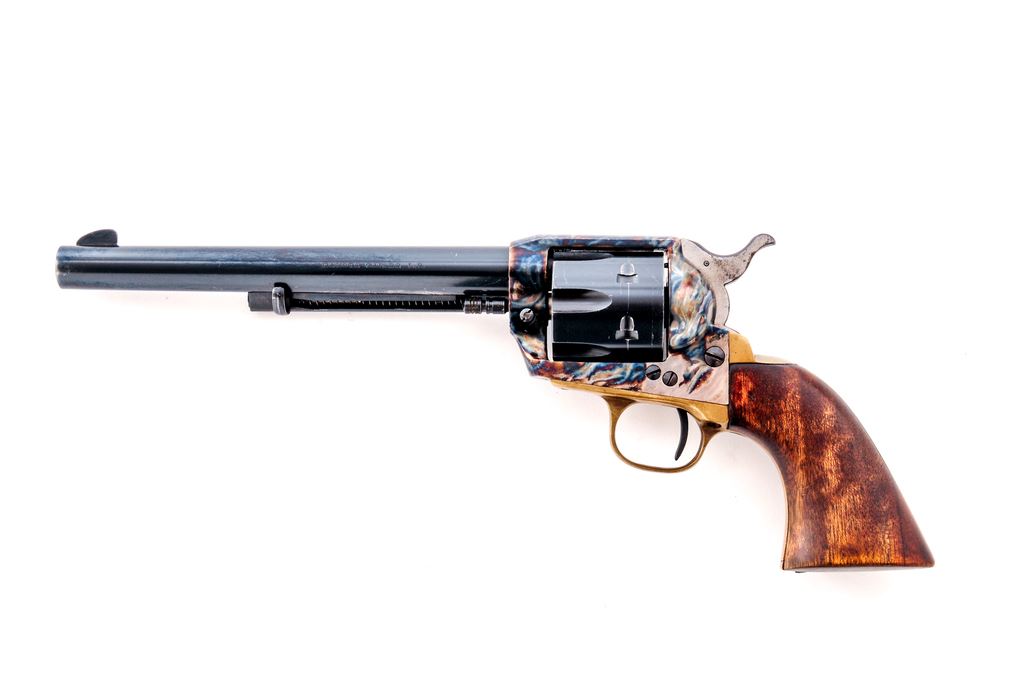 Armi Jager Dakota Single Action Revolver, #48471, .22 LR cal., 7.5'' barrel, blue finish, case hardened frame, brass triggerguard, smooth walnut grips, with standard fixed sights. Made in Italy. Condition is very good overall. Approx. 95% blue and case colors remain. Barrel with some light scratches; bottom with an area of heavier scratching, possibly from removal of the base pin. Cylinder shows a light index line. Case colors are bright. Grips with normal light marks from handling; showing evidence of slight sanding and an added coat of oil type finish. Left grip with a small chip to the inside edge. Action is smooth and crisp; excellent bore. Est.: $200-$350. (Modern/PPT)