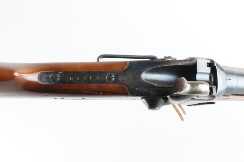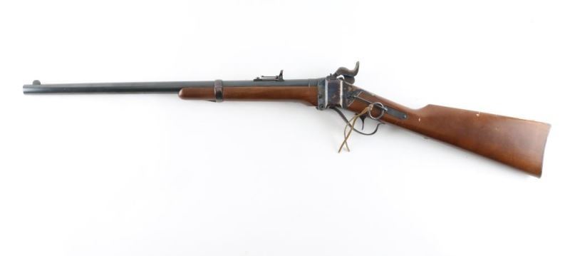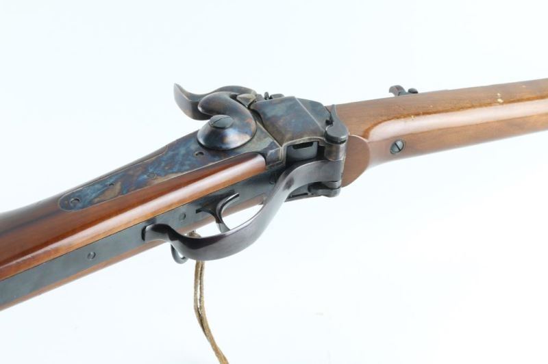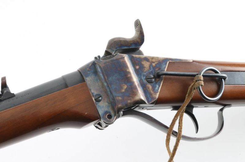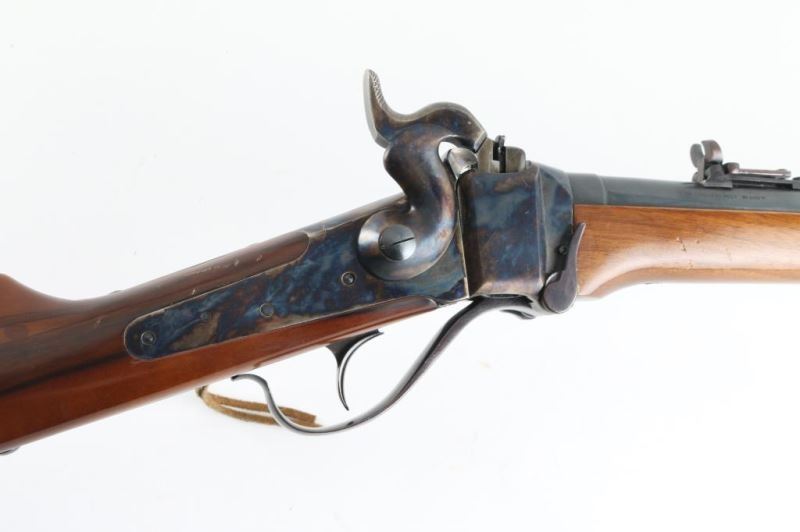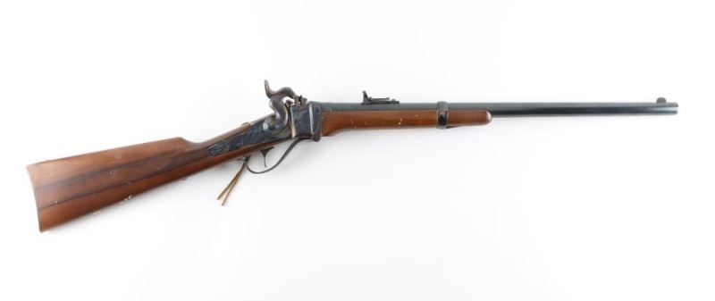 Rifle. Single-Shot Falling block Action. Italian made copy of the Sharps saddle ring carbine. 22' blued round barrel with front post/blade and Notch/ladder rear sights. Plum colored barrel band, and triggerguard/lever. case-hardened receiver, hammer, and buttplate. Smooth, straight wood stock/forearm. Bore is very good, a little dirty. Falling block action is smooth/tight. hammer locks up tight. Wood is good with some scratches/dings. Metal finish is very good with some scratches/edge wear. Some loss on the buttplate. NRA Condition-Near very good. Modern firearm.