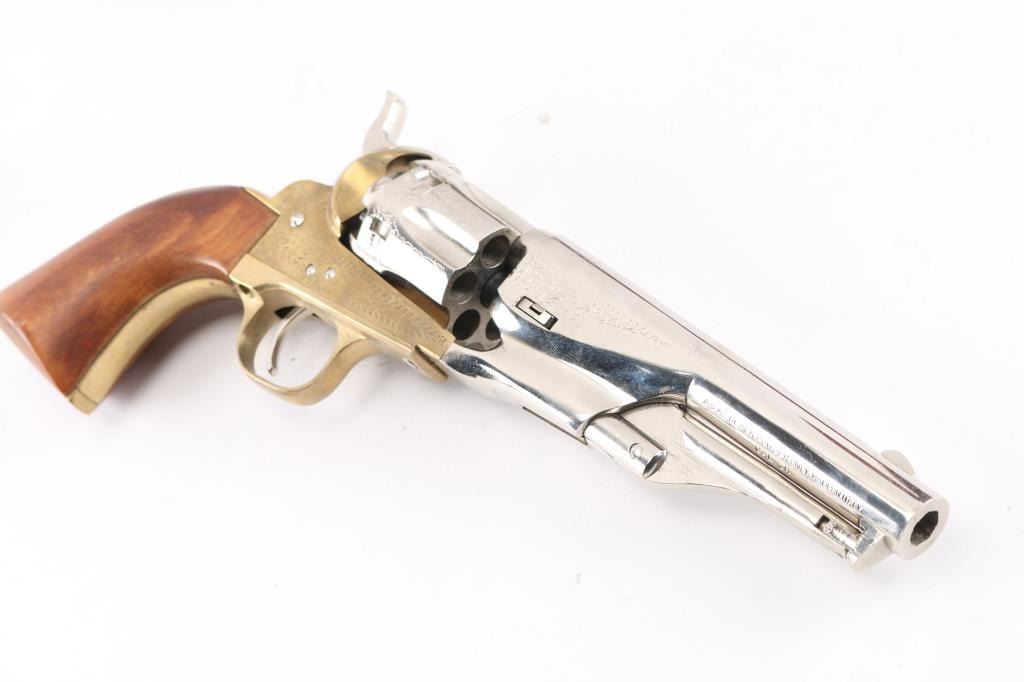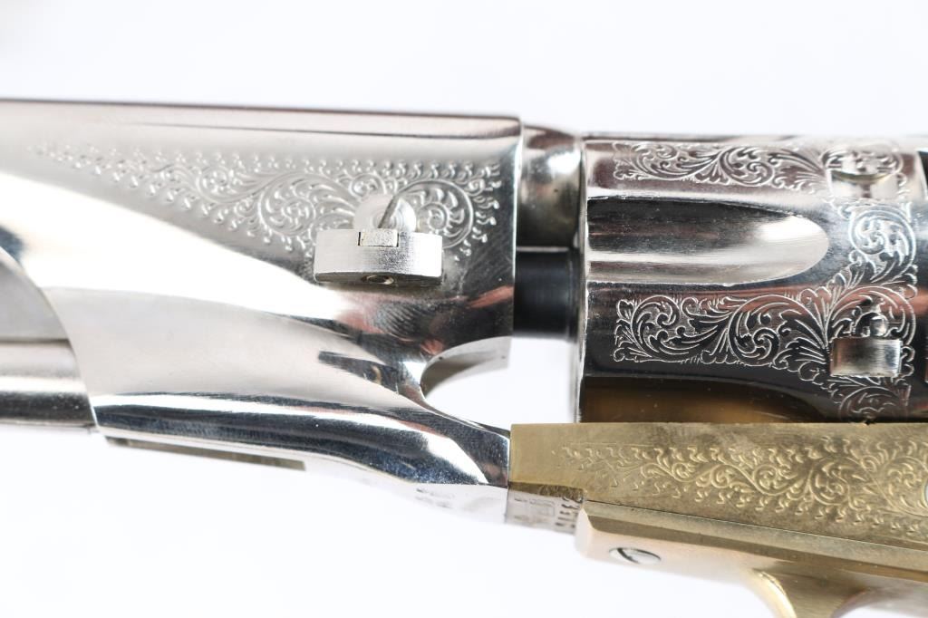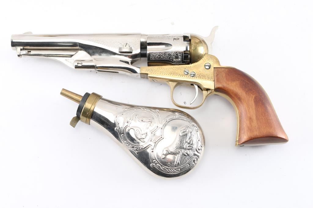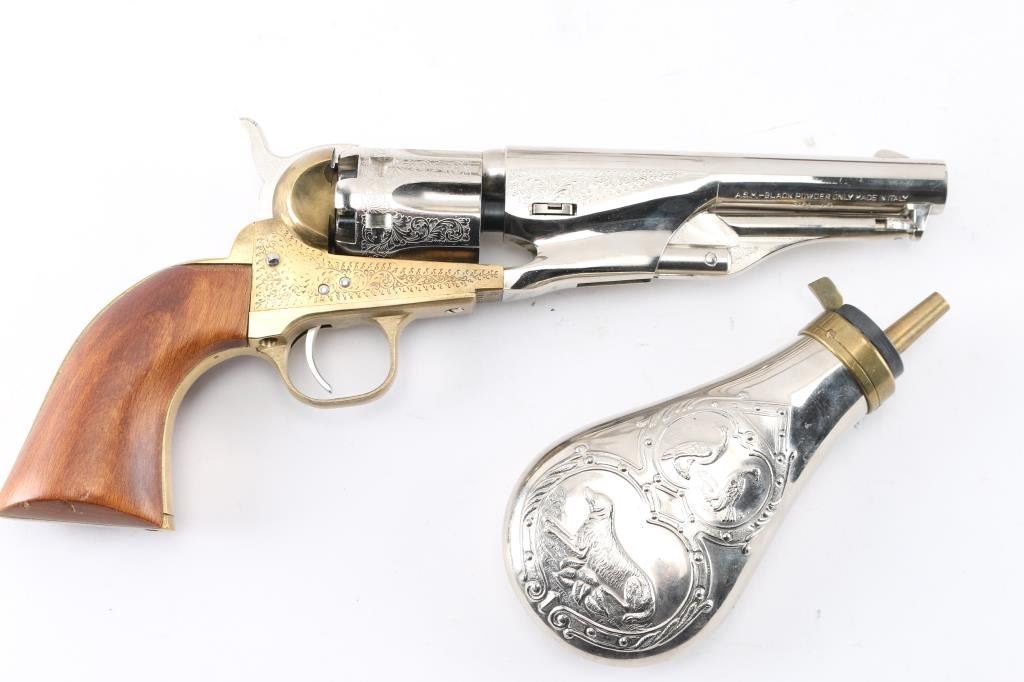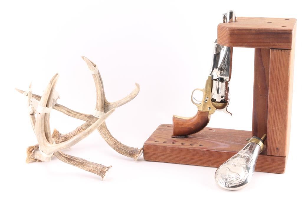 Modern reproduction of a Colt 1862 Police percussion revolver in .36 caliber. Manufactured in Italy by Armi San Marco circa 1994. Features scroll engraving, 5 ½” nickel plated barrel with loading lever, blade front sight, ‘v’ notch rear sight cut into the lip of the hammer, fluted six-shot cylinder, curved smooth trigger, checkered hammer spur, brass frame, brass grip frame and one-piece wood grip. Revolver exhibits superficial scratches with no major wear observed. The action is sound, the bore shows some light surface rust and the wood grip is good. Includes a custom pistol rack, nickel plated powder flask and a custom antler gun rack.