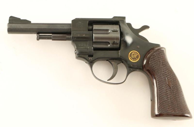 German made double action revolver chambered in .32 Smith & Wesson Long, circa 1965. Features a blued 4" barrel, ramp front sight, square notched rear sight, black finished alloy frame, fluted seven-shot swing out cylinder, serrated trigger, serrated hammer spur and one-piece diamond checkered faux wood plastic grip. Includes a Hunter smooth brown leather belt loop holster. Revolver retains approximately most of it's original finish and exhibits a cloudy appearance on the frame. Action is strong with solid lock-up, bore is excellent and plastic grips are fine. Condition is NRA very good. ***Modern Firearm***