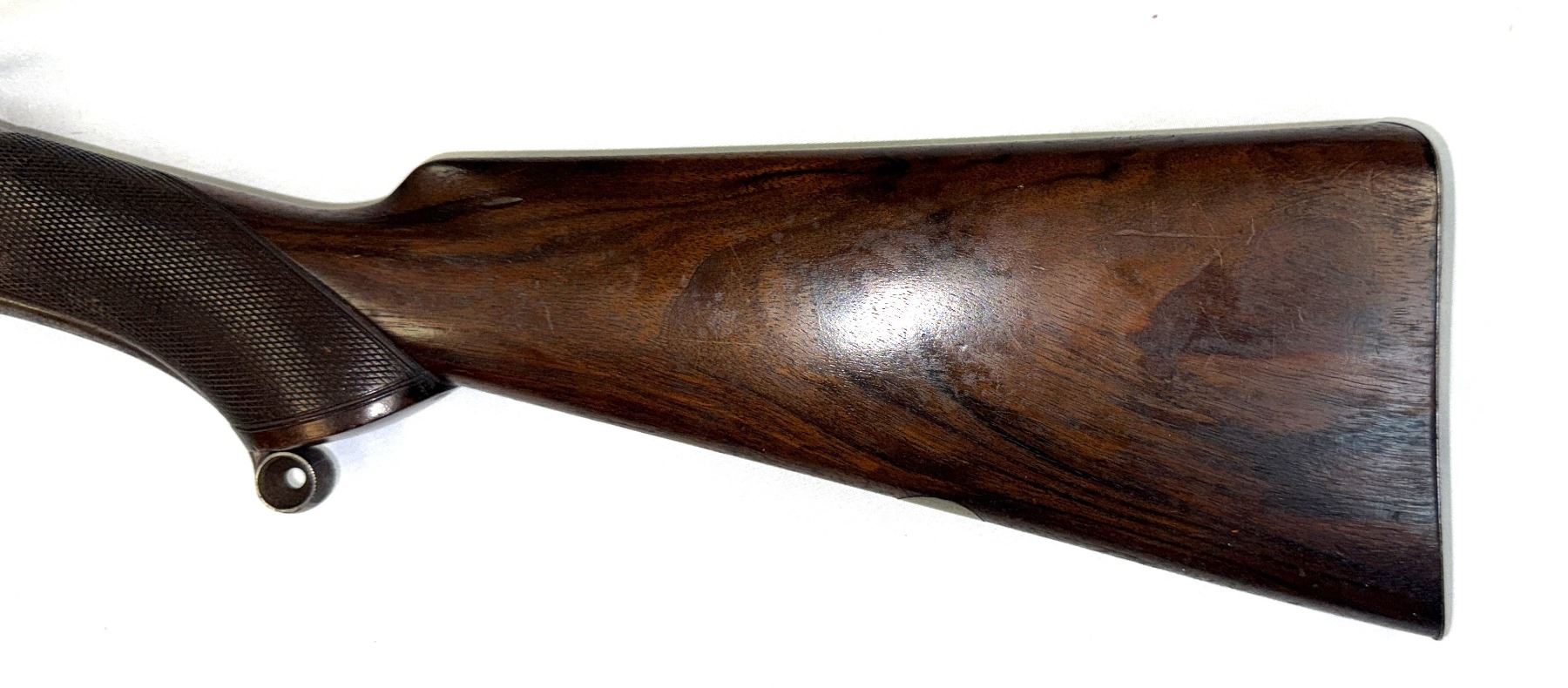 Rear Stock with checkered pistol grip. Steel buttplate. Silver ID plate.