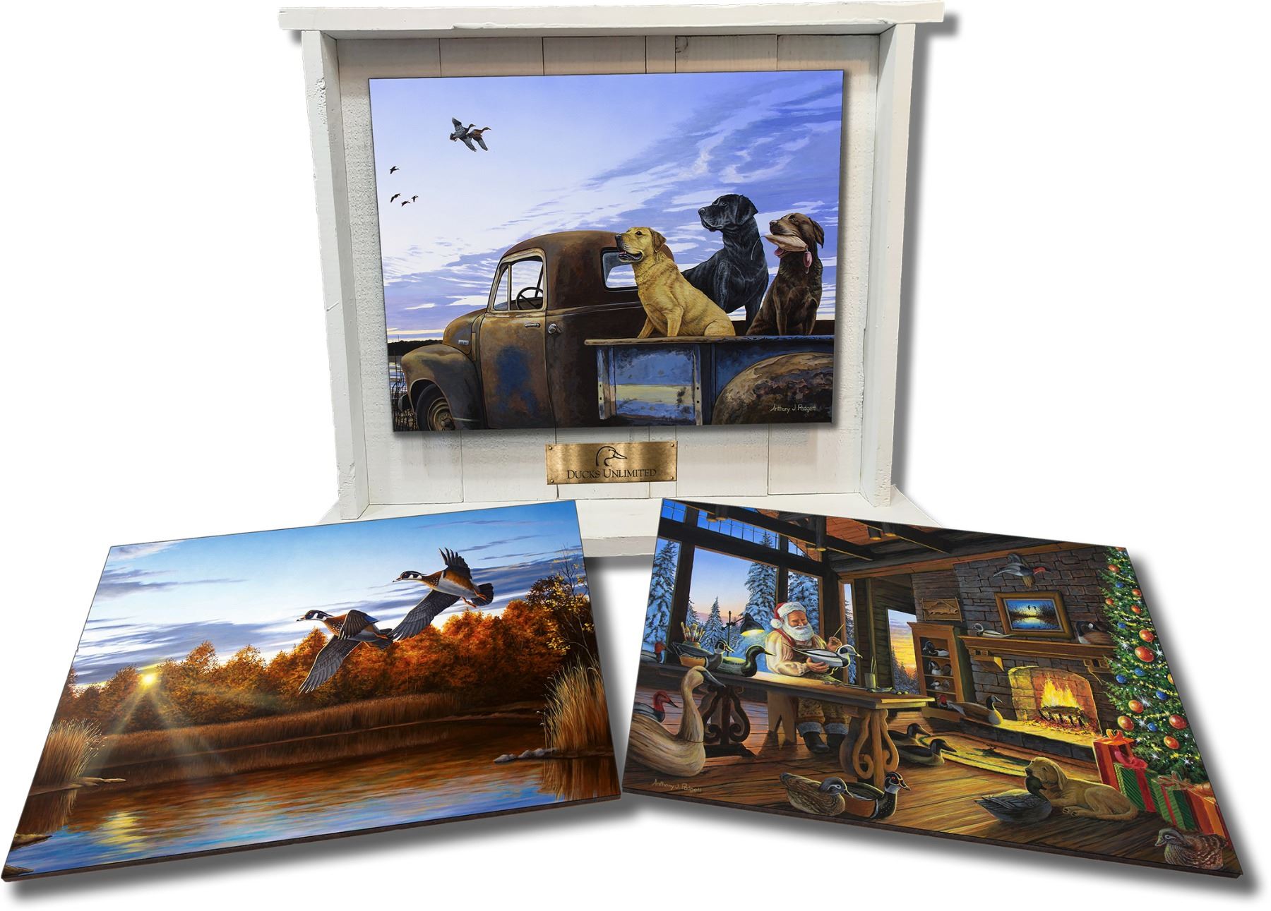The Art Shadowbox is a stunning and unique addition to any home, featuring three quick change art panels:“Full Load,” “Santa’s Hobby,” and “Autumn Home” by the talented artist Anthony Padgett. Each panelmeasures 15.5” x11” x .25” and includes a wood cleat on the back for easy hanging. The shadowbox itself is crafted from .75” pine with a beautiful, whitewashed finish, measuring 22” x 17” x 3.5”. A metal medallion with the Ducks Unlimited logo is centered below the artwork, adding a touch of elegance to this exquisite piece.