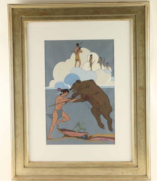 larger piece from a respected Navajo artist, untitled depiction of a man fighting a bear, 30" x 24" framed.