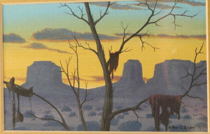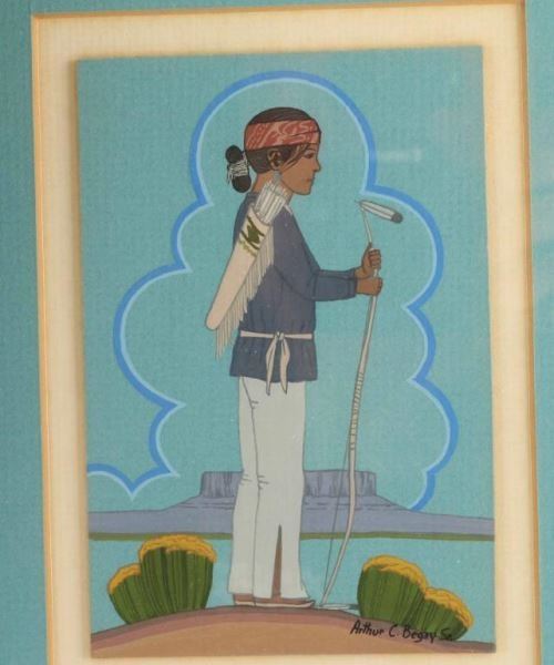 three smaller pieces from a respected Navajo artist: untitled study of a young man, 11" x 9" framed, untitled landscape, 9" x 11" framed, "Navajo Woman Watches Her Sheep" 17" x 15" framed