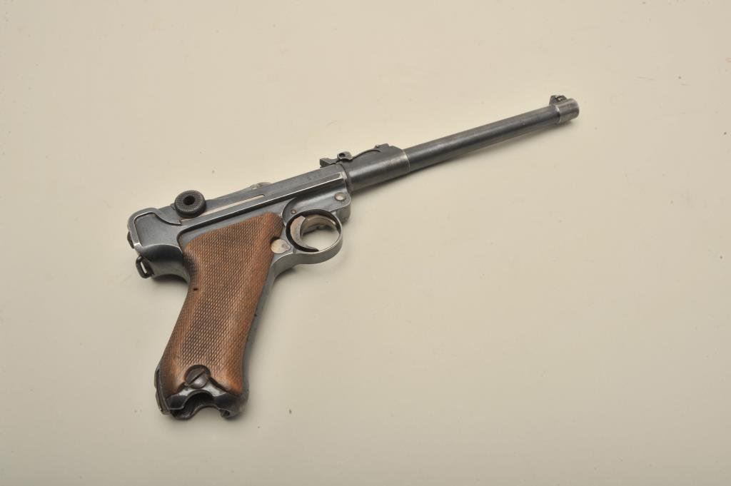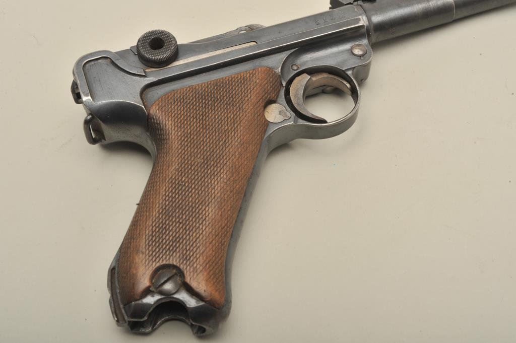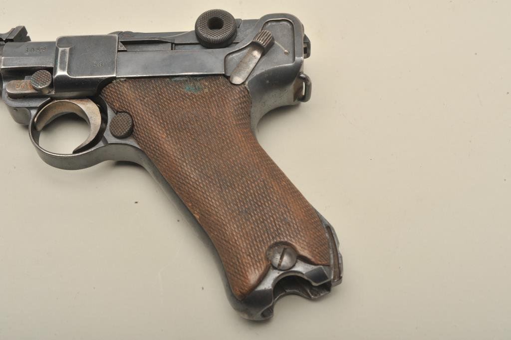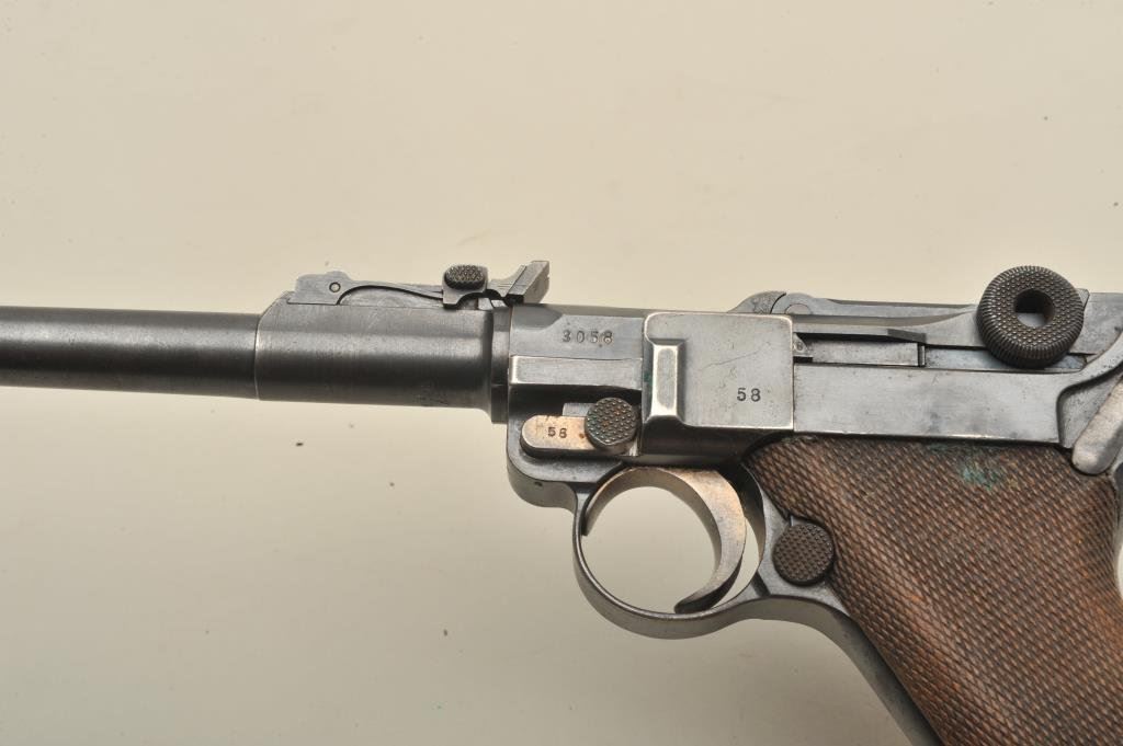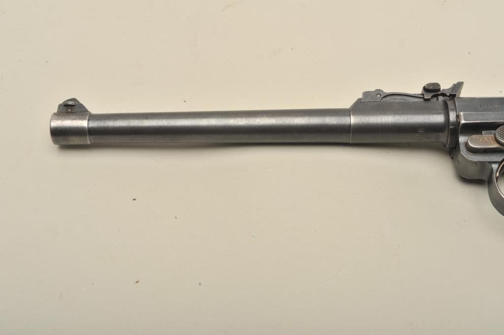blued finish, checkered wood grips, no magazine, S/N 3058 (all matching visible numbers), in overall very good condition with considerable muted blued finish remaining on metal surfaces, good bore, crisp action, sharp markings and good grips. (C&R/PPT). Est.: $1250-$2,500.