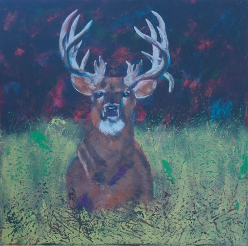 Portrait of a non-typical white tail buck in acrylic and oil pastel, 30x30