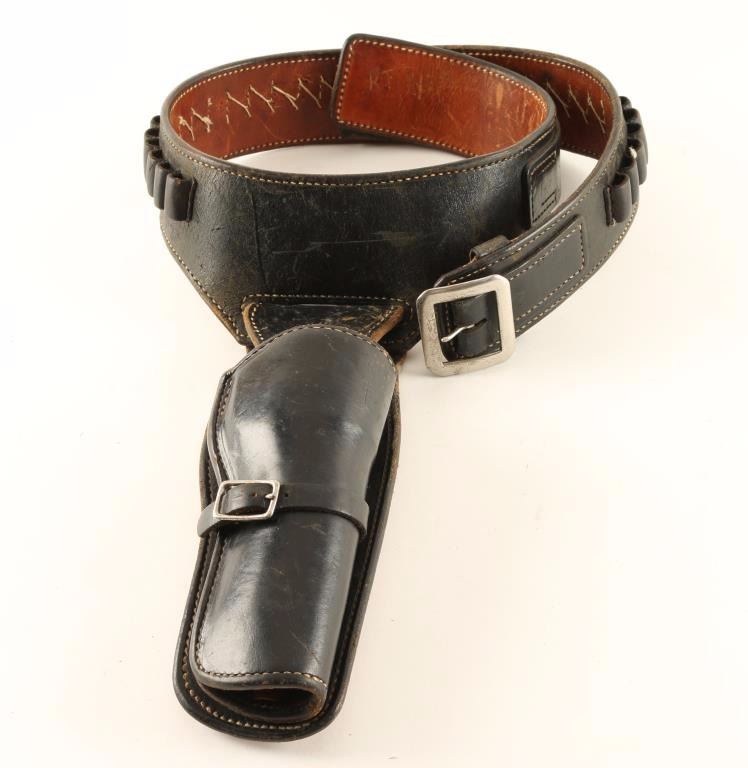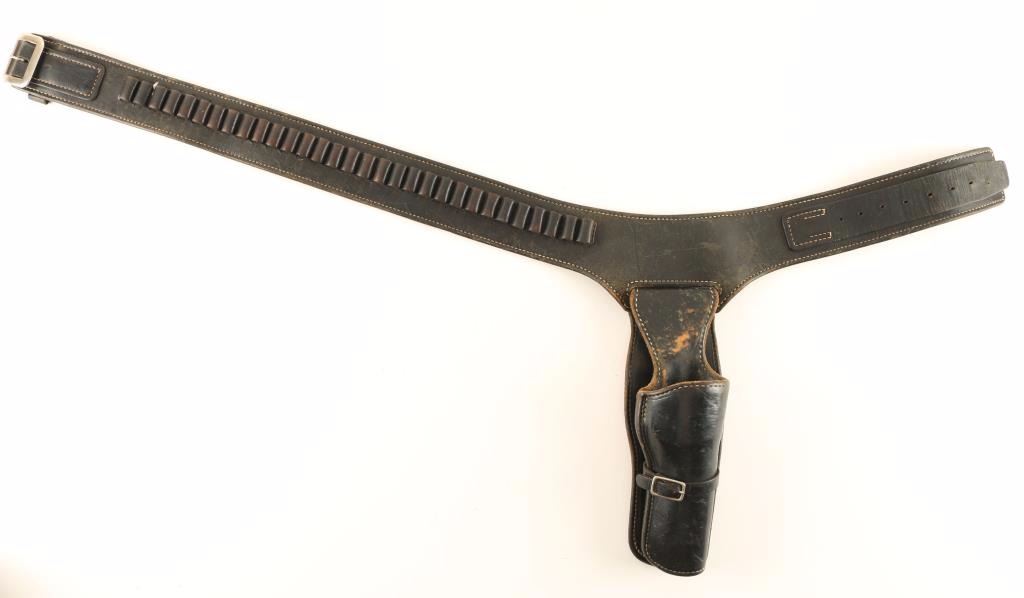 Smooth black leather finish, maker marked twice - once on belt and once on holster. Patent # 2832519. Rig measures 42" end-to-end, size 32/34.