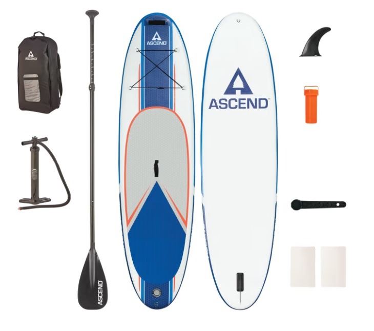 It's time to start exploring. The Ascend® Inflatable Stand-Up Paddleboard Package comes with everything you need to enjoy your time on the water like never before. The inflatable drop-stitch ISUP stores and transports easily: Just pump it up and go. The full, round nose adds stability and improves glide. Bungee tie-down straps let you bring gear aboard, while the rear D-ring lets you anchor up, attach a leash, or tow a transporter with extra gear. A grippy ethylene vinyl acetate (EVA) deck pad provides sure footing, and the removable 9" SUP fin provides outstanding tracking. The soft carry handle simplifies transportation. Includes adjustable, 3-piece paddle; backpack storage bag; and dual-action pump. Does not include ankle leash. 10'6"L x 32"W x 5"H. Max Wt. Cap.: 350 lbs.