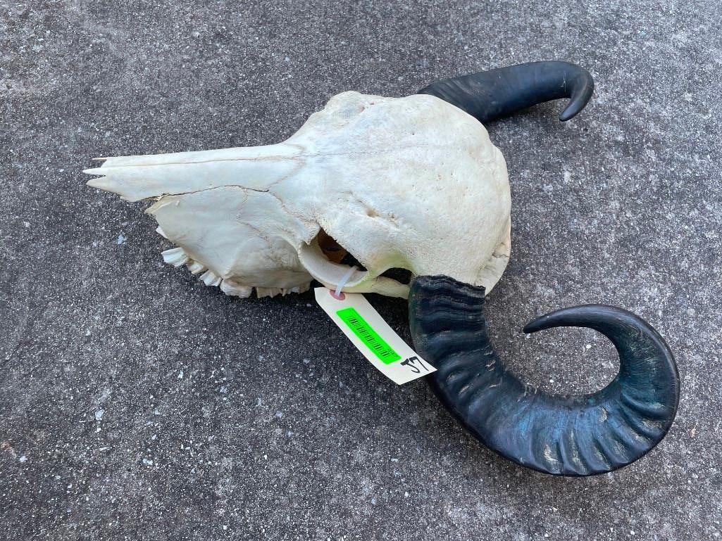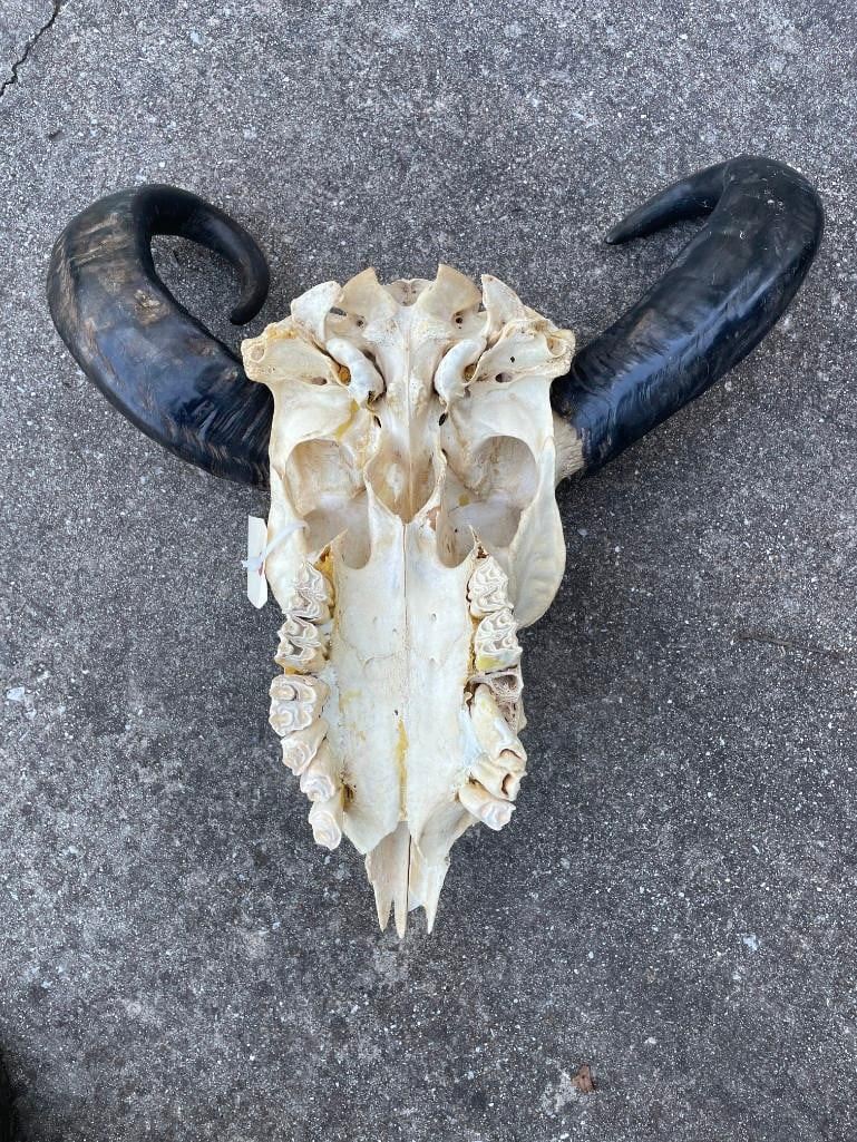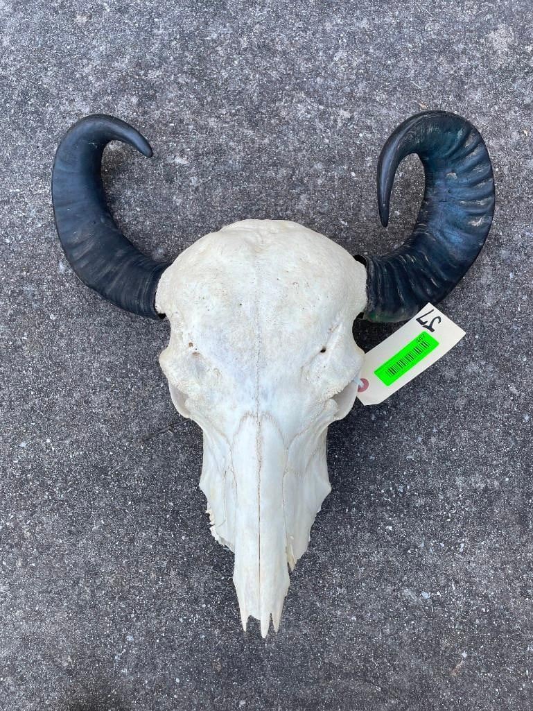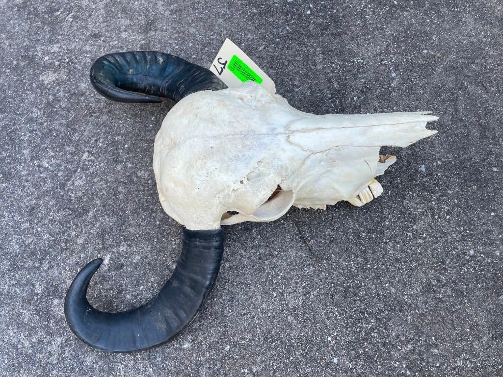 Asian WATER BUFFALO Skull with most of its teeth. The Horns measure 22.5" Long and 19.5" Long. The Total Skull measures 20" Wide (at the widest point) x 15.5" Long overall. TAXIDERMY