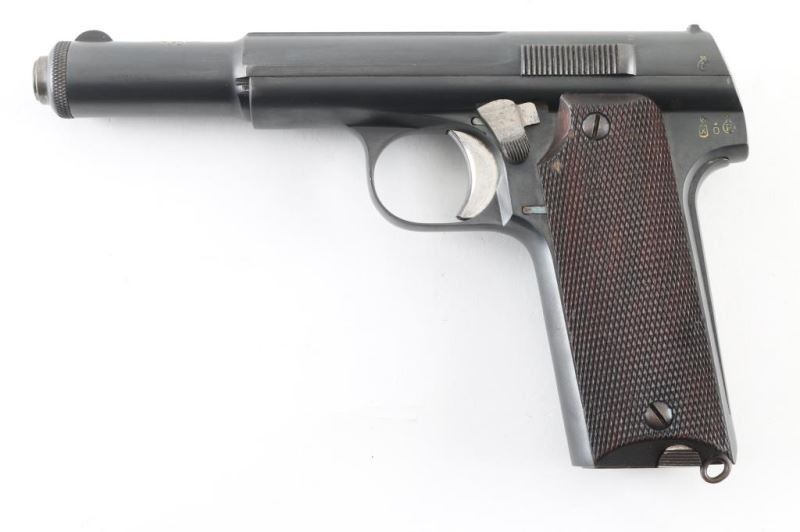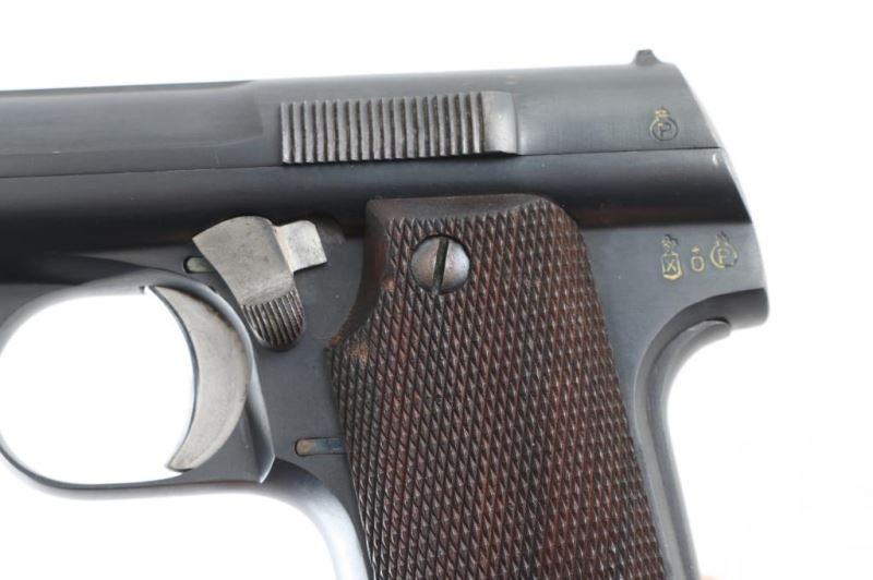Pistol. Semi-Automatic. 8-rd magazine. Blowback action.5.3" barrel. Spanish made Astra 600designated the "Pistole 600/43 when is use by the German military in WW2. Approx. 59,400 made. Serial number matched on frame, and slide. Top of slide stamped with Astra logo, and " Unceta Y Compania S.A. Guernica Espana". Spanish proofs on left frame. right frame stamped with what appears to be Waffenamt Eagle/WaW820. Markings are highlighted in white. lanyard ring. Bore appears very good/bright. Checkered hardwood grips are very good with a few minor chips. Blued finish has dulled a bit but is about 98% with minor scratches/edge wear. Traces of nitre blue on the springs. 8-rd magazine is stamped with Astra logo. NRA Condition-Very Good. C&R firearm.
