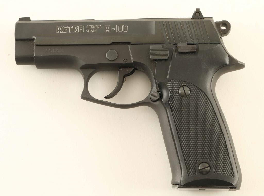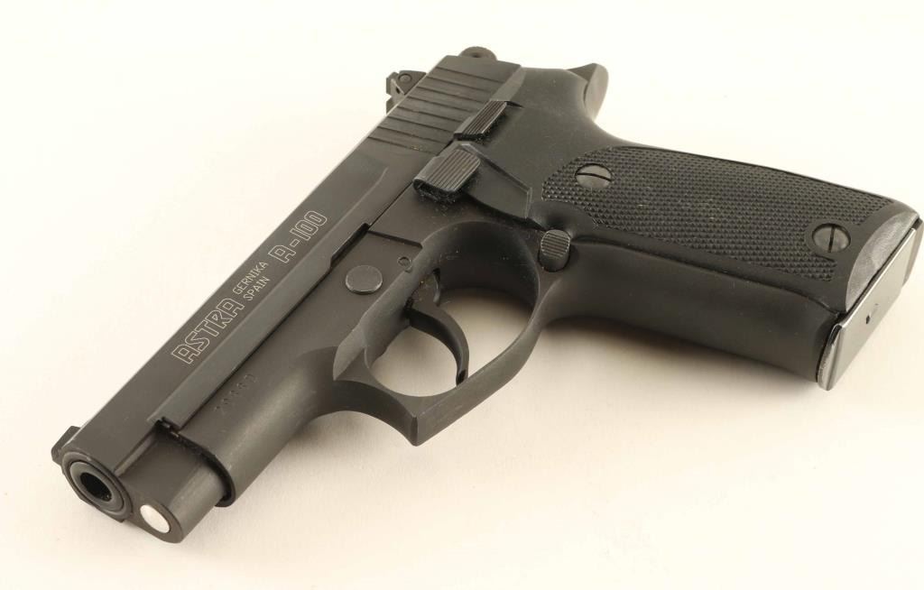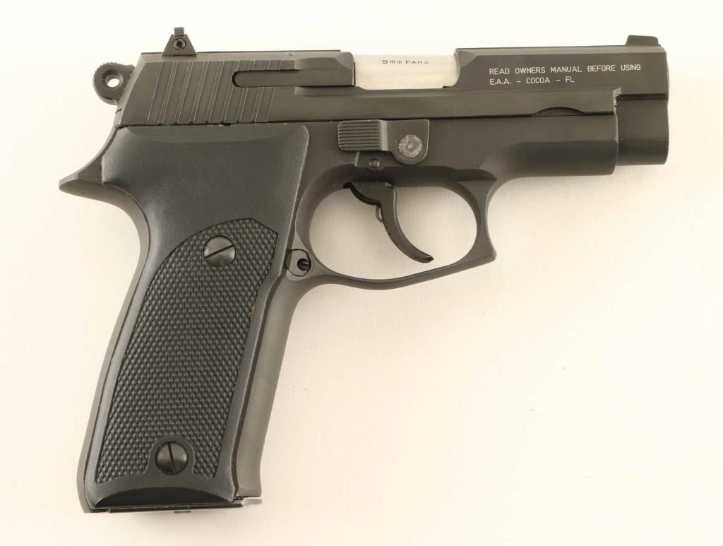 Spanish made double action semi-automatic pistol chambered in 9x19mm. Imported by E.A.A. of Cocoa, F.L. with import marks on the slide. Features a matte/brushed blued finish, 3.8" barrel, patridge front sight, drift adjustable rear sight, steel frame, smooth trigger, thumb decocker, serrated round hammer spur, push button magazine release, 17 round magazine, and two-piece checkered black plastic grips. Pistol exhibits approximately 97% of it's original finish showing minor edge wear and slight finish loss on the take-down latch. Action is crisp, the bore is pristine and plastic grips are fine. Condition is near NRA Excellent. ***Modern Firearm***