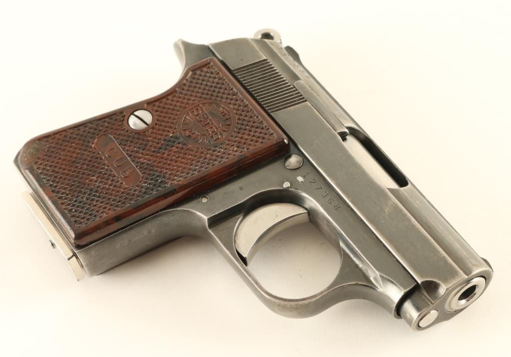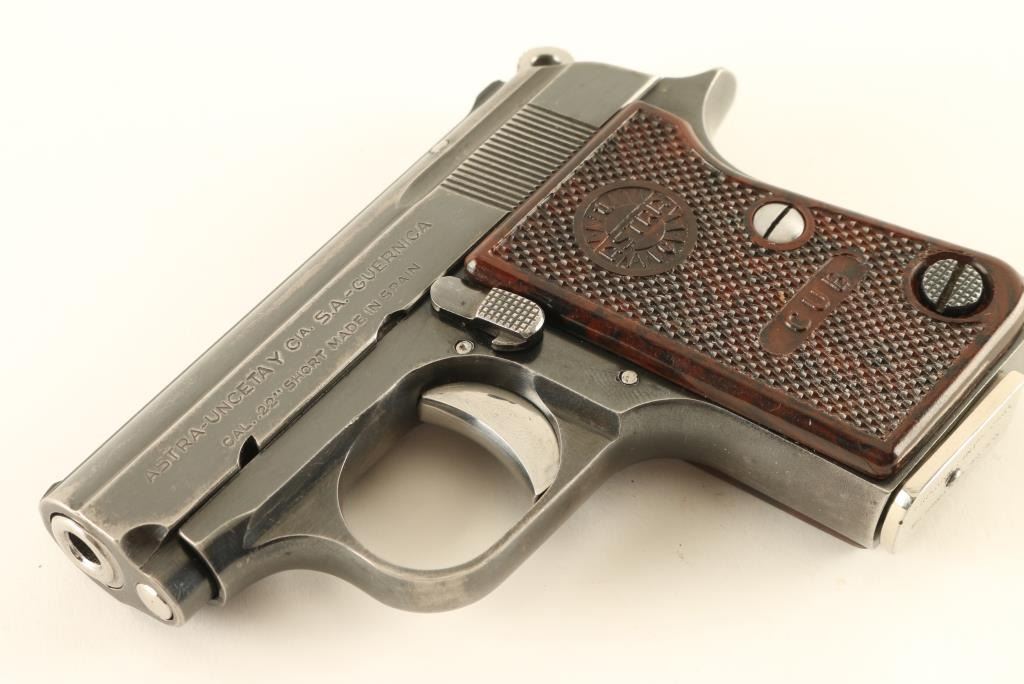Spanish rimfire pistol, marked on magazine base "FIREARMS INT'L CORP / WASHINGTON 22-D.C.". Features blued finish, brown checkered plastic grips with Astra logo and "CUB", single action trigger, 2.1" barrel, fixed sights, frame mounted manual safety, nickel plated trigger and magazine, push button magazine release at left side bottom of grip. Bore is excellent. Retains 75% blue, thinning and with bare metal showing at sharp edges. Grips are very good or better condition. No import marks observed on pistol, only magazine base. Slide numbered to frame. Includes photocopy of manual. Condition is NRA Very Good *** C&R Firearm ***