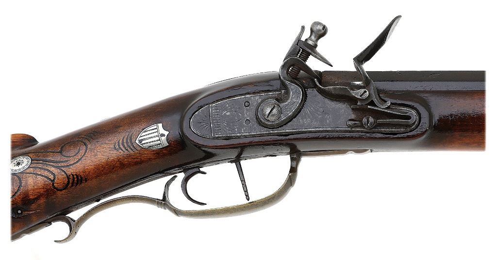 .32 cal, 40'' octagon barrel with an oxidized bore. This nice rifle has been neatly reconverted to flint utilizing antique components, the barrel with what appears to be an old blackened finish over old oxidation and light pitting. The top barrel flat is stamped with maker mark but it is sadly no longer legible, only showing ''D.'', the surname appearing to be five letters. The lockplate is a similar patina as the barrels and shows step at rear and some light embellishments. The fittings of this rifle are quite attractive, the barrels secured by three wedges which are rather plain without escutcheons but interspersed between them are four lovely silver inlays. There are additional small silver shields and embellished ovals inlaid along the sides of the buttstock while the left-side scant cheekpiece has a beautiful pierced starburst motif in silver. Brass hardware includes the heavy nosecap, dual ramrod thimbles, tailpipe, thin triggerguard with small rear spur, attractive solid sideplate with slightly beveled edges, crescent buttplate, toe plate and a very nice large pierced patchbox with light foliate embellishments, bordering and starburst on cover. The curly maple stock remains in very fine condition showing a few scattered thin drying cracks mostly along the forend edges and a thin chip missing left of the upper tang. The wood exhibits some nice tiger stripe grain figure throughout and the sides of the butt show some carved light foliate motifs. Stock fit to the hardware remains quite nice throughout and a slightly long simple hickory ramrod is present. The rifle is sighted with a simple fine v-notch rear sight and silver blade front and the lock is equipped with a rear curved set trigger and straight firing trigger. The lock is single acting and is a bit stiff and not very crisp but generally seems to function normally. This is a lovely rifle likely made in Pennsylvania or Ohio with some particularly attractive furniture. (13B11579-40) {ANTIQUE} (1500/2000)