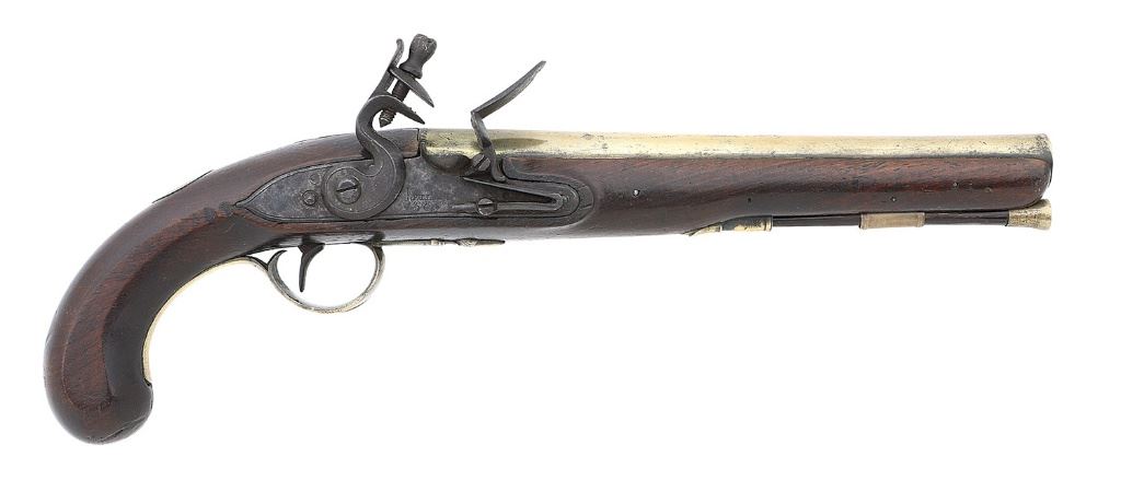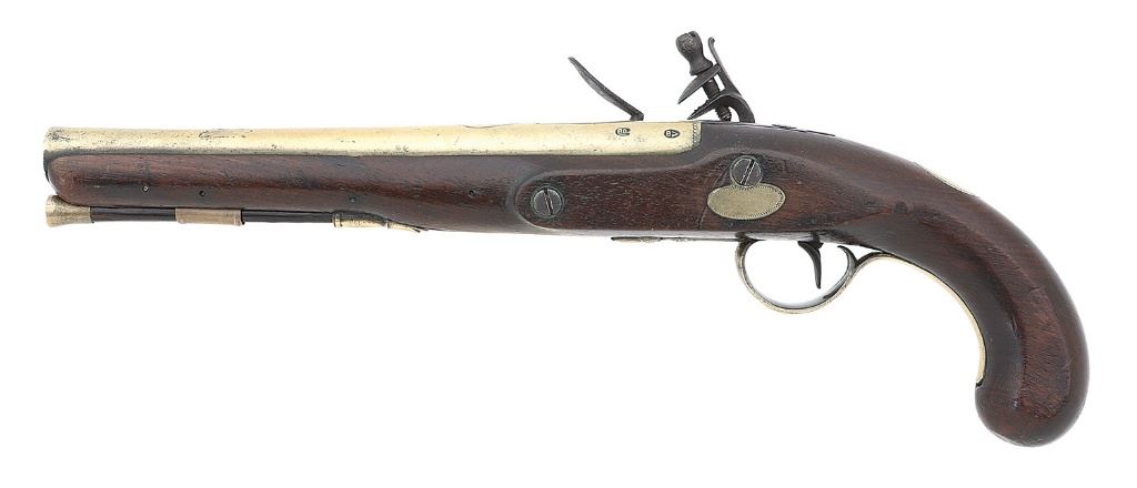 .56 cal, 9 1/4'' round barrel with very slightly swamped muzzle and a moderately oxidized bore. The brass barrel and fittings have mostly toned to a nice pale goldenrod patina showing a few scattered minor dings, light handing marks and some areas of mild tarnishing. The barrel shows light embellishments at the breech and nice markings with impressed ''(Crown) / P'' and ''(Crown) / V'' proofs and ''LONDON'' atop. The lockplate is of simple but attractive form with line border, pronounced teat at the rear, and unbridled frizzen toning to a deep plum-brown patina and showing some scattered old light oxidation. The center of the lockplate is very neatly engraved ''Ketland / & Co''. The attractive brass fittings consist of single ramrod thimble with nicely formed tailpipe, rolled edge triggerguard with nice acorn finial, food chopper rear lock escutcheon, and monogram plate atop the wrist showing light zigzag bordering. The walnut stock with flat-sided grip remains in very fine condition maintaining a lovely honest appearance with strong oil finish and raised grain throughout. The stock shows just some scattered light dings and handling marks to be expected otherwise retaining fine edges and fit throughout. The original brass-tipped hickory ramrod is present and the lock seems to function well mechanically. A lovely Ketland pistol. (13B11133-5) {ANTIQUE} (1200/1800)