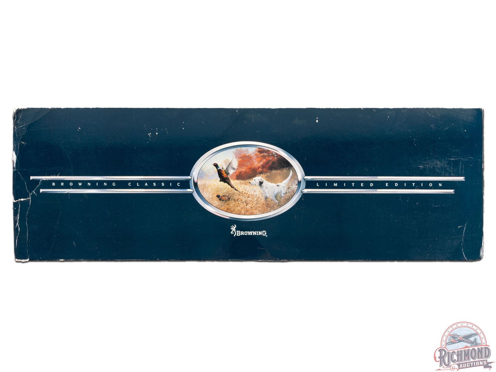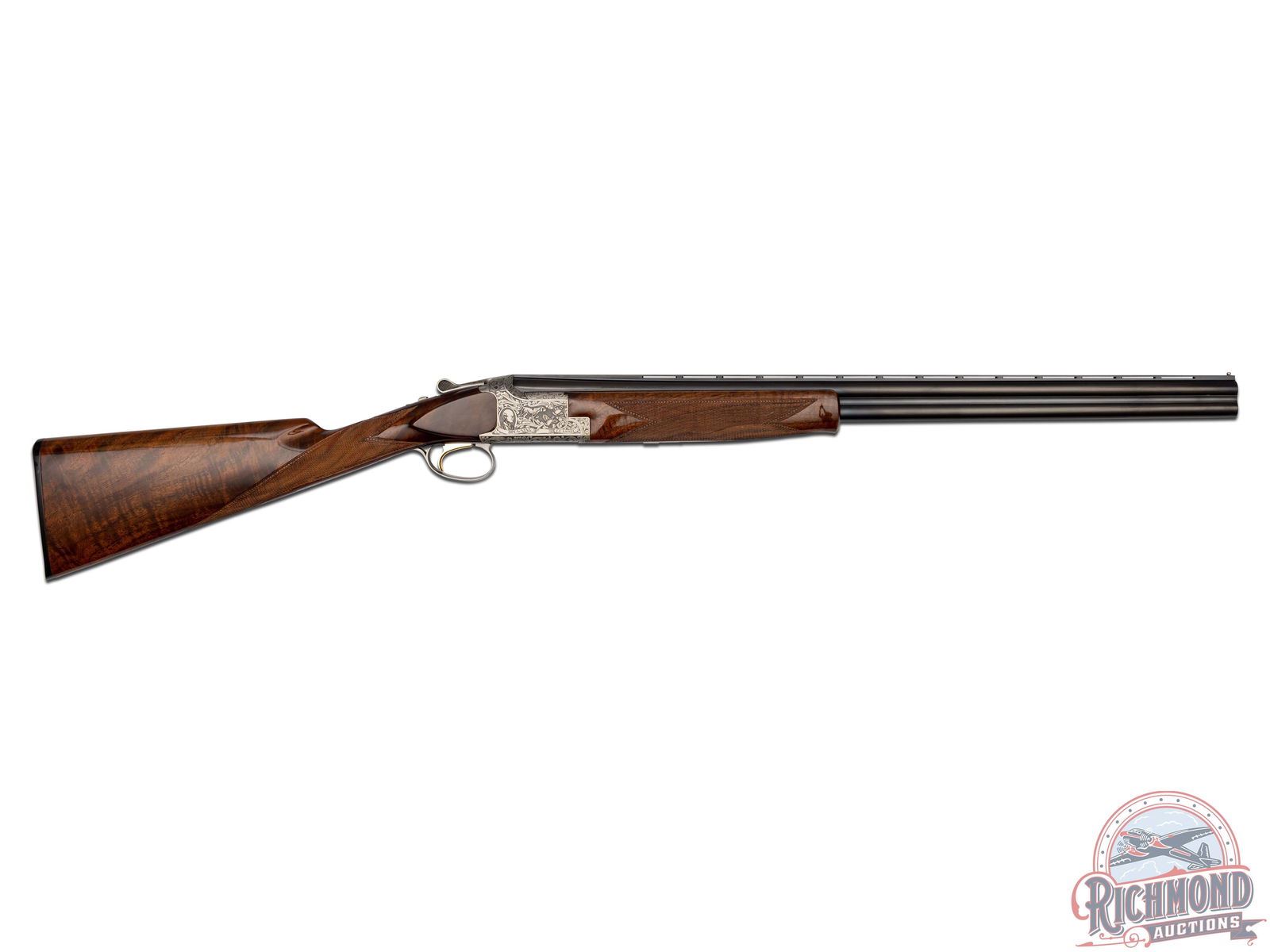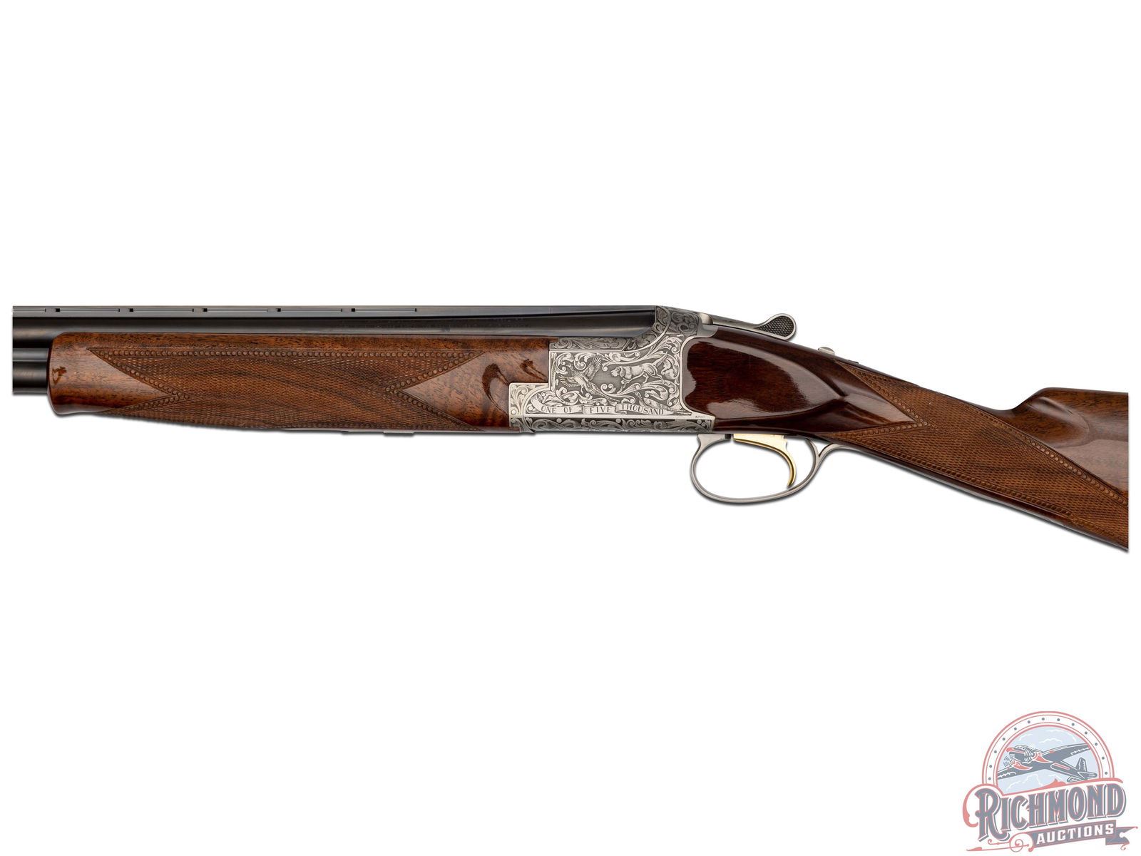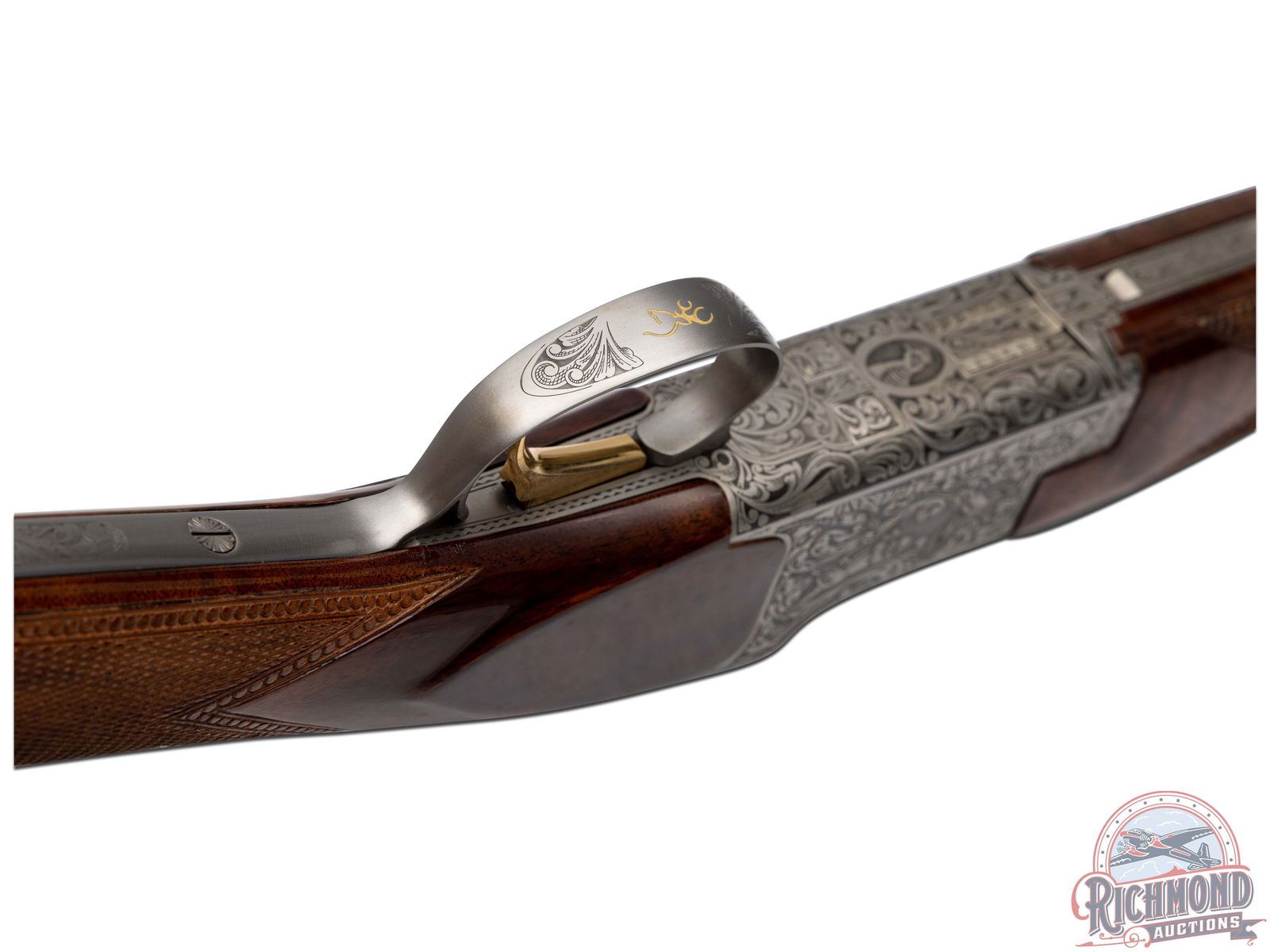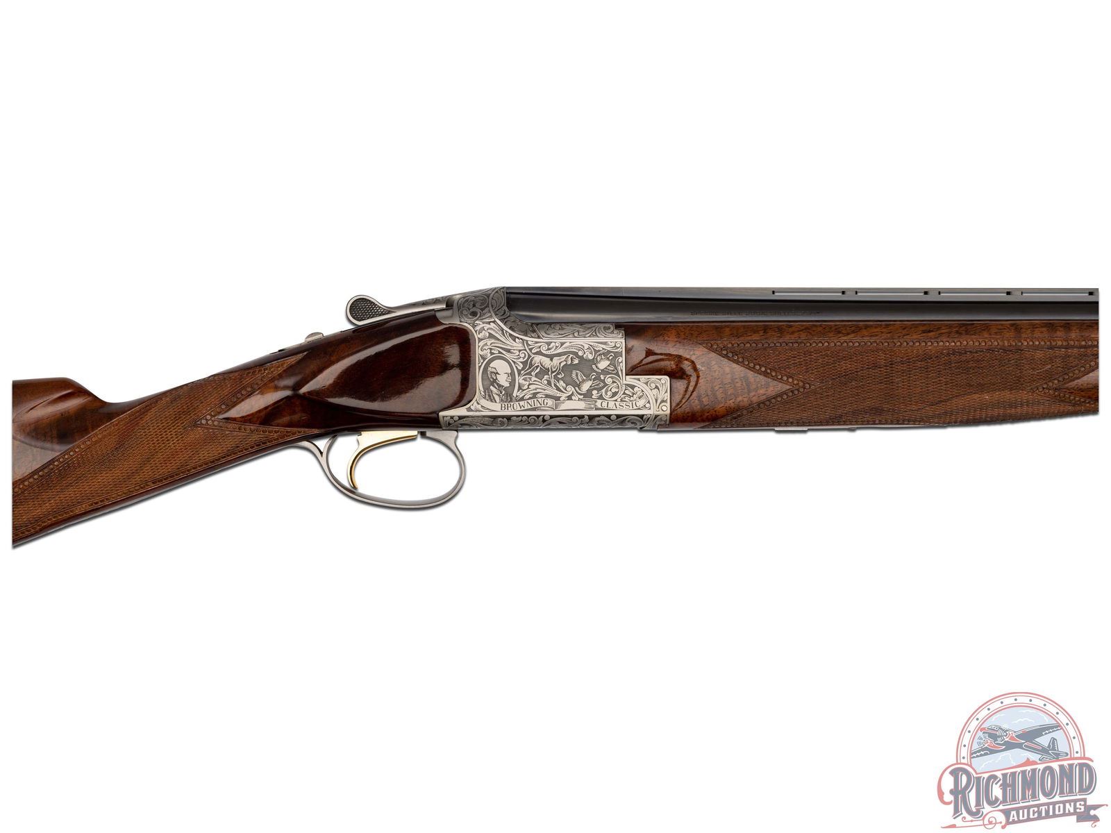 One of 2500 manufactured as a single year exclusive in 1986 and engraved by FN in Belgium. Blued 26" O/U steel barrels with ventilated rib, single bead with fixed improved cylinder and modified chokes with 2-3/4" chamber and ejectors. grayed polished steel receiver boxlock action with full coverage floral and dog scene engraving. Left side of receiver marked "1 of 5000" although only 2500 were actually manufactured. Right side marked "Browning Classic" with portrait of John Browning. Walnut checkered English grip stock with Browning hard rubber butt plate. gold-plated single trigger with top tang safety selector. Matching checkered Schnabel type forearm. Includes original Browning box with paperwork. LOP: 14-1/4". DAC: 1-3/8". DAH: 2-1/4". CALIBER: 20 GA. S/N: P33BCO445. FFL STATUS: Modern.