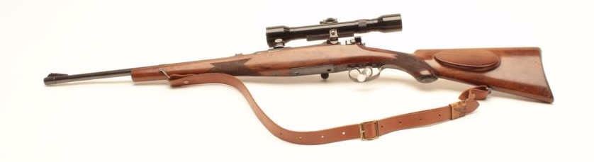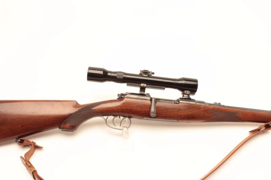 Austrian Mannlicher bolt action rifle, 8mm caliber, 20” barrel, blued finish, checkered wood stock with leather sling, double set triggers (working at time of description), S/N 15886, mounted with a Dural scopedisplaying crisp optics. This gun is in overall fine condition with a fine bore, crisp action, sharp markings and very good + wood showing some old nicks and mars from carry and storage. (Modern/PPT).Est.: $1,250-$2,500.