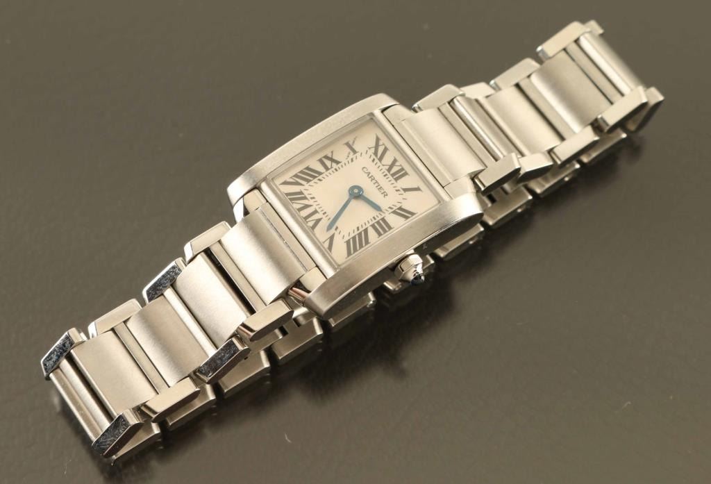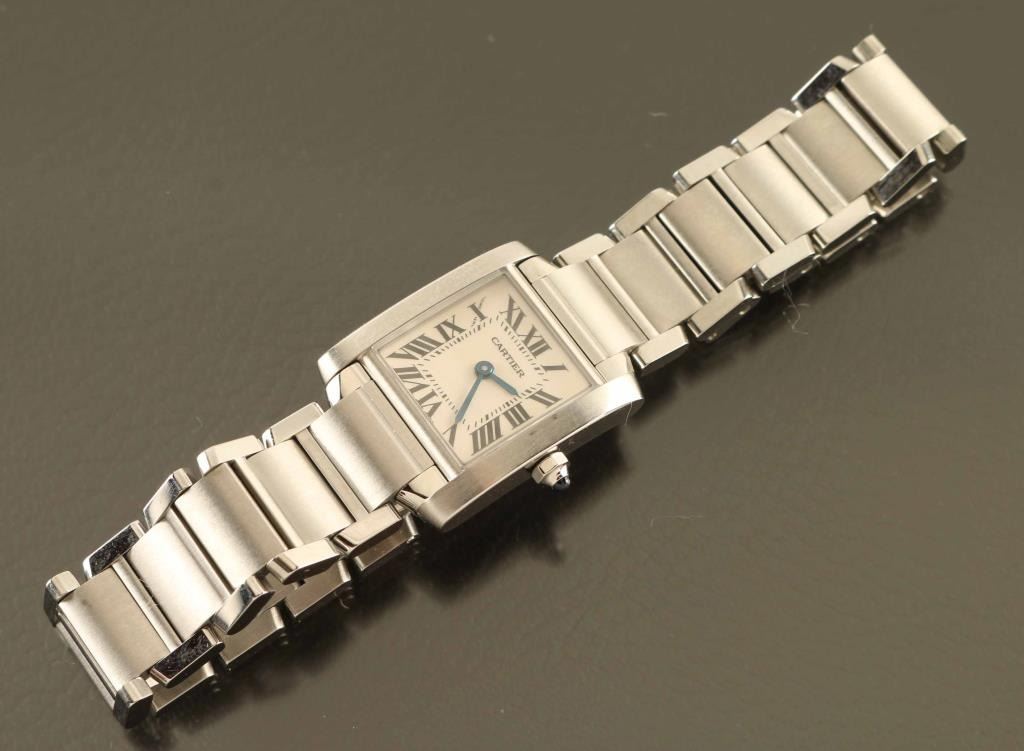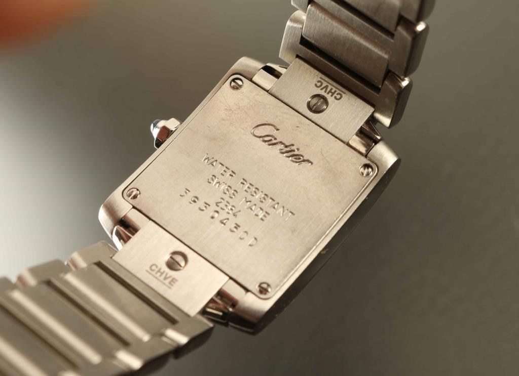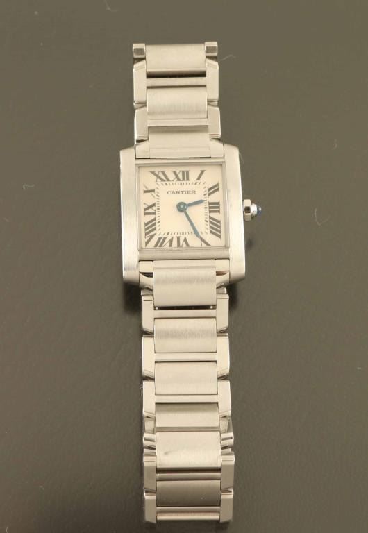 Small model, quartz movement, stainless steel. Marked Cartier water resistant 2384 393045CD on back. Band , steel octagonal crown set with a synthetic cabochon-shaped spinel, silver-grained dial, blued-steel sword-shaped hands, sapphire crystal, steel bracelet.