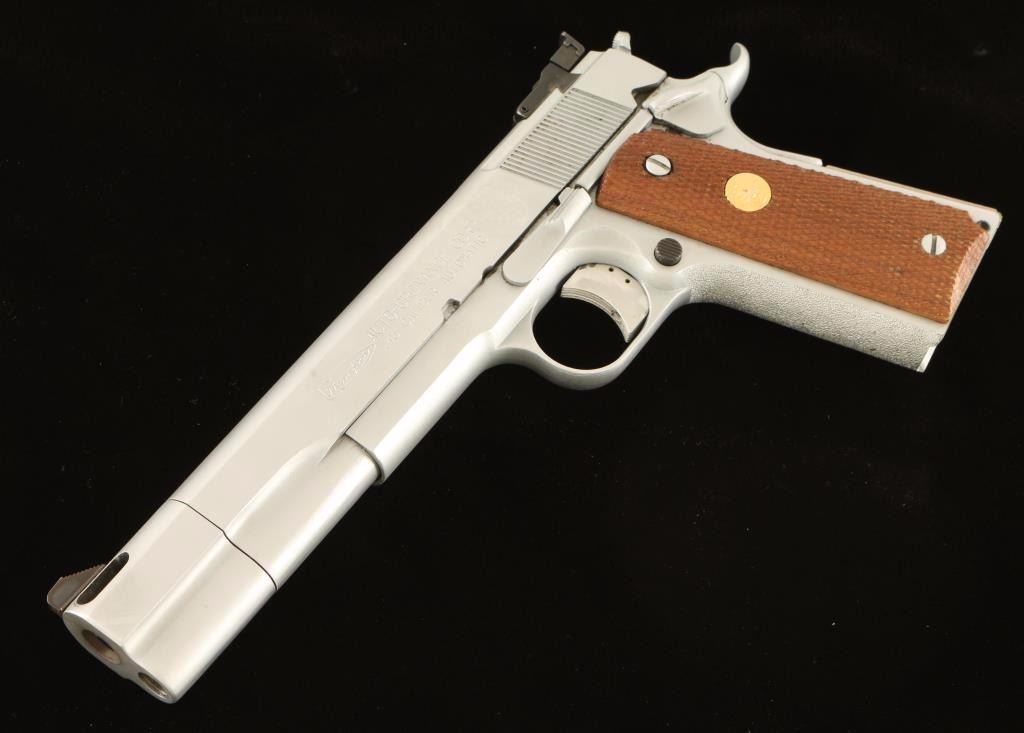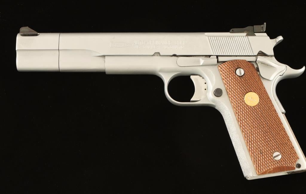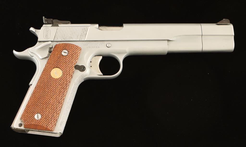 Single action semi-automatic pistol customized by Carson City, NV gunsmith Terry Tussey. Features a satin silver finish, 5.5" barrel, compensator with ramp front sight, Millet adjustable rear sight, serrated adjustable trigger, checkered hammer spur, ambidextrous thumb safety, beavertail grip safety, push button magazine release, no magazine, stippled front strap, checkered straight mainspring housing, and two-piece checkered wood grips with gold Colt Medallions. Pistol exhibits a few minor bright scuffs with no major wear observed. The front sight slot has been filled. Action is very smooth, bore is pristine and wood grips are near fine with some semi-worn points. Condition is excellent as customized. ***Modern Firearm***