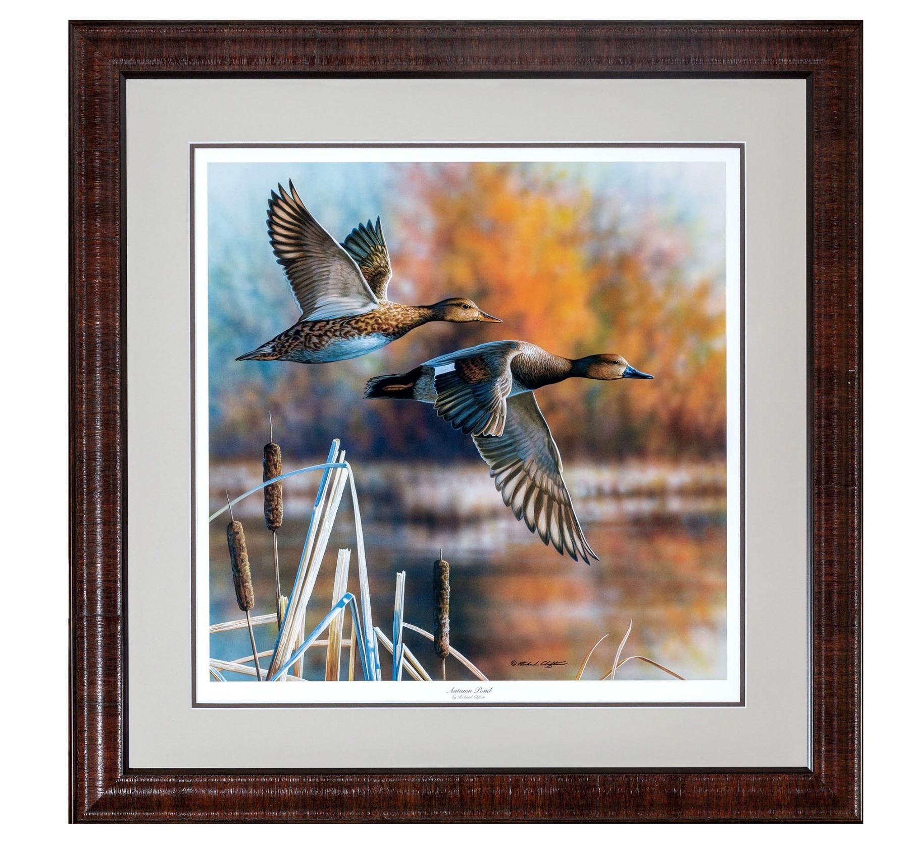 Richard Clifton is one of the country’s most notable waterfowl artists with numerous state duck stamp competition wins. In Autumn Pond, the fall colors make a magnificent backdrop for a pair of gadwalls.