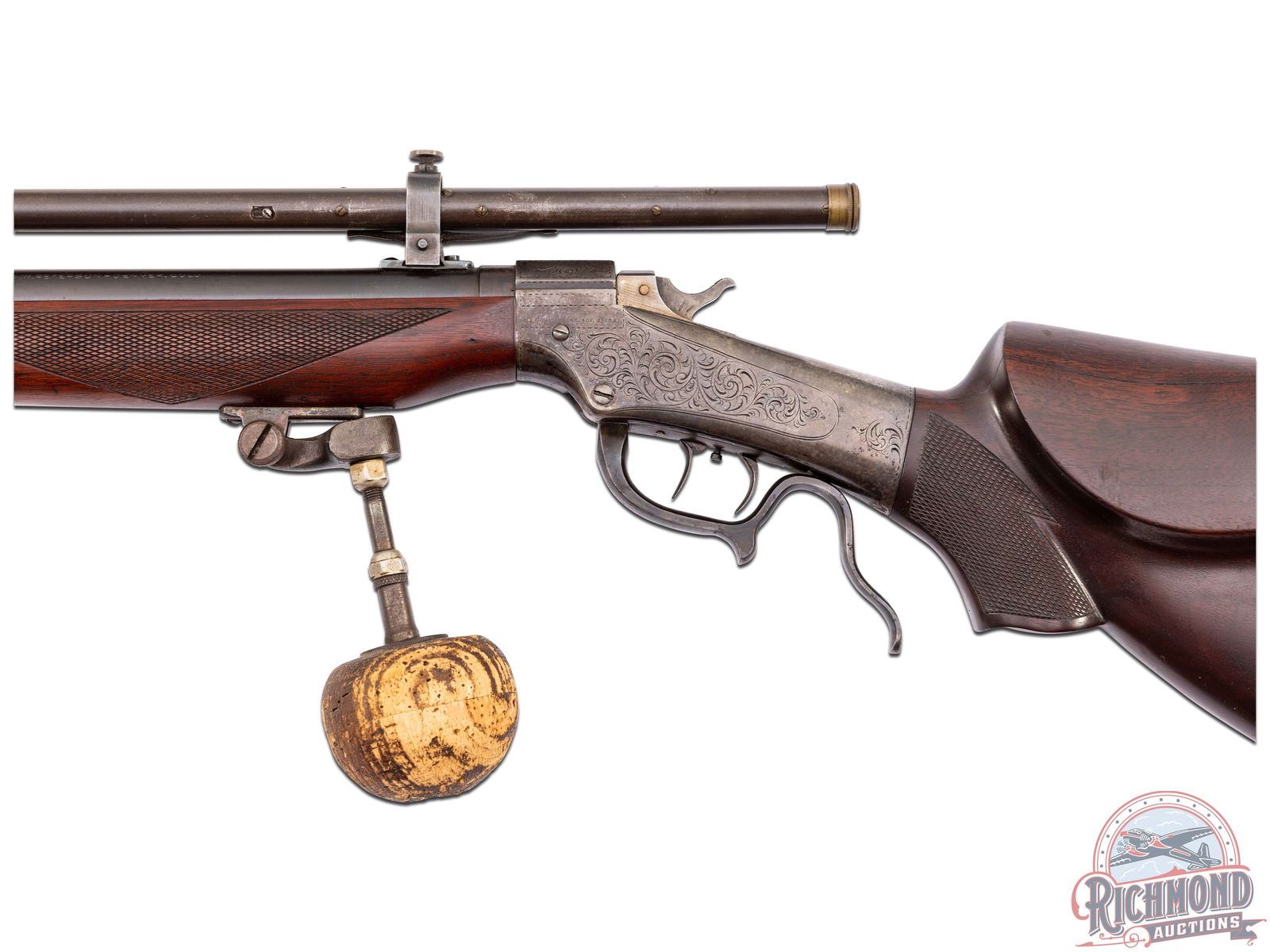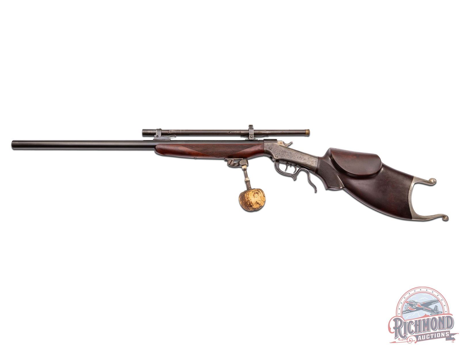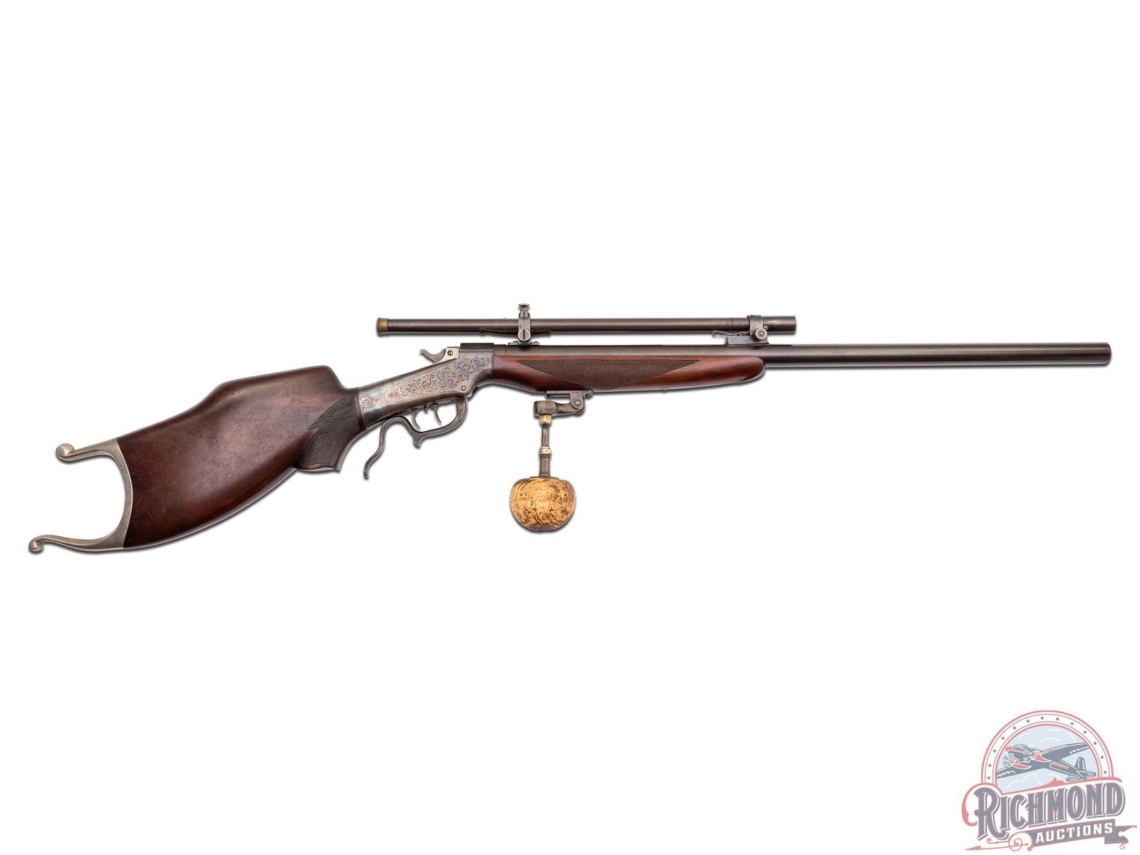 This rifle belonged to Axel Peterson, one of the premiere shooters and gunmakers of the Schuetzen age. Rifle was originally built by Ballard and according to accompanying letters from Reed Thompson and John Dutcher. This rifle was most likely re-barreled by Peterson's Master, George Schoyen, to a larger caliber then was re-barreled sometime by Peterson to 22 Long Rifle caliber. Rifle has a 28" blued sightless round barrel stamped "A. W. Peterson Denver, Colo.", in 22 Long Rifle caliber and is fitted with an A.W. Peterson 5x scope with crosshair reticle in his mounts. Case-hardened action is a Marlin/Ballard Union Hill No. 9 engraved in Nimsche floral style with Schoyen double set triggers and modified single spur lever. Stock is walnut and according to Ballard book was done by Schoyen's stock maker, Henry Simmons. The butt stock is a checkered Perch-belly Schuetzen stock with Schuetzen cheekpiece and is fitted with a nickel plated Helm butt plate. Matching walnut checkered Perch-belly splinter Schnabel forend fitted with folding palm rest with cork knob. This rifle is pictured on page 357 of John T. Dutcher's book, "Ballard The Great American Single Shot Rifle" with Axel Peterson holding it. Accompanying this rifle are letters of provenance from John T. Dutcher and Reed Thompson. It is a great historical single shot rifle. J.T. Livengood Collection. CALIBER: 22 LR. S/N: 7382. FFL STATUS: Antique.