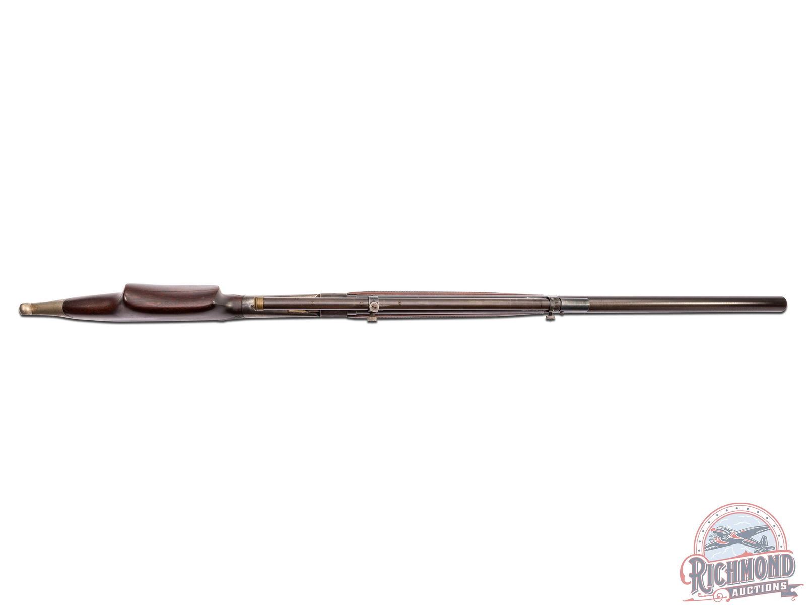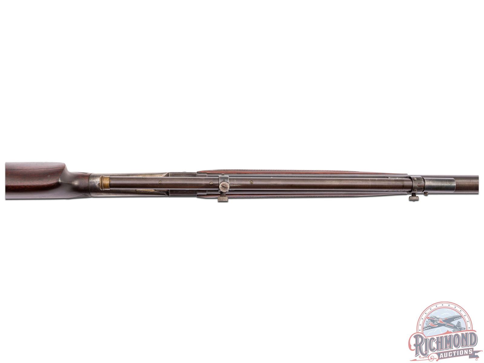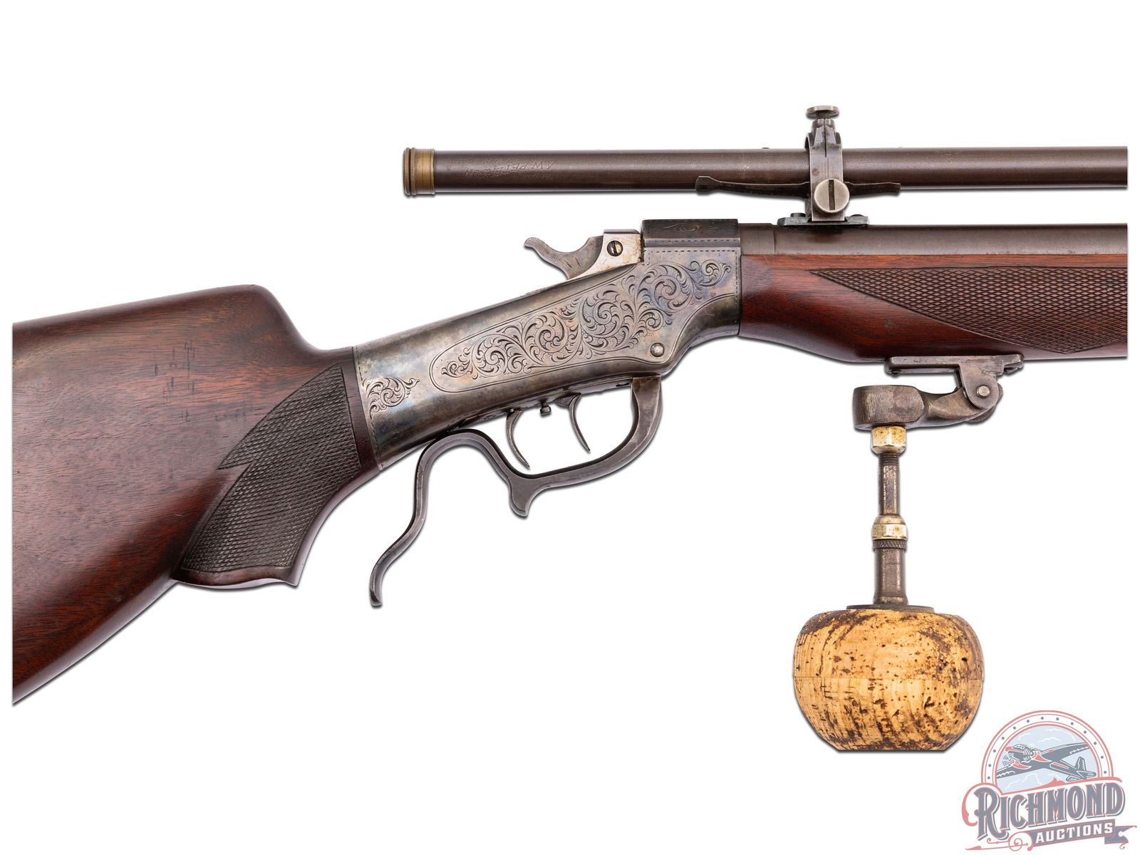 This rifle belonged to Axel Peterson, one of the premiere shooters and gunmakers of the Schuetzen age. Rifle was originally built by Ballard and according to accompanying letters from Reed Thompson and John Dutcher. This rifle was most likely re-barreled by Peterson's Master, George Schoyen, to a larger caliber then was re-barreled sometime by Peterson to 22 Long Rifle caliber. Rifle has a 28" blued sightless round barrel stamped "A. W. Peterson Denver, Colo.", in 22 Long Rifle caliber and is fitted with an A.W. Peterson 5x scope with crosshair reticle in his mounts. Case-hardened action is a Marlin/Ballard Union Hill No. 9 engraved in Nimsche floral style with Schoyen double set triggers and modified single spur lever. Stock is walnut and according to Ballard book was done by Schoyen's stock maker, Henry Simmons. The butt stock is a checkered Perch-belly Schuetzen stock with Schuetzen cheekpiece and is fitted with a nickel plated Helm butt plate. Matching walnut checkered Perch-belly splinter Schnabel forend fitted with folding palm rest with cork knob. This rifle is pictured on page 357 of John T. Dutcher's book, "Ballard The Great American Single Shot Rifle" with Axel Peterson holding it. Accompanying this rifle are letters of provenance from John T. Dutcher and Reed Thompson. It is a great historical single shot rifle. J.T. Livengood Collection. CALIBER: 22 LR. S/N: 7382. FFL STATUS: Antique.