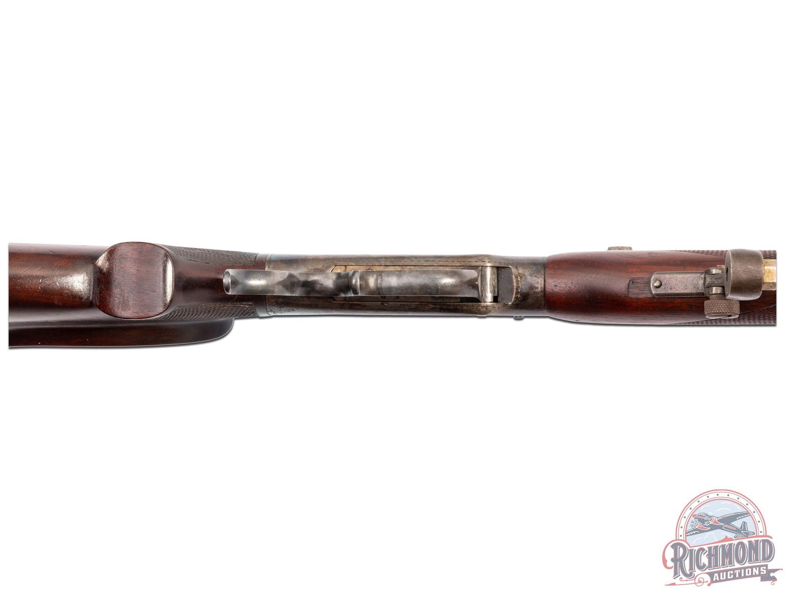 90% fading barrel blue with handling marks. Action exhibits 90% fading case colors with sharp engraving. Stock has crack in cheekpiece with traces of original finish. Good bore with crisp mechanics.
