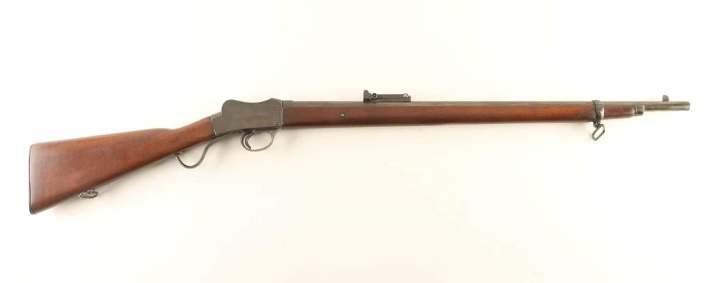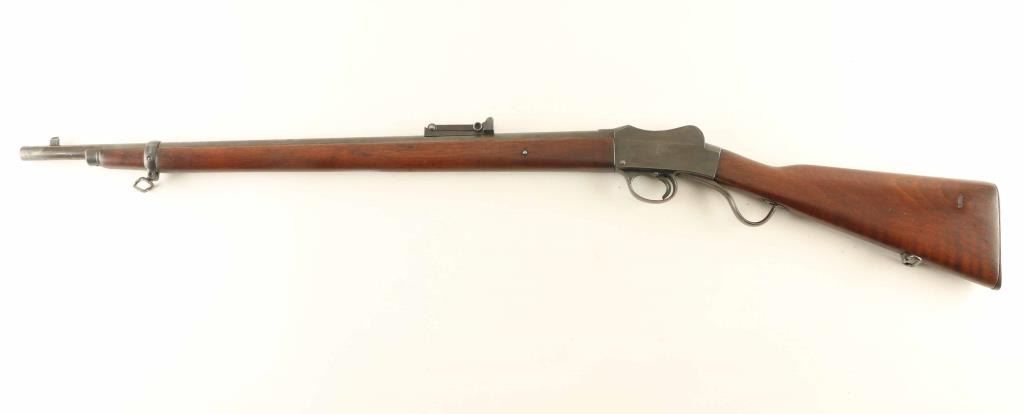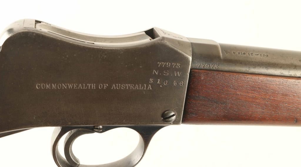 British single shot military rifle made for training use in Australia. Features 25" barrel, flip-up ladder type adjustable rear sight with protective ears, two piece stock with straight grip, falling block lever action, cocking indicator, sling swivels. Bore is very good or better condition, bright with crisp rifling. Metal retains 90% coverage of a brownish colored finish, mottled darker spots along barrel, shows as brighter bluing on sides of trigger guard, with bare metal at sharp edges, small shallow pits on receiver sides. Wood is very good condition with scratches and dents from use. Stock is a bit loose on receiver. Markings include Kangaroo image on top of receiver, "NSW" and "COMMONWEALTH OF AUSTRALIA" on receiver right, "MADE BY THE BIRMINGHAM SMALL ARMS CO LTD" on receiver left, with stacked rifle logo. Condition is NRA Very Good *** C&R Firearm ***