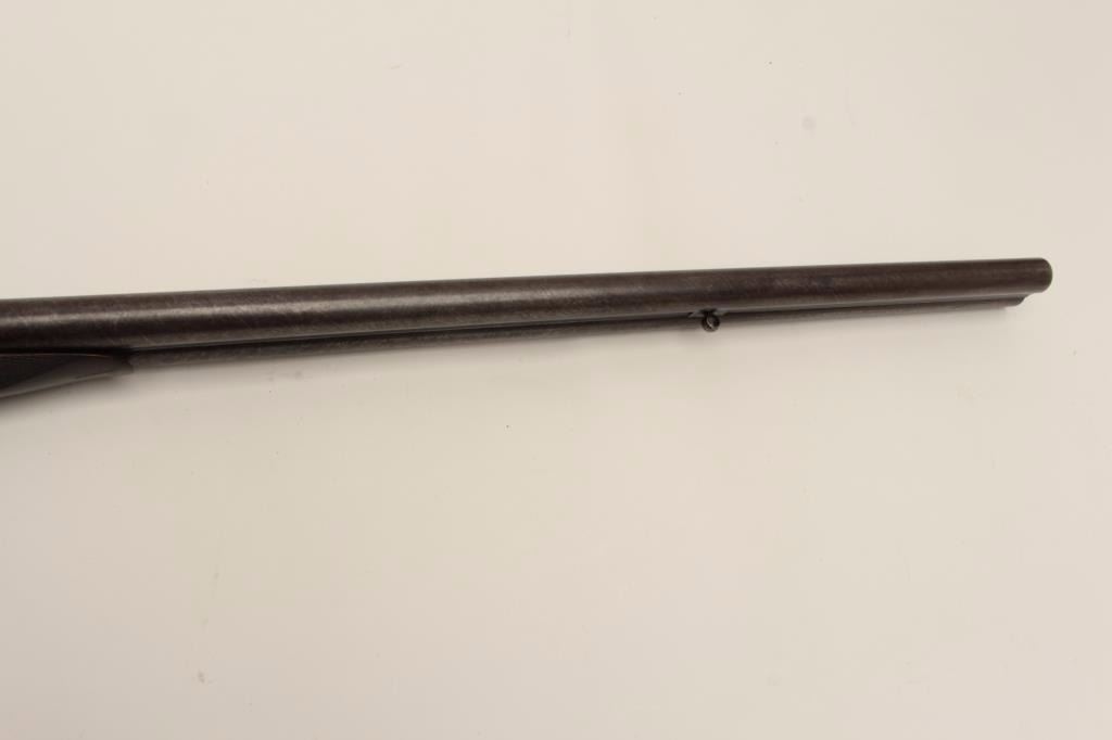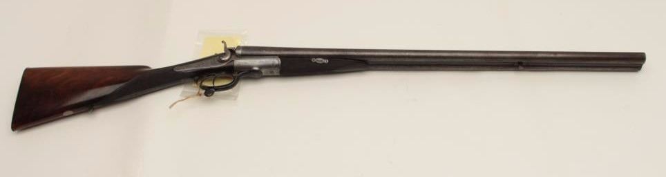 B. Woodward and Sons, London made 12GA full rifled big game black powder SxS, S/N 6129 with 30” barrels, raised rib and showing two leaf folding sights. Exposed hammer with under lever action. Very good and brightbores, crisp action and nicely engraved. Damascus barrels with polished locks to gray metal. Good wood and very good overall. Classic double from English colonial era. Exclusively intended for big game in Indiaand Africa. Premium London maker. (Antique) Est.: $6,000-$12,000