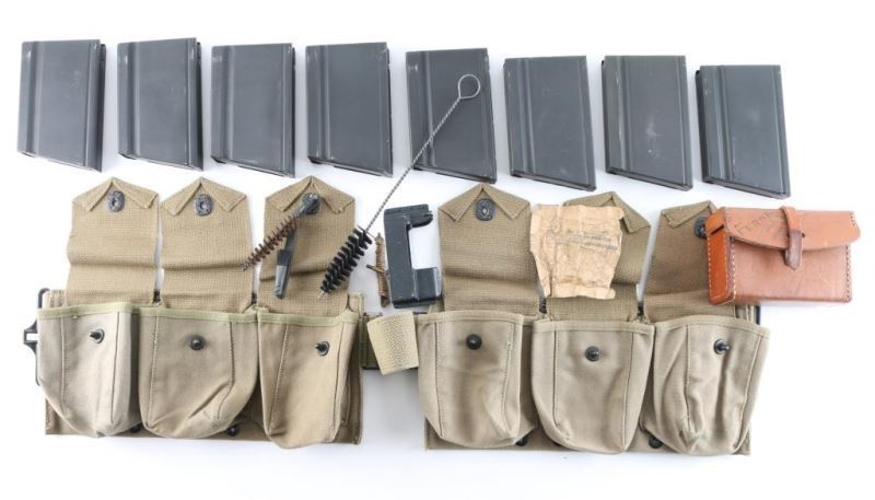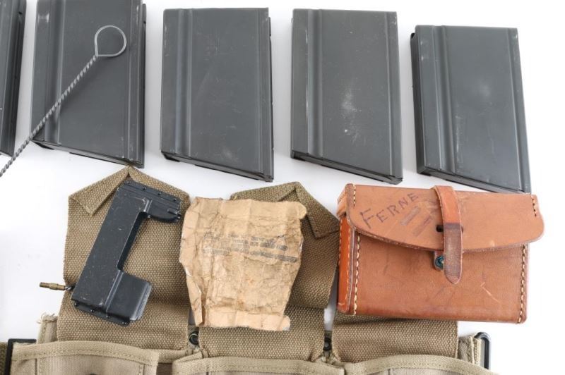 Boyt ammo belt and tools including 8 mags, Mag filler, Spare parts case which is leather, combo tool, gas cylinder, cleaning tool, fabric container large and small, brush for cleaning small arms, brush set, thong cleaner, bore brush WWII, ruptured case extractor, packet of patens WWII.