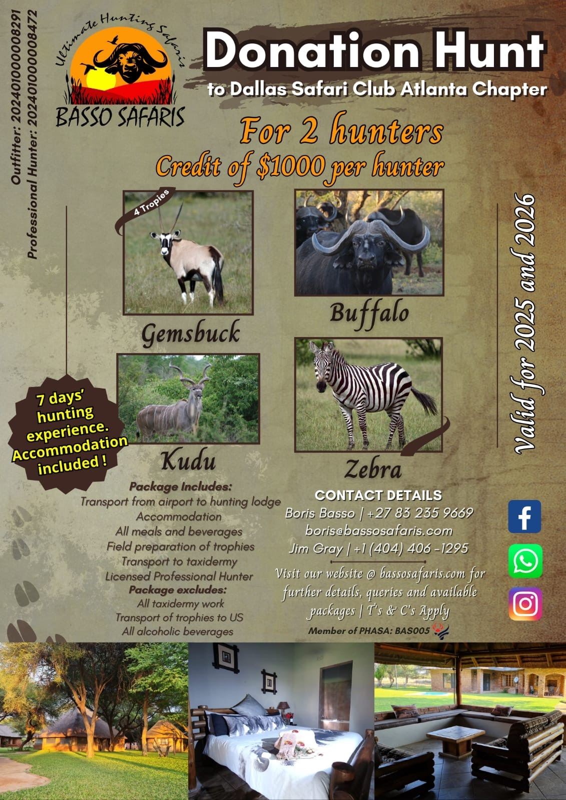 Basso Safaris is offering a $1,000 credit per hunter for 2 hunters for trophy fees of 4 South African Species. Buffalo, Gemsbuck, Kudu and Zebra. Join Borris Basso and his team for a 7-day hunting experience. This hunt may be upgraded to include other species as per the current price list as well as Bird hunting. Bowhunters are not a problem, we can accommodate. This hunt may be taken in 2025 or 2026.