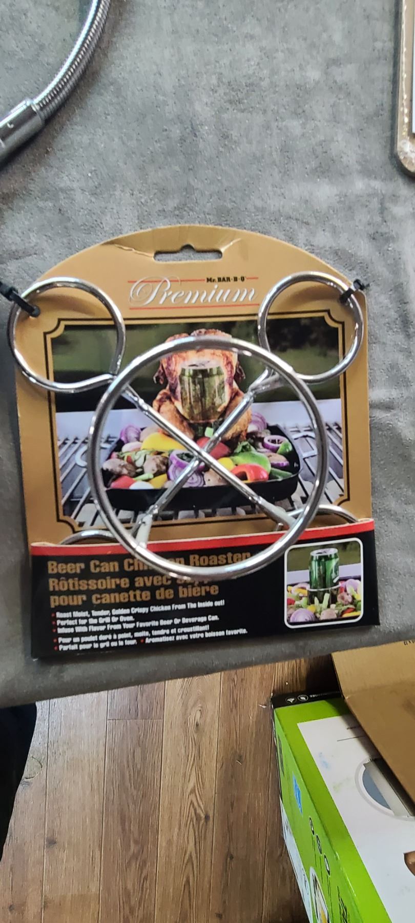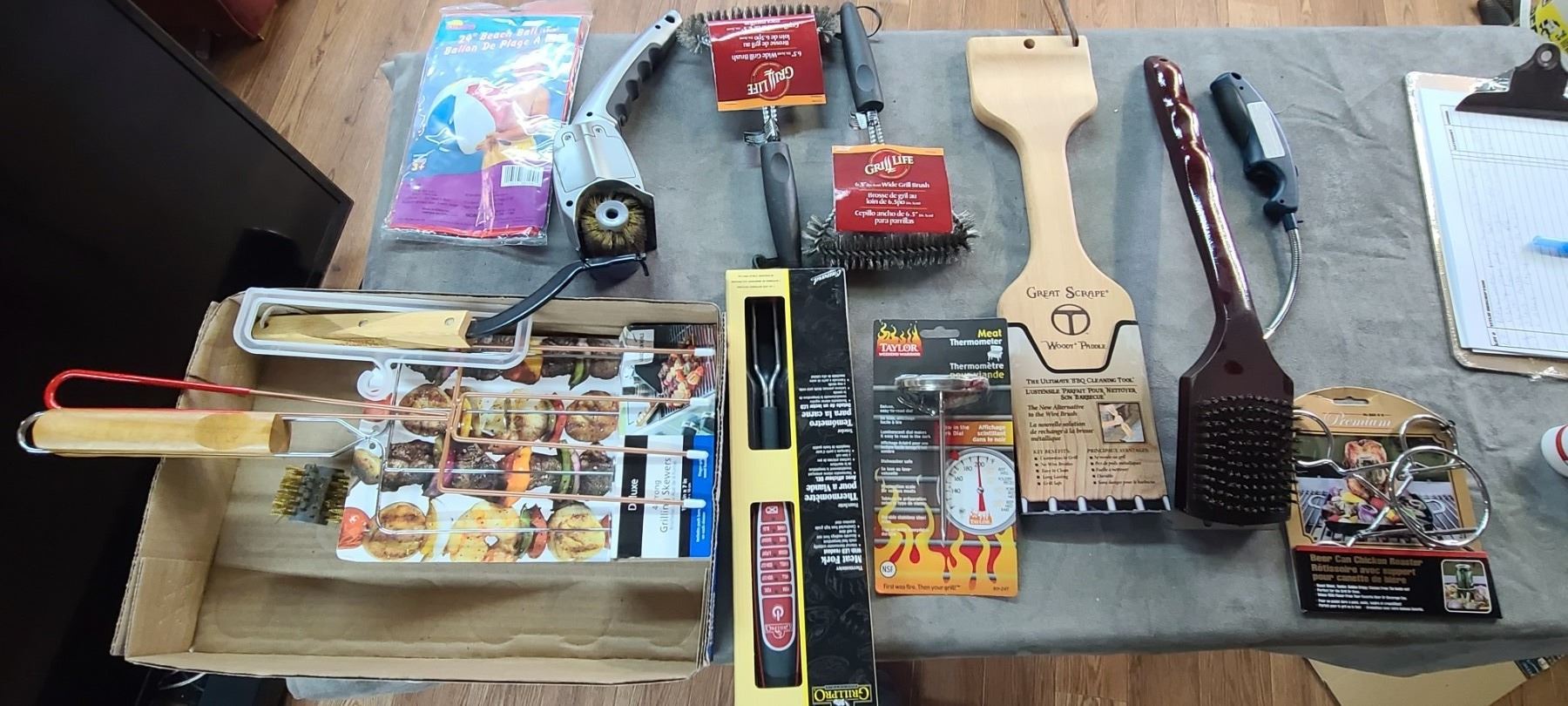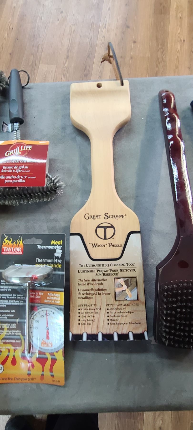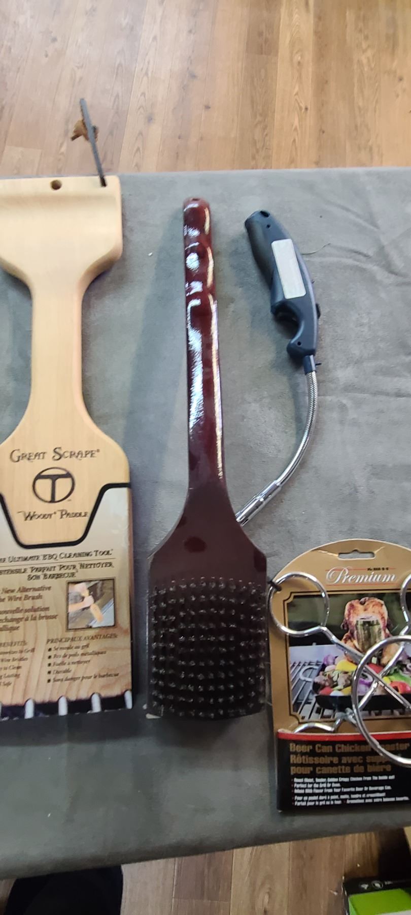 BBQERS LOT: BRUSHERS, DIGITAL THERMOMETER, BEER CAN ROTISSAIRE