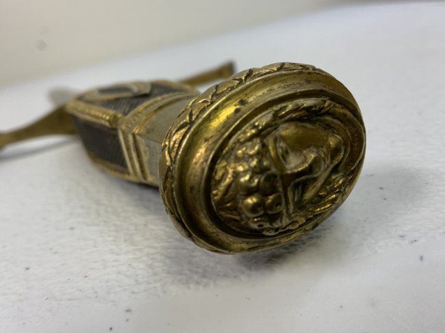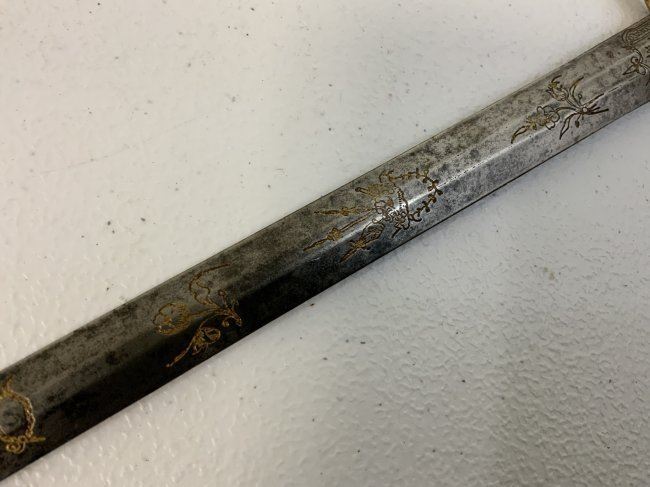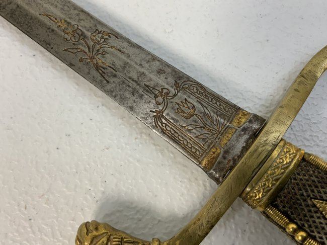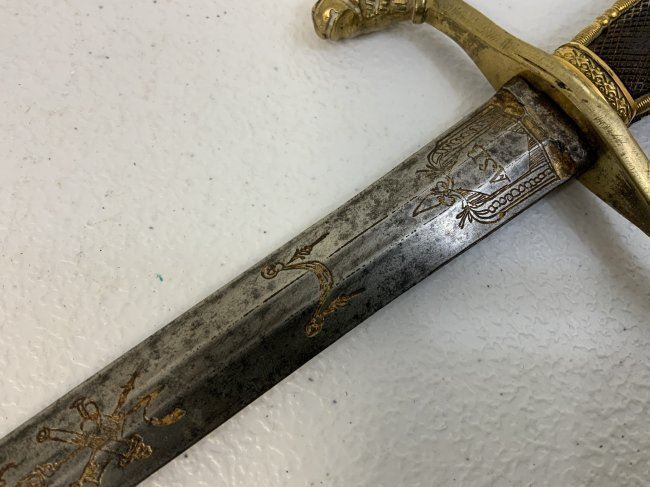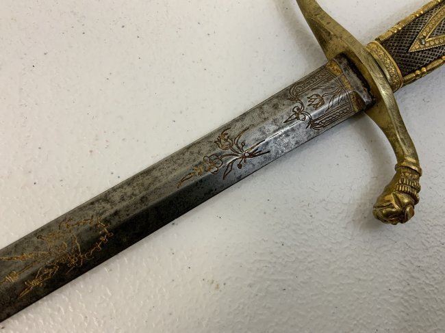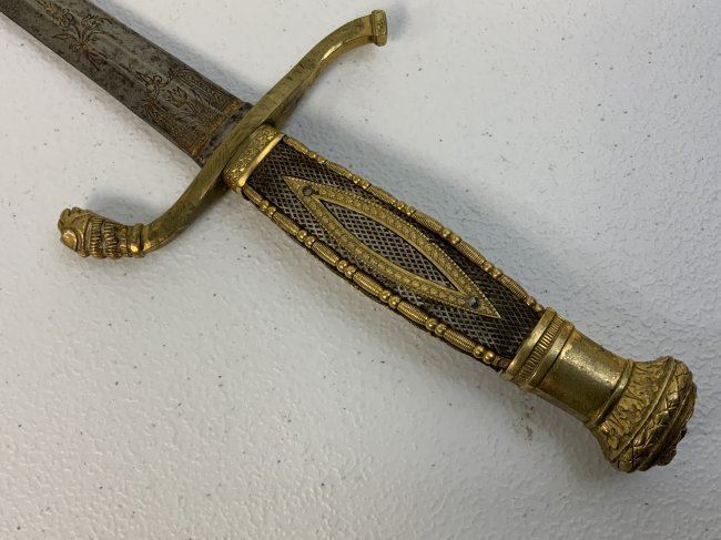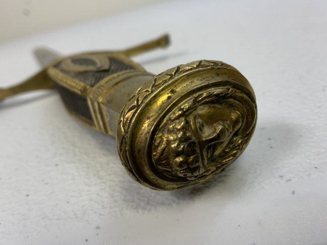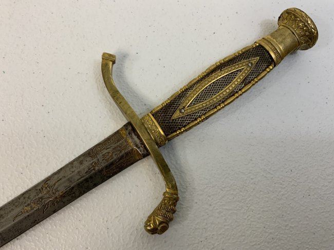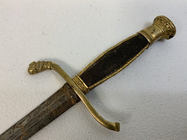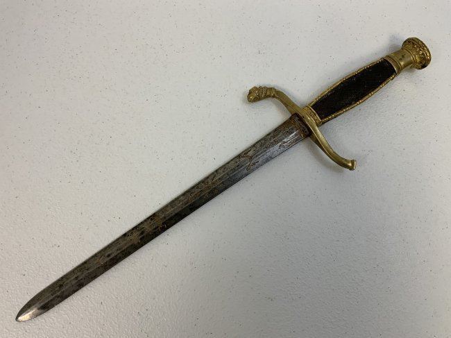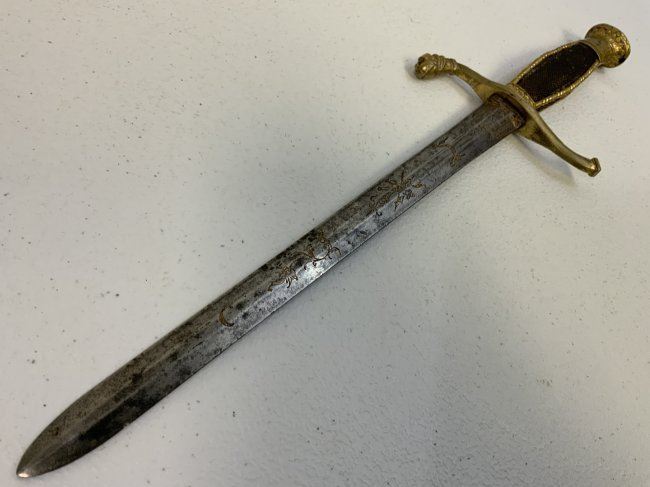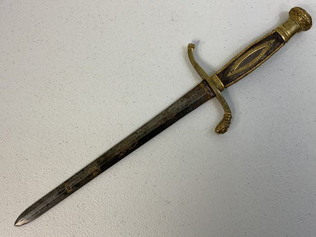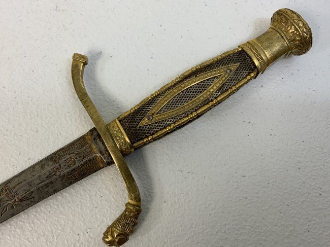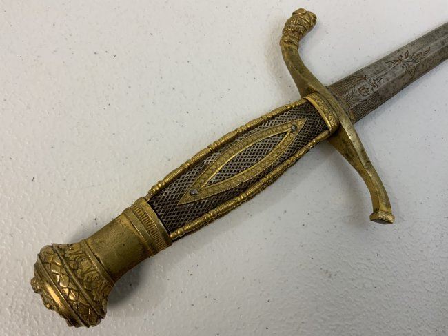 BEAUTIFUL ANTIQUE FRENCH DAGGER MADE FROM NAPOLEONIC GENERAL SWORD . GILDED BRASS HILT FITTINGS NICELY DECORATED . ENGRAVED BLADE WITH GILDED DETAILS. ORIGINALLY NAPOLEONIC GENERAL SWORD . POSSIBLE SURRENDER BROKEN BLADE AND MADE LATER INTO NICE DAGGER . BLADE HAS "ASB" ENGRAVED , INITIALS OR MAKER MARK. BEAUTIFUL DAGGER TO DISPLAY . 16" LONG WITH 10" LONG BLADE.