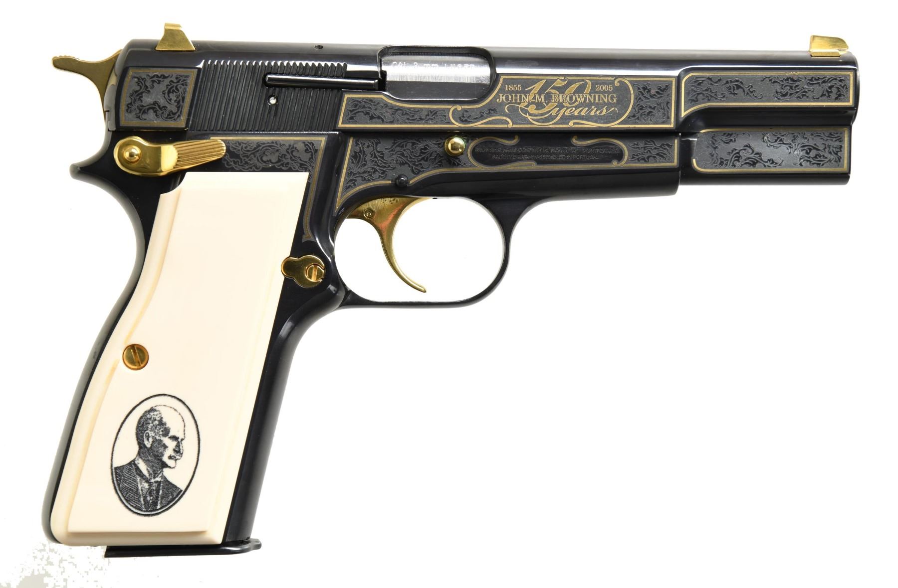 YEAR COMMEMORATIVE HI-POWER SEMI-AUTOMATIC PISTOL WITH MATCHING FACTORY HARD CASE. Cal. 9x19mm. S# 511MV50723. Bbl. 4 5/8". Beautiful Hi-Power semi-automatic pistol, mfg. in Belgium and imported/retailed by Browning Arms Company, commemorating John Moses Browning's 150th birthday. The sides of the slide and frame exhibit foliate motifs on a matte black background within gold-lined borders. Left side of the slide is marked with "John M. Browning" in cursive and the Browning logo, with the right side exhibiting "1855" and "2005" above a 150/ years" and "JOHN. M. BROWNING". Right side of the frame is marked "BROWNING ARMS COMPANY MORGAN, UTAH MONTREAL P.Q./ MADE IN BELGIUM ASSEMBLED IN PORTUGAL". Frame and slide exhibit a lustrous dark blue finish, with the aforementioned matte bluing present at engraved areas. Small parts, including the trigger, mag. release button, slide release lever, slide safety, hammer, iron sights, and grip screws, exhibit a gold-plated finish. Bbl. is polished in-the-white. Frame is mounted with 2-piece smooth faux ivory grips, which are embellished with a portrait of John Browning at the bottom of either panel. Slide is matching to the frame via "723" on the interior. MAGS: two 13-rd. UNATTACHED ACCESSORIES: matching factory hard case containing factory paperwork. CONDITION: extremely fine, with metal components retaining bountiful amounts of their original factory finishes, save for what appears to be either some extremely light losses or diminutive spots of cleaned oxidation that are present on the gold borders of the slide. Mirror bore, exhibiting some grease while retaining well-defined rifling throughout. Grips are excellent overall. (24-5931/MLW). MODERN. $2,000-3,000.