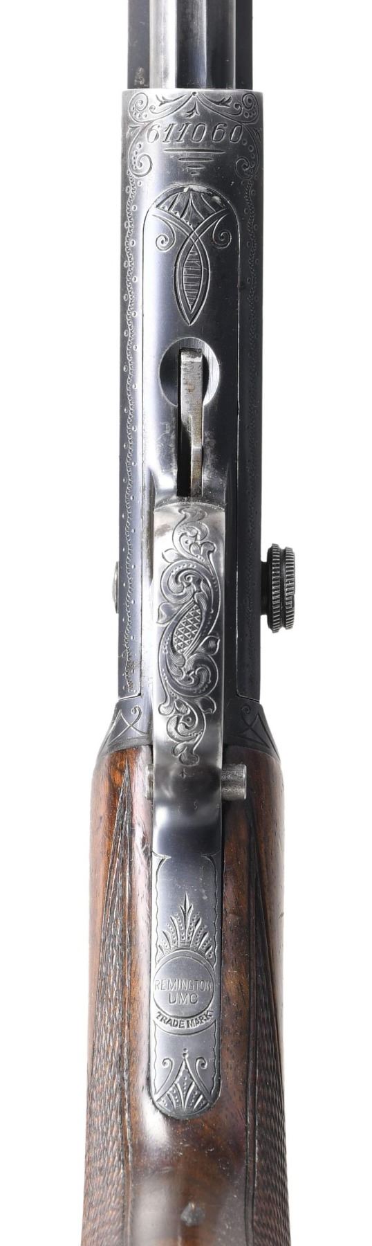GRADE SLIDE ACTION RIFLE. Cal. 22 Rem Spec. S# 611060. Bbl. 24" octagon. Combination tang sight, Marbles folding leaf rear sight & Lyman tang sight. Action has F grade hand engraving featuring a squirrel on right side w/ 2 rabbits on left side. Scenes are surrounded by arabesque scroll w/ straight line & fancy borders that continue to upper & lower action areas. Breech end of bbl. has borderline engraving. Forearm & hard rubber capped pistol gripped stock w/ crescent steel buttplate & hand checkering. Mfg. 1923. CONDITION: over 80% lightly faded blue showing slide & carry wear. Wood finish shows areas of wear w/ light scratches & marks. Bore retains lightly worn rifling. PROVENANCE: The estate collection of Don "Duck" Combs. (24-2415/DS). CURIO. $6,000-8,000.