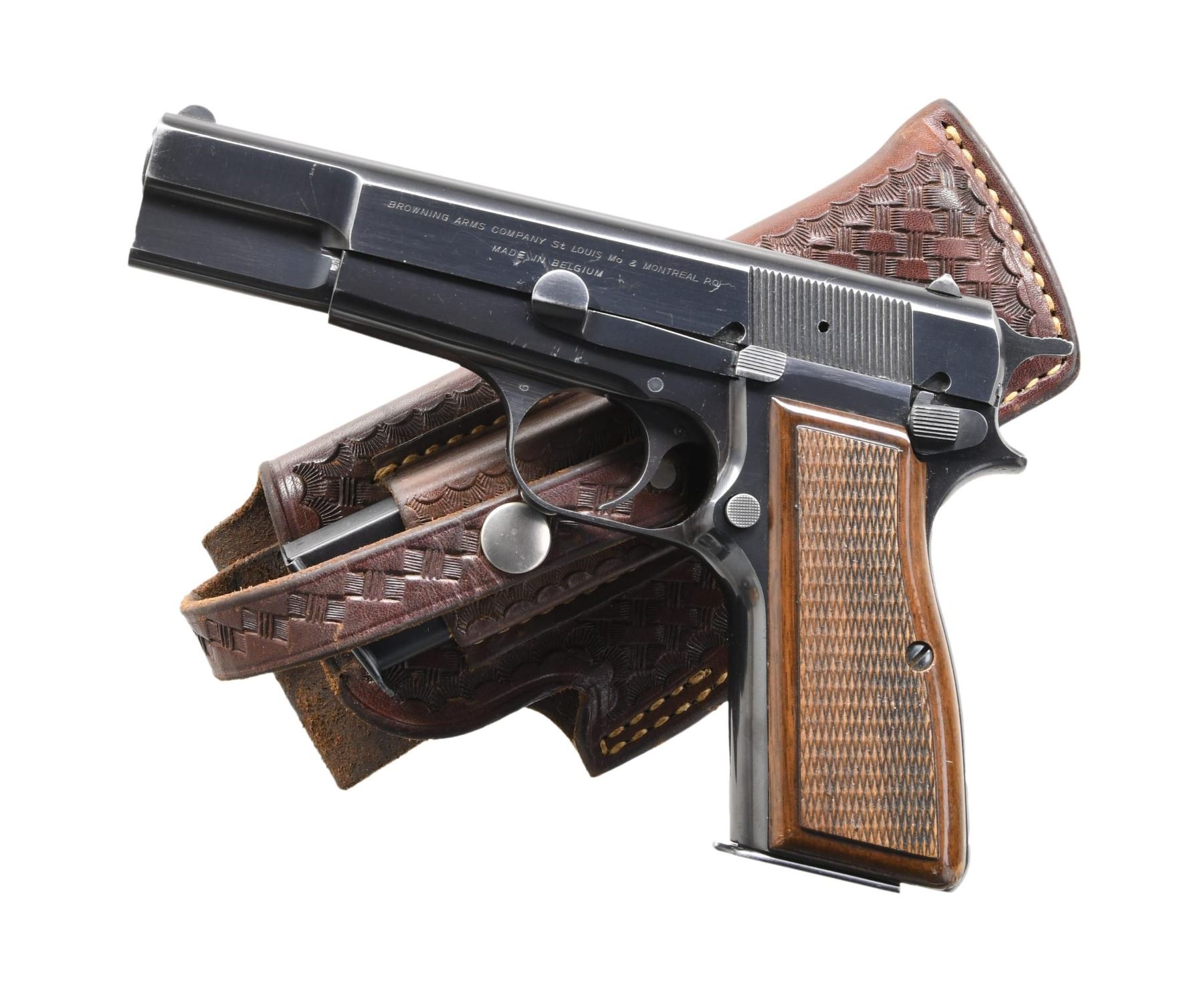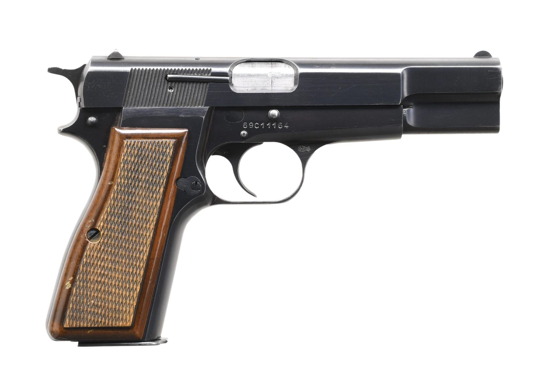 Cal. 9x19mm. S# 69C11164. Bbl. 4 3/4". Hi-Power semi-automatic pistol, mfg. in Belgium and imported/retailed by Browning Arms Company in 1969. Left side of the slide is marked with Browning's importer information above "MADE IN BELGIUM". Right side of chamber and frame exhibit Belgian commercial proofs. Metal components exhibit a blue finish overall, save for on the bbl., which is polished in-the-white. Frame is mounted with 2-piece checkered wood grips, which feature red moisture barrier paint on their interiors. Half-moon blade front sight, with U-notch rear sight. MAGS: two 13-rd. UNATTACHED ACCESSORIES: Triple K brown leather holster. CONDITION: very good, with metal components retaining the majority of their original factory finish, exhibiting some edge wear and some scattered handling marks overall. Very bright bore, exhibiting light to mild pitting while retaining well-defined rifling throughout. Grips show some scattered marks from handling and storage but otherwise remain sturdy and serviceable. Holster shows some wear but otherwise remains sturdy and serviceable. (24-5357/MLW). CURIO. $900-1,400.