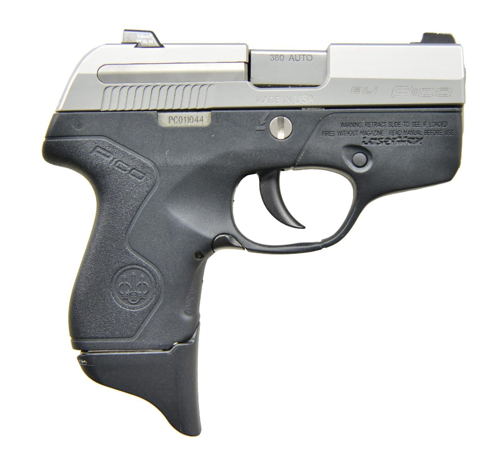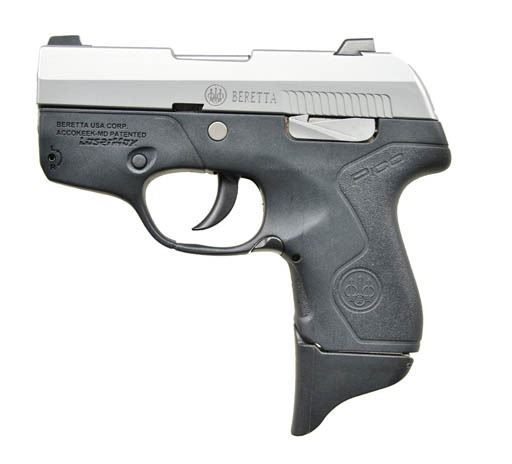 Cal. .380 ACP. S# PC011044. Bbl. 2.75". A tiny, thin, lightweight .380 backup pistol designed for concealed carry & home defense. Double action only. Shrouded hammer. Serrated stainless steel slide, w/ Trijicon 3-dot night sights. LaserMax polymer grip frame w/ integrated laser sight. Left side controls. Mag release below trigger guard. MAGS:4 steel 6 rd. UNATTACHED ACCESSORIES: Beretta soft-side wallet. Factory cardboard box, lock & paperwork. Original plastic grip frame w/ custom Kydex neck holster. CONDITION: All outward appearances indicate little actual use. Bright bore w/ sharp rifling. (22-3424/JZ). MODERN. $300-500.