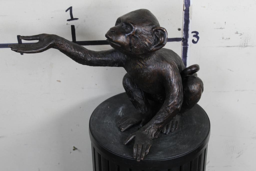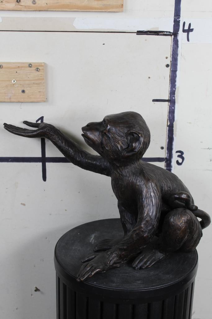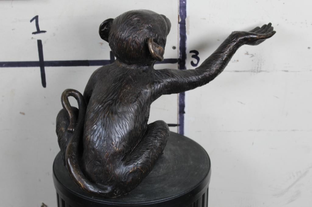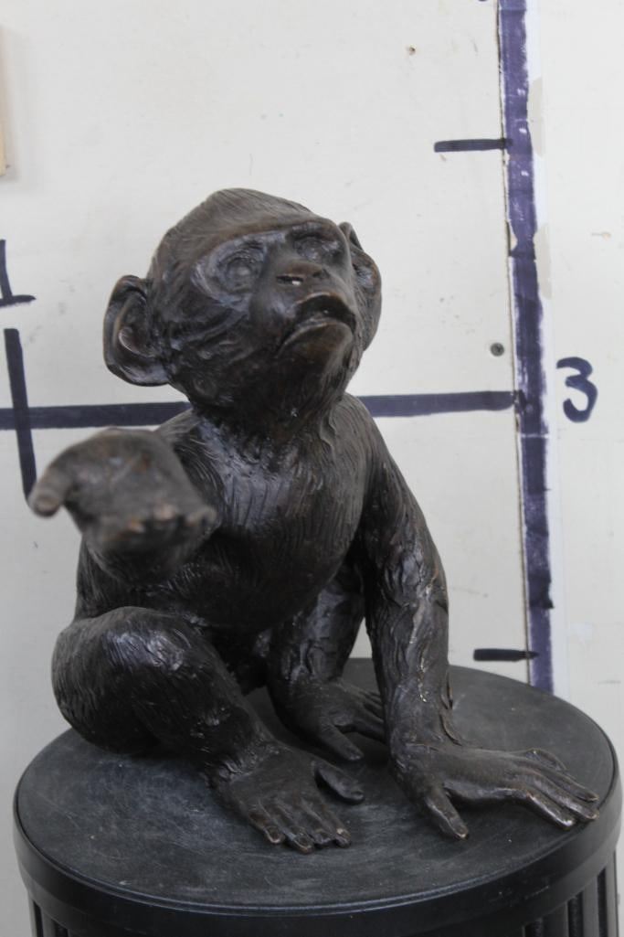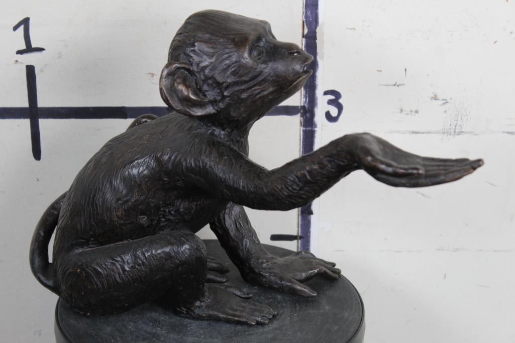 Adorable MONKEY BRONZE Sculpure. He is reaching out his hand. Measures 12.5" Tall x 10.5" Wide x 19" Depth. Total Weight: 11lbs 12oz. COLLECTIBLE ART BRONZE SCULPTURE