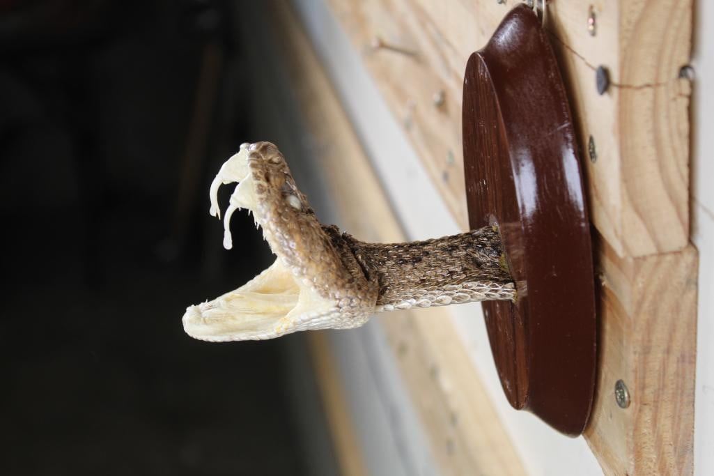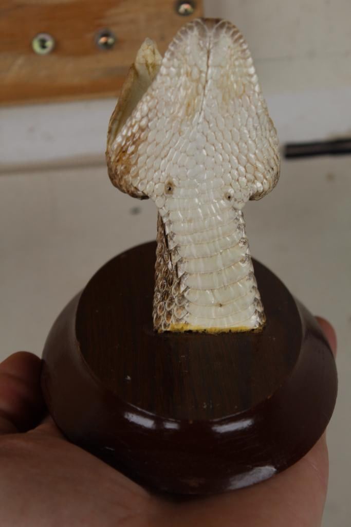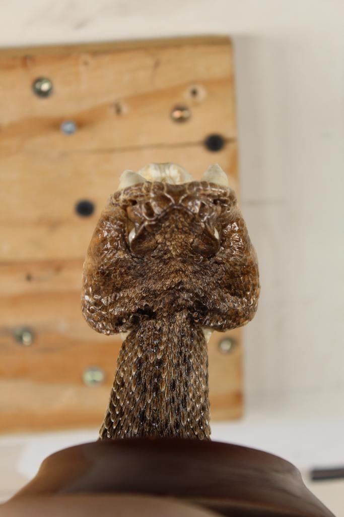 New BIG Mounted Western Diamondback RATTLESNAKE Head or Shoulder Mount with 3 Fangs! Double Fangs on Right. Wooden Plaque measures 6.25"Long x 4.5"Wide with Wall Hanger and 5" Depth. Head measures 2.5"Wide. TAXIDERMY SNAKES