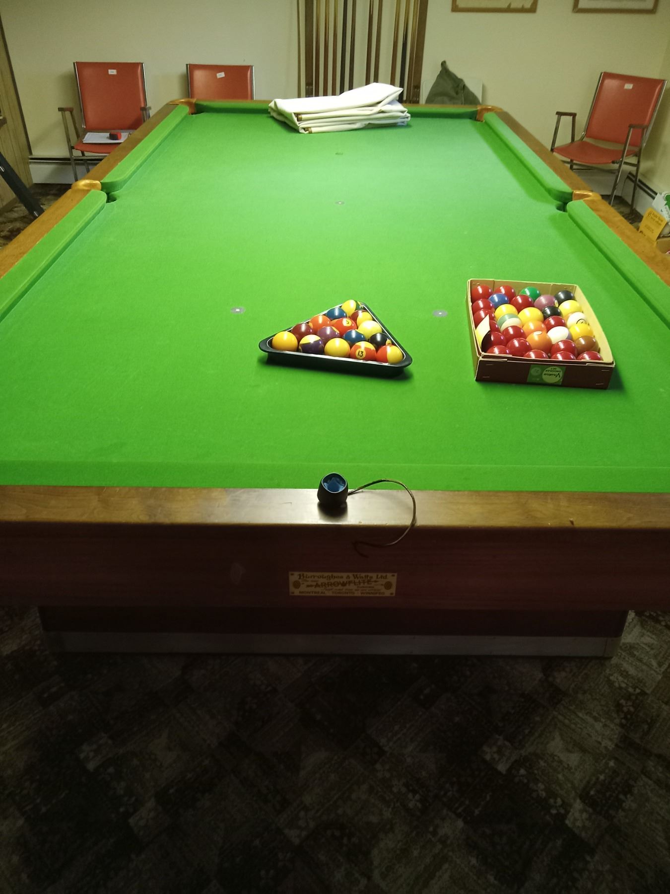 BILLIARDS LOT: 1912 BURROUGHES & WATTS LTD. FROM: HEISLER POOL HALL 124" X 33" ( VERY HEAVY, BUYER MUST REMOVE ITEMS THEMSELVES) LARGE WALL POOL CUES FRAME W/ 10 CUES, 1 X GRANNY STICK, (AKA: MECHANICAL BRIDGE),BALLS, COVER,
