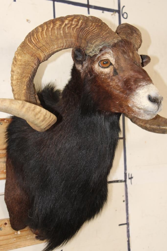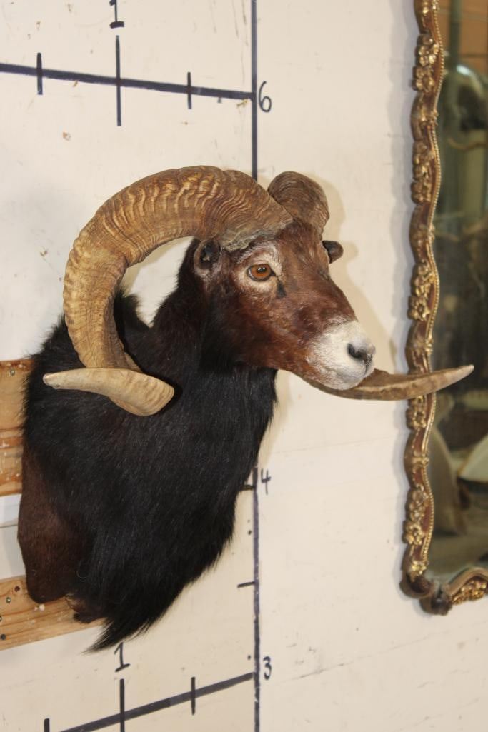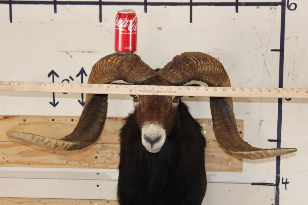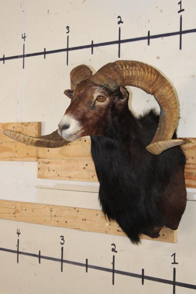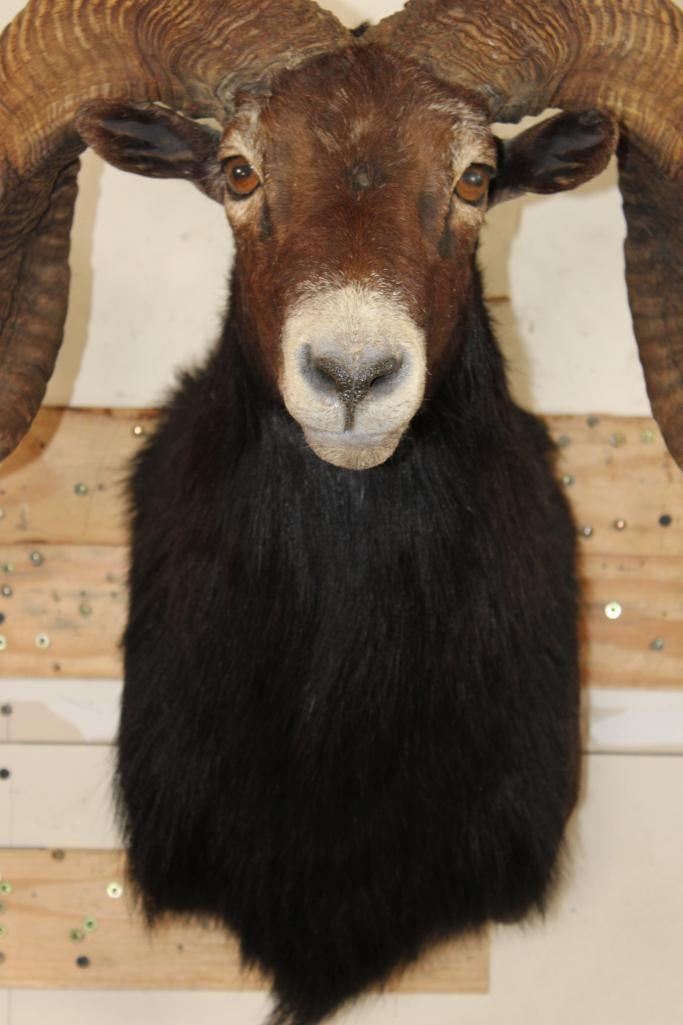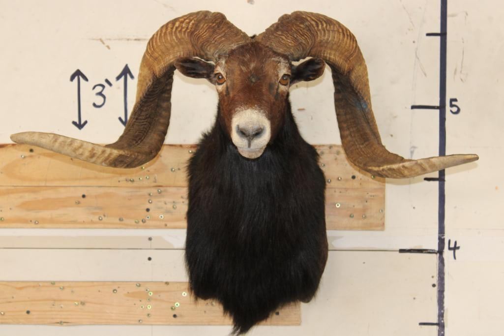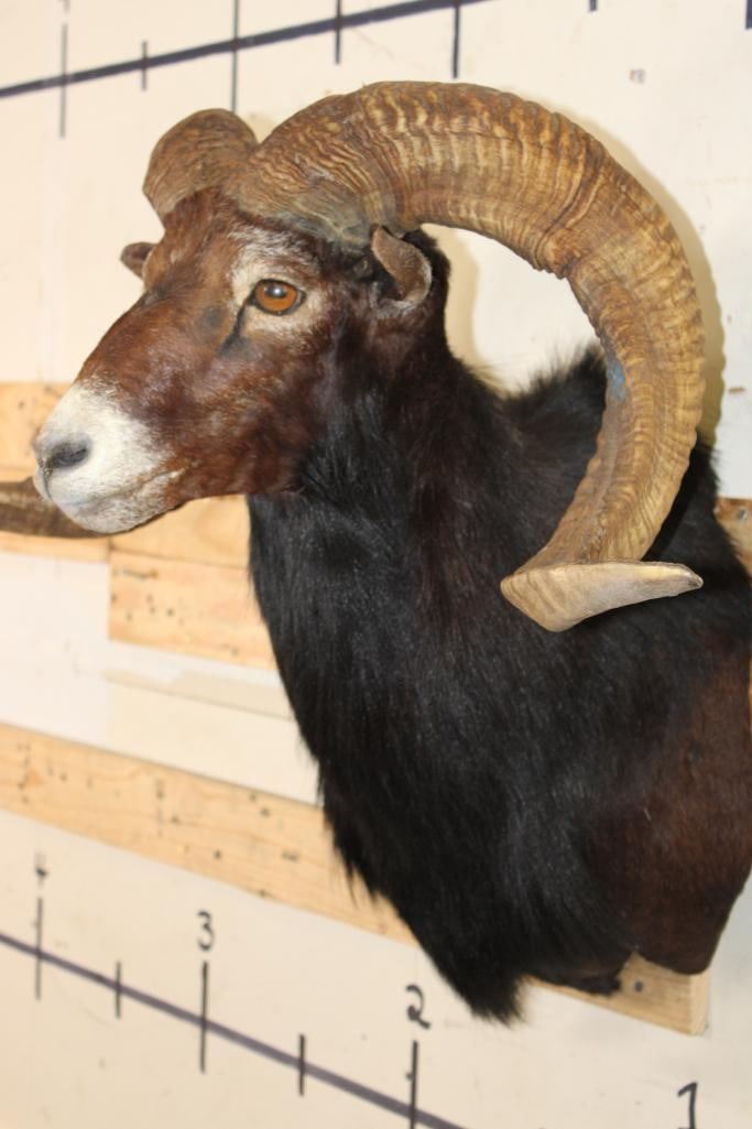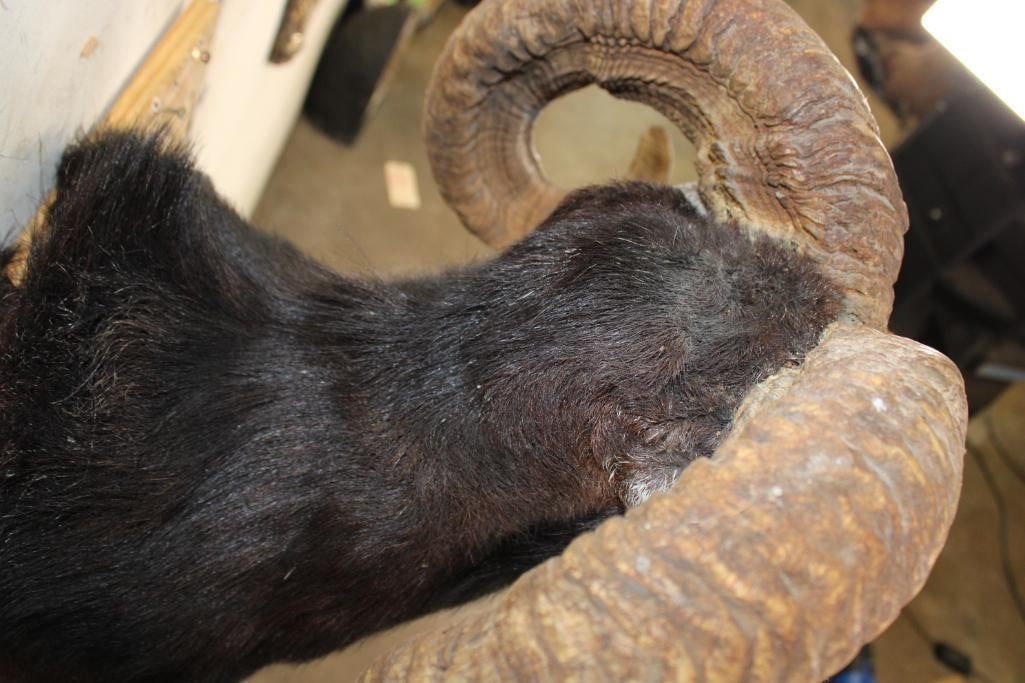 Very Nice Big BLACK HAWAIIAN RAM Shoulder Mount. The Left Horn measures 33.75" Long and the Right Horn measures 35.25" Long. It has a 33 1/8" Spread and is in Good Condition. TAXIDERMY