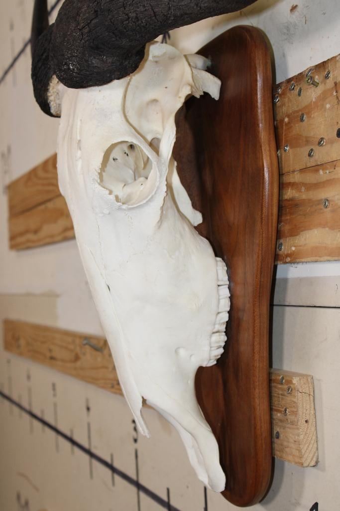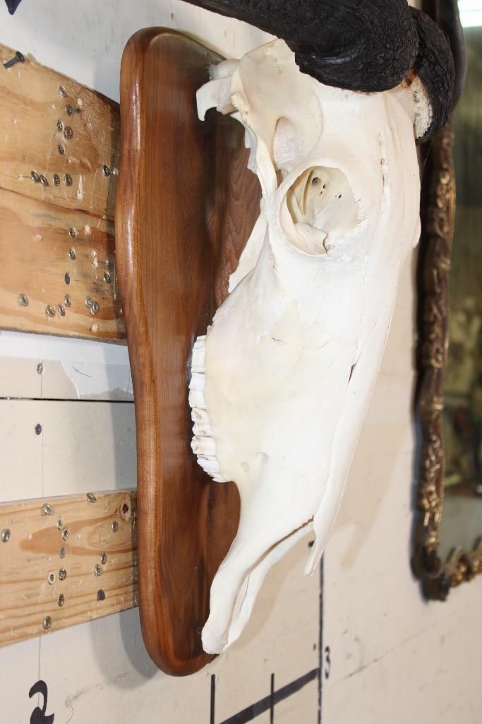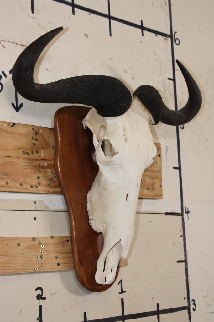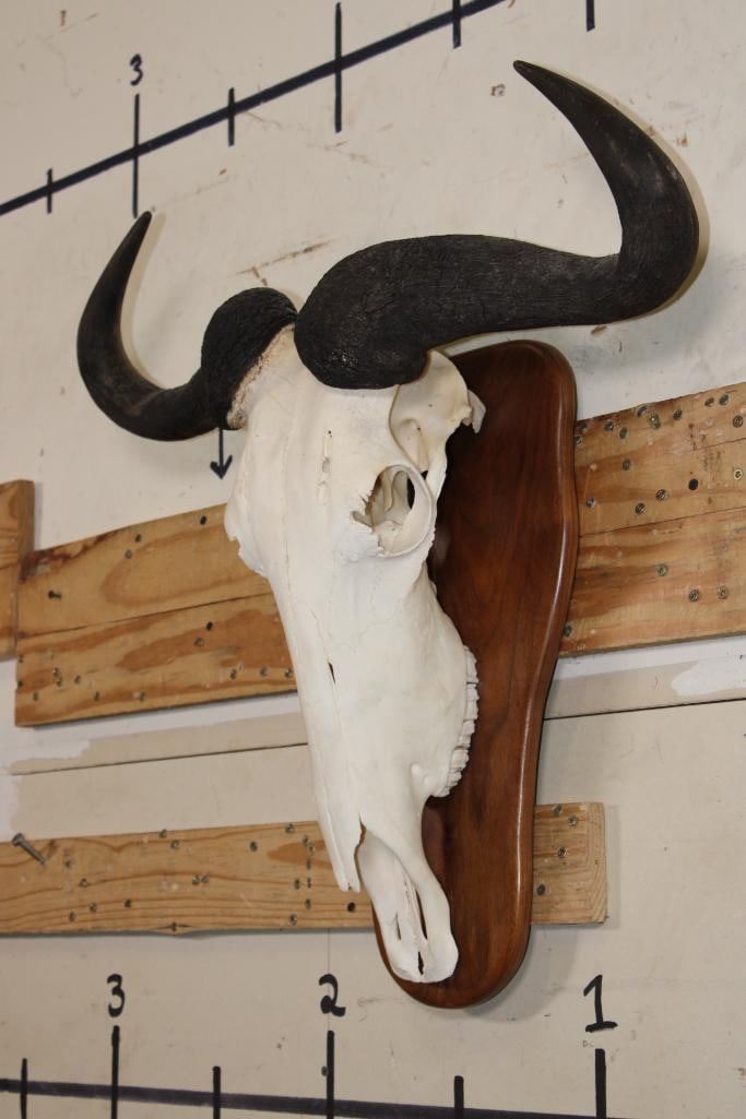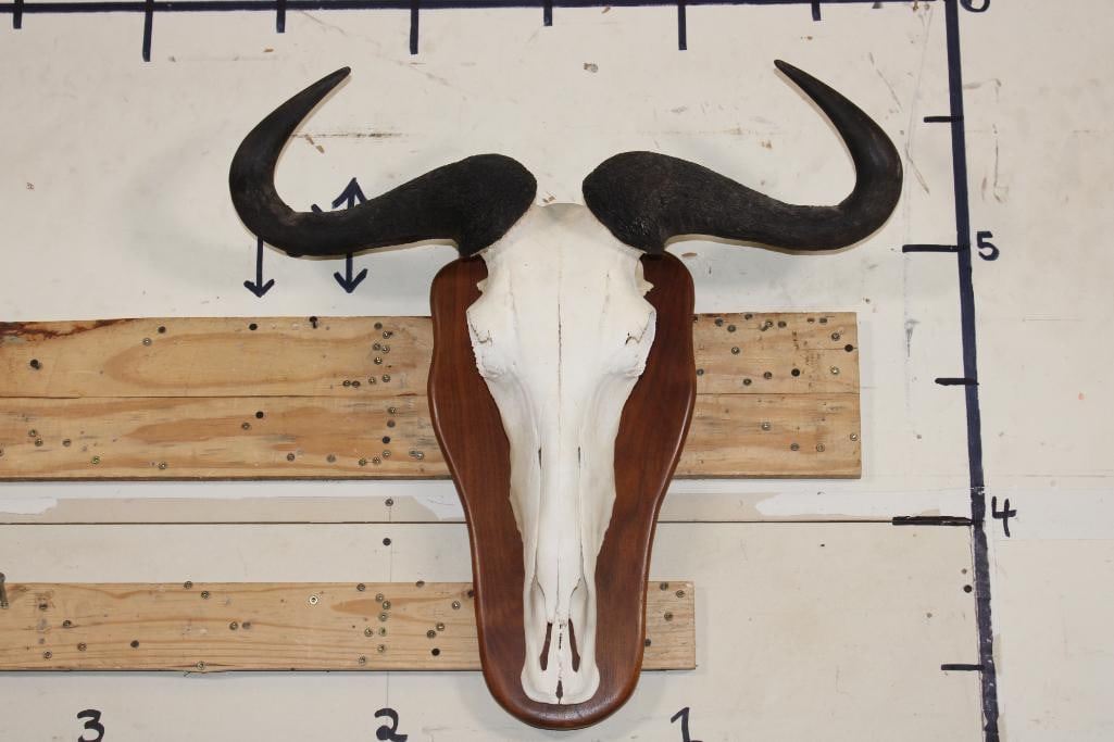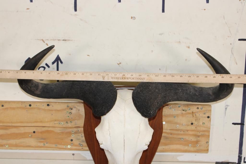Super Nice BLUE WILDEBEEST Skull on a Wooden Plaque. It has a 27.5" Spread. TAXIDERMY