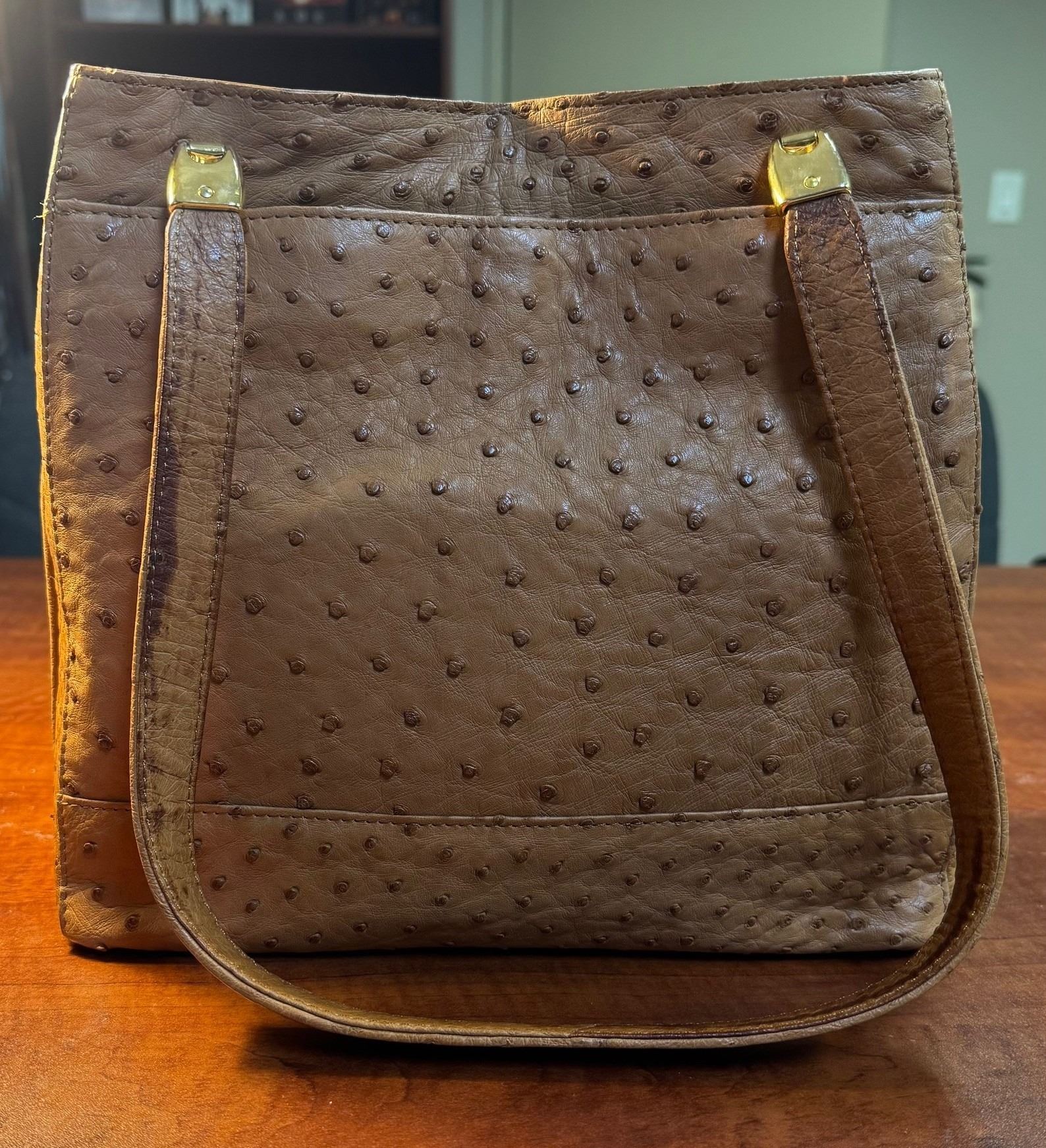 This beautiful vintage ostrich skin handbag by Sabatini features a magnetic closure, brass hardware, two exterior zip pockets, one exterior sleeve pocket, one interior pocket with zip closure, suede interior and protective brass footings. DALLAS SAFARI CLUB THANKS BOB EVANS FOR THIS 100% DONATION.