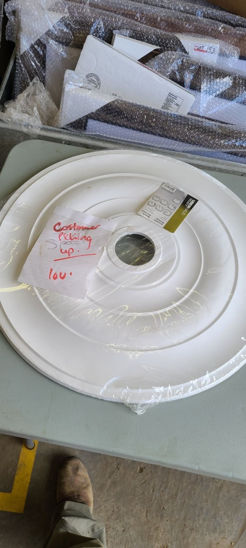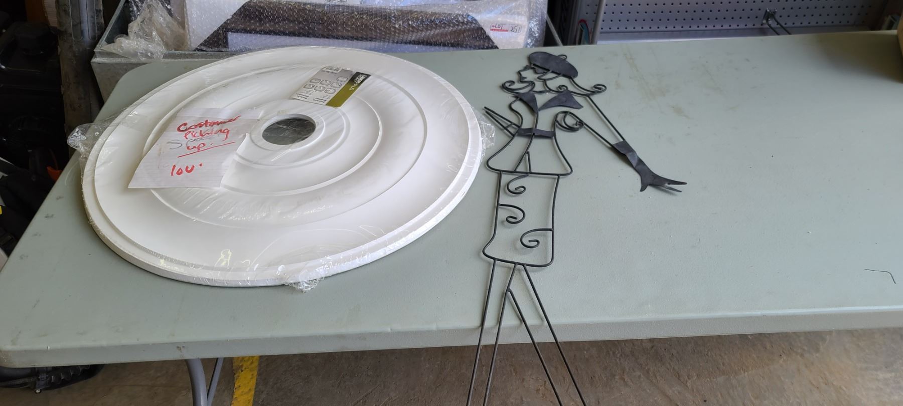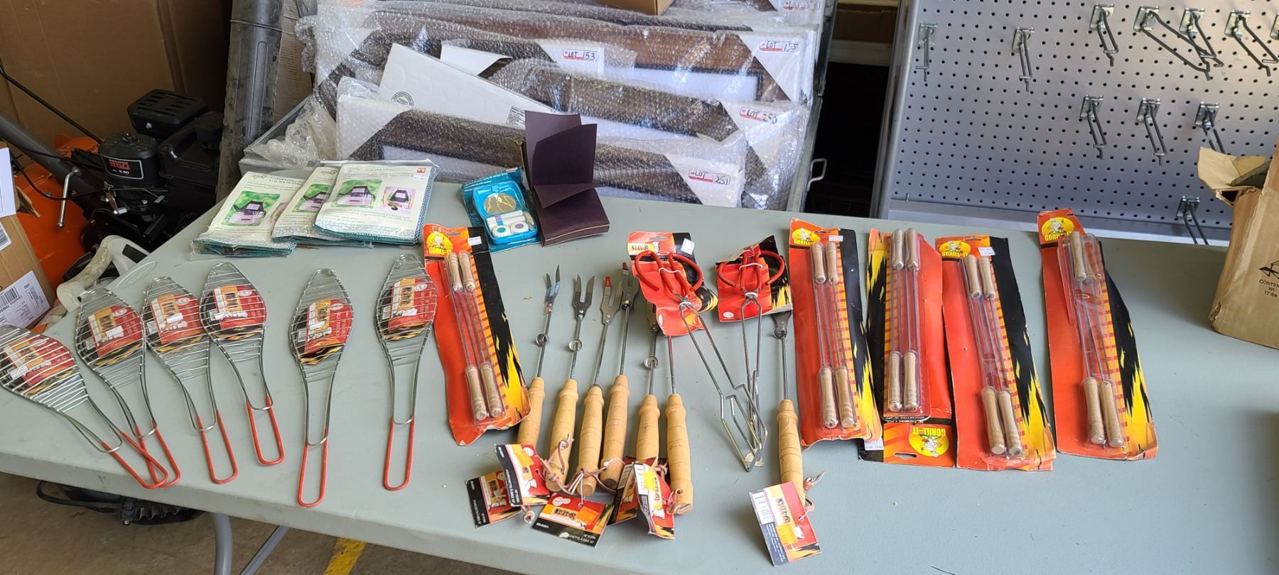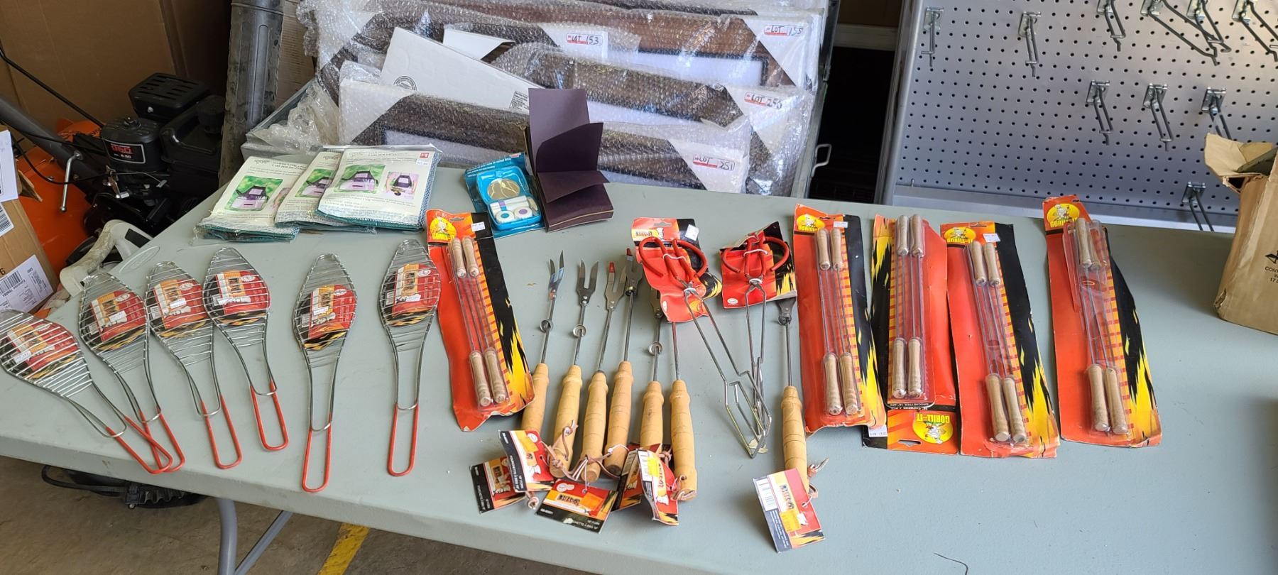 BOX OF NEW BBQ SKEWERS, FISH GRILLS, BOX OF WOODEN END CAPS, ROUND MOLDING