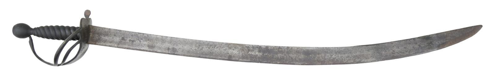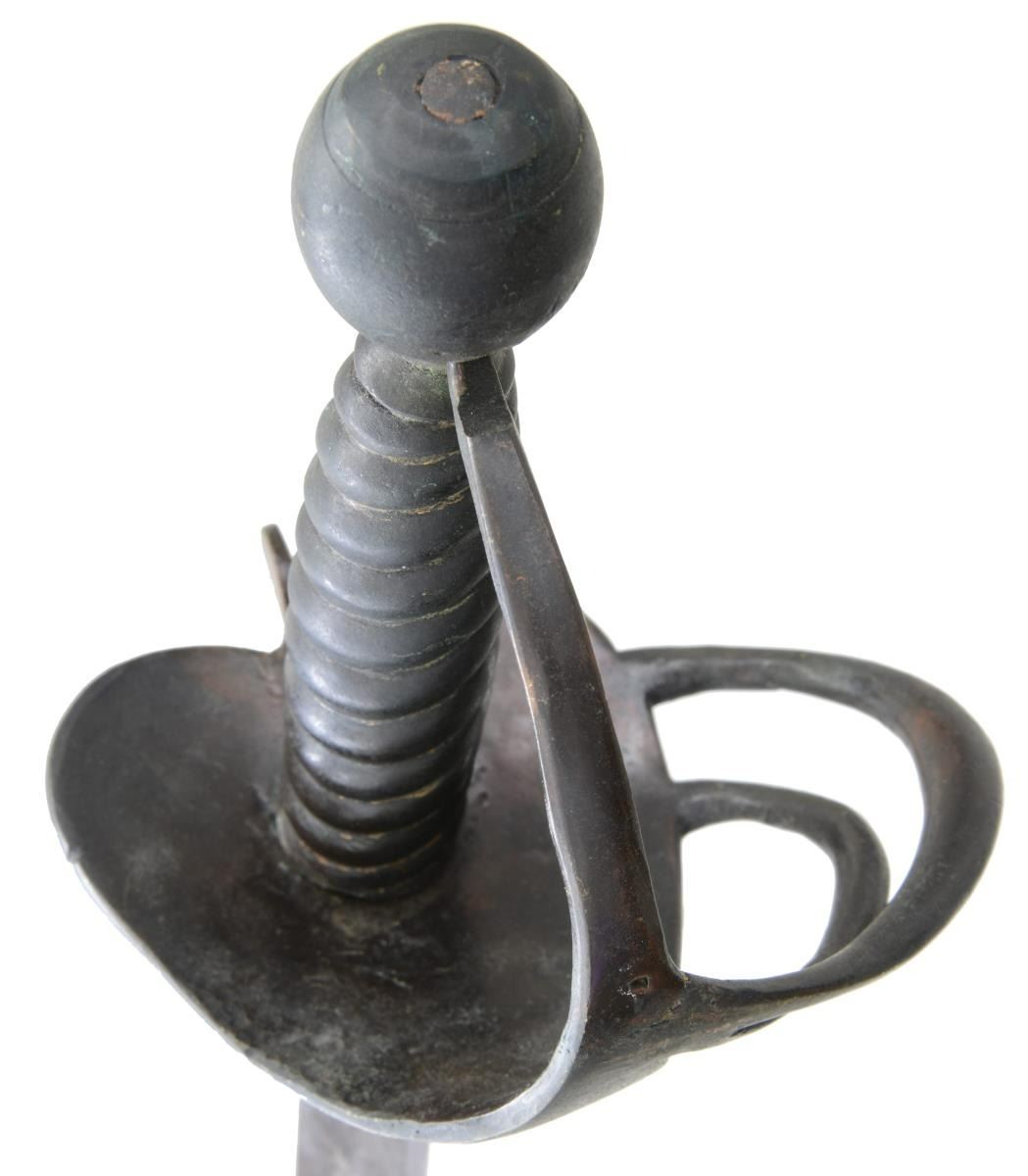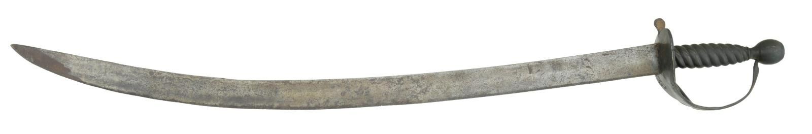 1751. Overall length: 31 1/4". Blade length: 26 1/4". Plain blade with a shallow, almost imperceptible, medium fuller. Solid brass hilt of a style similar to a pattern 1751. A double semi-kidney guard with 2 branches join the knuckle bow at the mid point. The underside of one guard is engraved “42ND Regt.” Melon shaped pommel with integral spiraled grip. No scabbard. CONDITION: blade has a medium gray mottled patina and shows evidence of being sharpened during its use. Hilt has a very deep, dark patina. (02-19267/BF). $500-700.