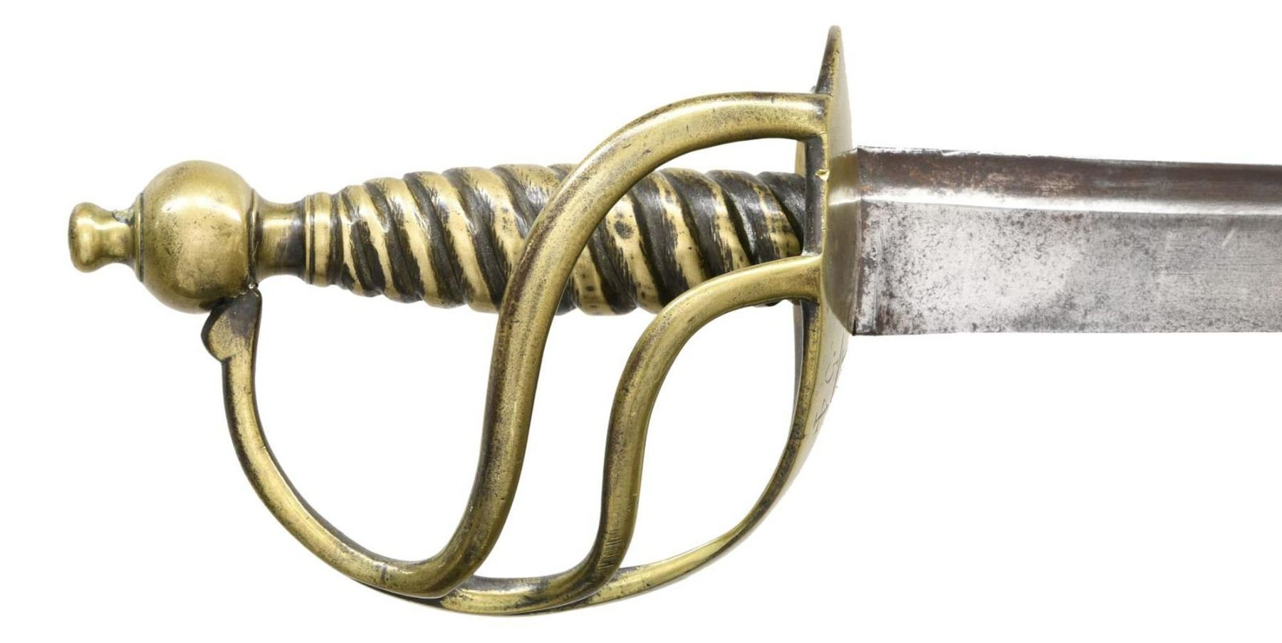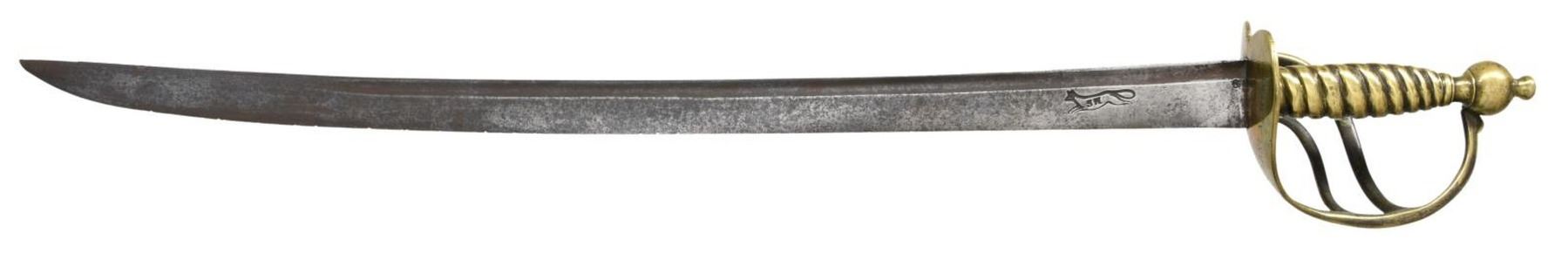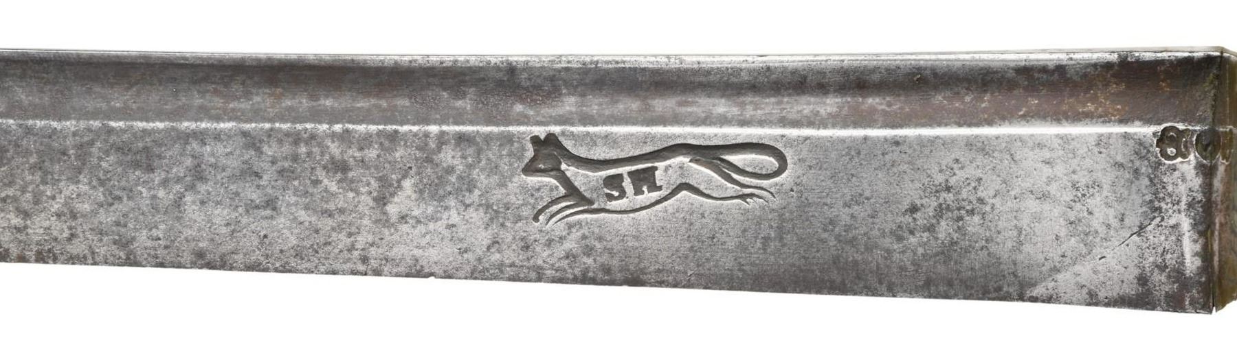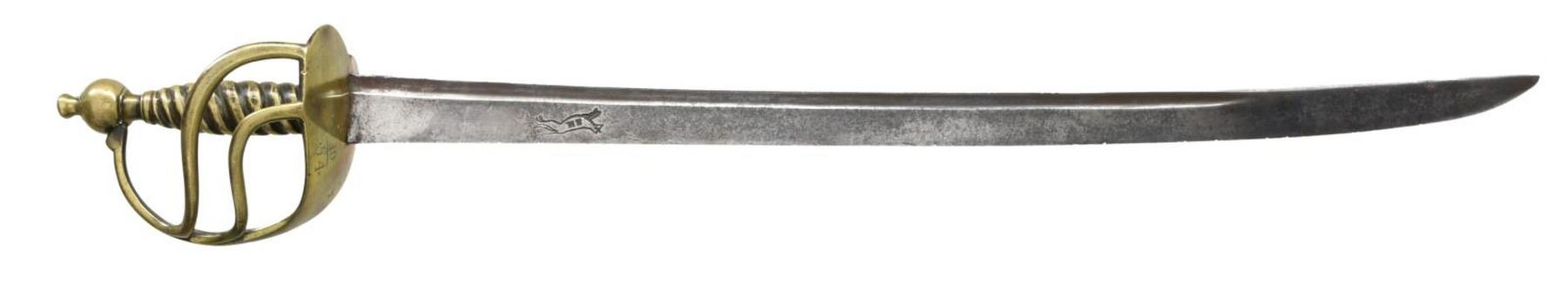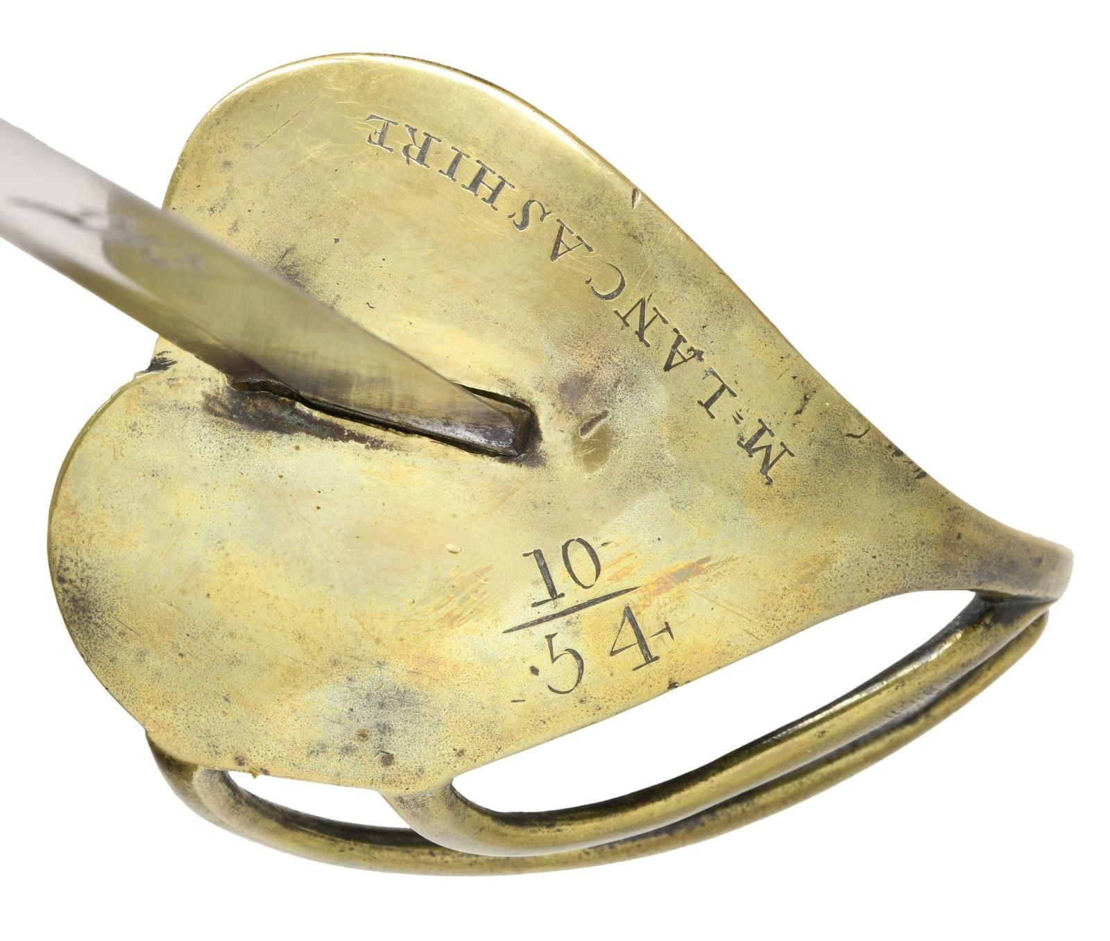 Overall length: 31”. Blade length: 25”. This sword has a plain blade with a single medium fuller near the spine. The blade is stamped on both sides with a running fox and the initials “SH” on the fox. There is a small stamp near the ricasso that appears to be a crowned “6”. Solid brass hilt with a heart-shaped counterguard engraved on the bottom “M=LANCASHIRE” & “10/54”. The quillon has been removed. There are 2 plain branches that intersect the plain knuckle bow before it enters the base of the round pommel with large capstan. Spiraled grip. No scabbard. CONDITION: blade has a medium to dark overall patina with a few nicks to the edge. The hilt has been cleaned but does enjoy an attractive patina. Engraving is clear. (02-20021/BF). $600-800.