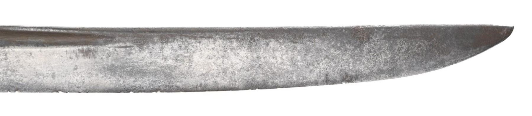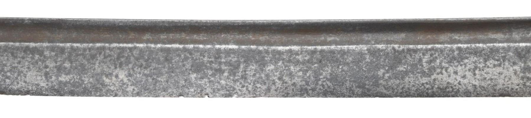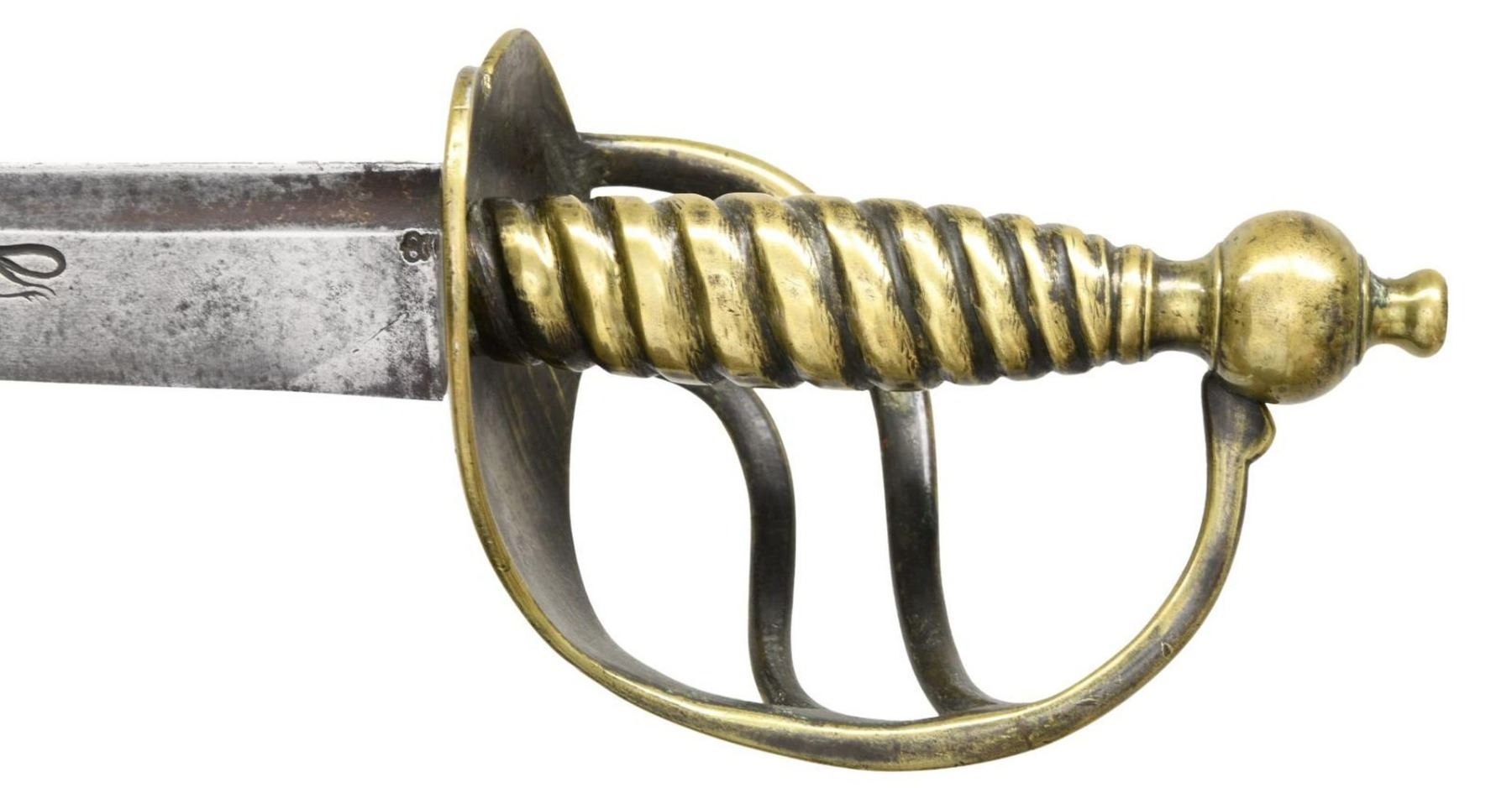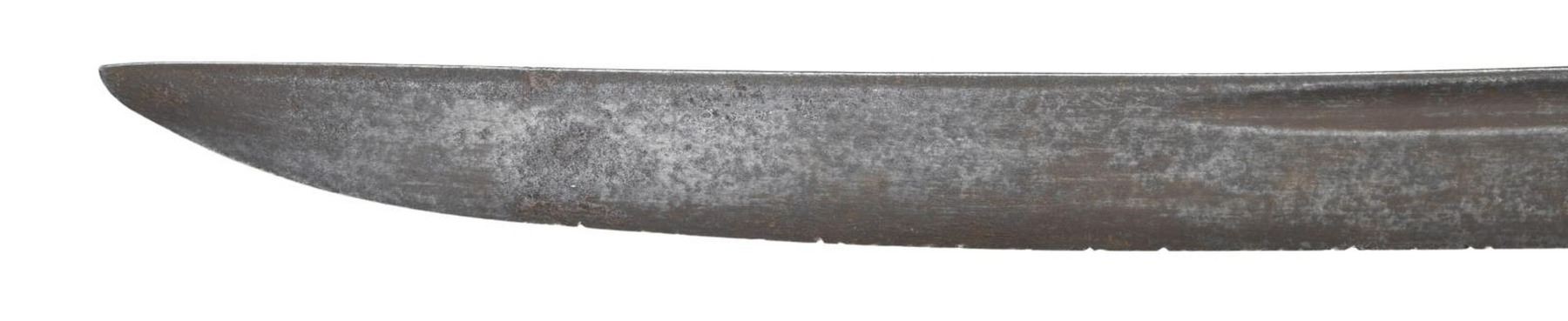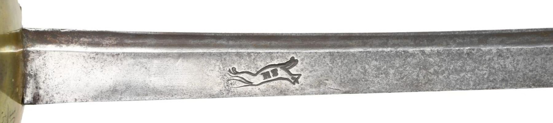 Overall length: 31”. Blade length: 25”. This sword has a plain blade with a single medium fuller near the spine. The blade is stamped on both sides with a running fox and the initials “SH” on the fox. There is a small stamp near the ricasso that appears to be a crowned “6”. Solid brass hilt with a heart-shaped counterguard engraved on the bottom “M=LANCASHIRE” & “10/54”. The quillon has been removed. There are 2 plain branches that intersect the plain knuckle bow before it enters the base of the round pommel with large capstan. Spiraled grip. No scabbard. CONDITION: blade has a medium to dark overall patina with a few nicks to the edge. The hilt has been cleaned but does enjoy an attractive patina. Engraving is clear. (02-20021/BF). $600-800.
