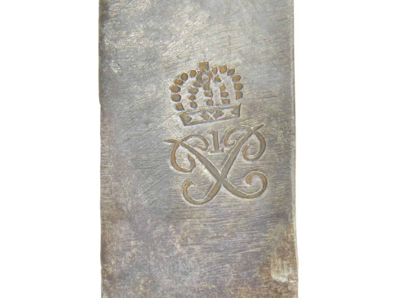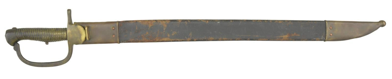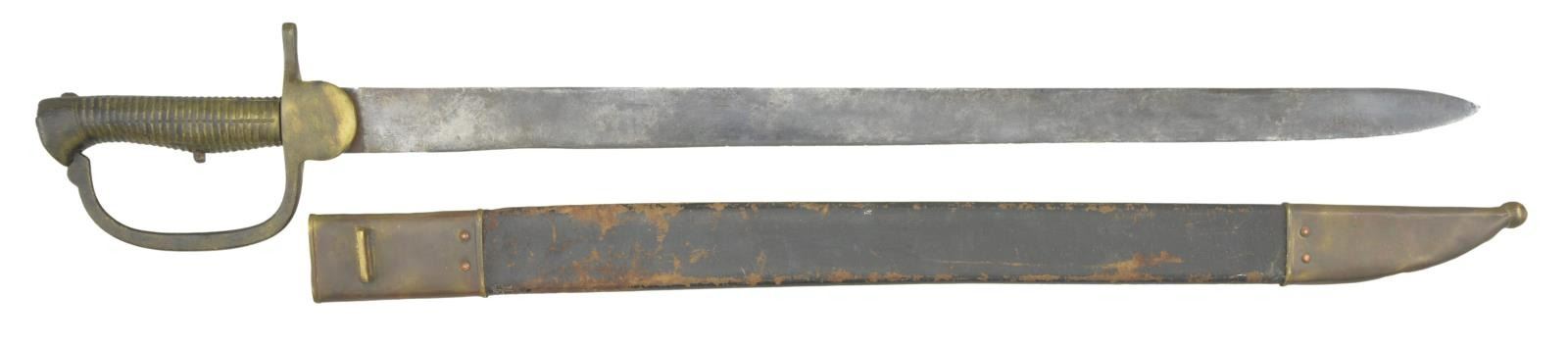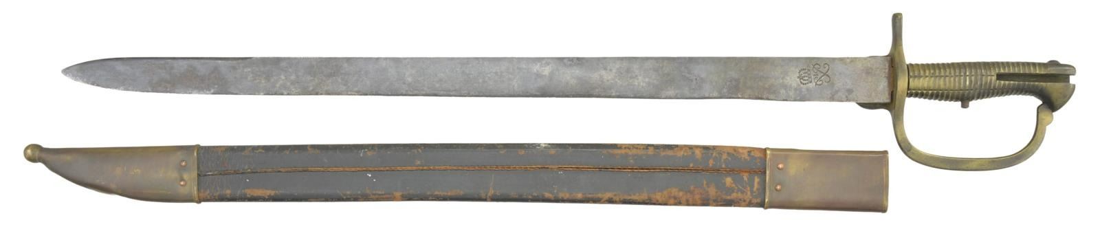 A scarce example of a 2nd pattern British Baker rifle bayonet. Overall length of bayonet: 27 9/16”. Blade length: 22 3/4". Plain flat blade heavily stamped near the ricasso with a crowned royal cypher with a “1” in the center. Brass hilt with a rounded languet & rounded knuckle bow. Ribbed grip is integral to the pommel. Incorrect brass mounted leather scabbard. CONDITION: blade has an overall dark patina with a small amount of pitting near the tip. Hilt is a bit loose and has a dark patina. The spring is complete but rusted & frozen. The scabbard is quite solid with a deep patina on the mounts but, again, is not correct for this bayonet. PROVENANCE: From the Lifelong Collection of Glen E. Mattox. (02-18532/BF). $300-500.