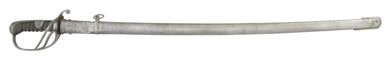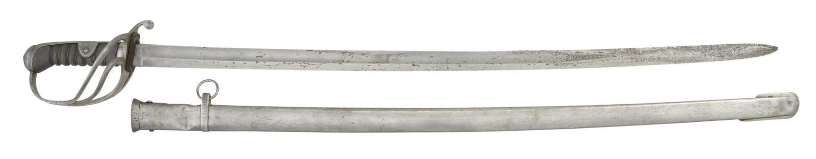 Overall length: 40 3/4". Blade length: 33 5/8”. Plain blade with a single wide fuller and a false edge extending 9” from the tip. Iron hilt with 2-branch guard & downturned quillon stamped “E213”. There is a knot slot at the top of the knuckle bow. Modified bird’s head pommel with plain backstrap with ears on both sides. Wire-wrapped sharkskin grip. Iron scabbard may not be original to the sword. CONDITION: blade has a light gray patina with heavy cleaned pitting near the tip. Hilt shows light overall wear. Scabbard has a light gray patina with scattered shallow dents. (02-19385/BF). $300-450.