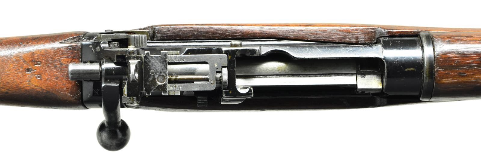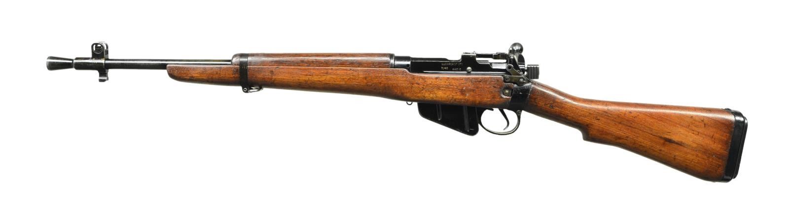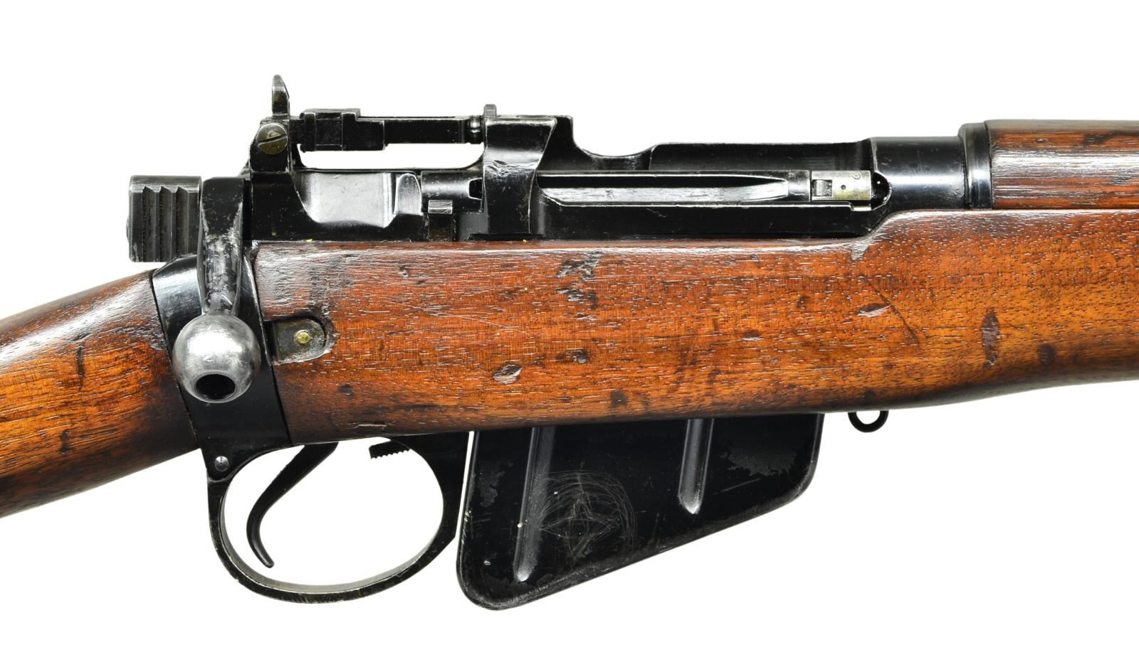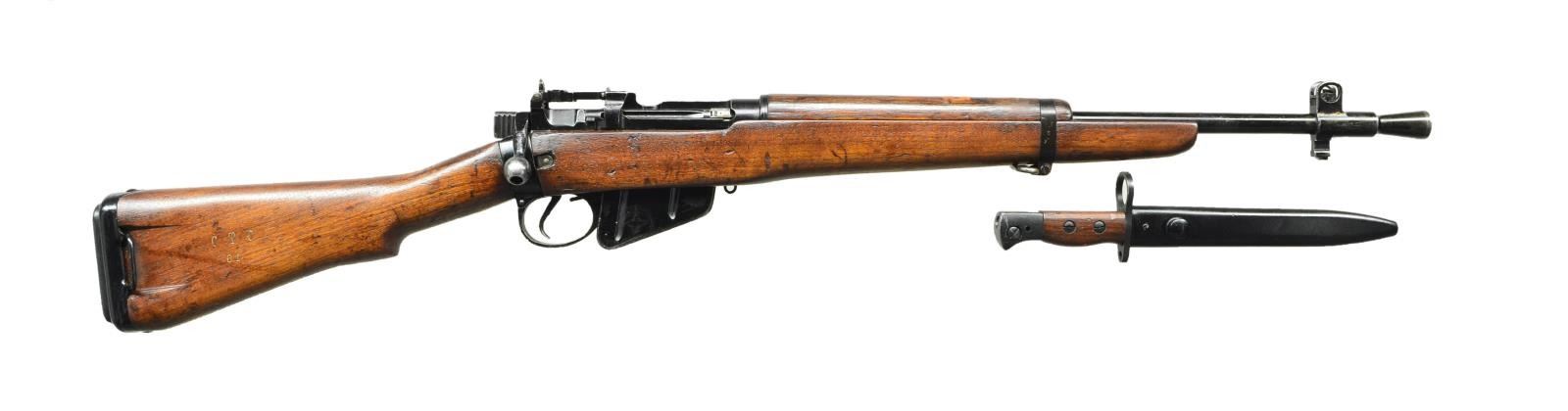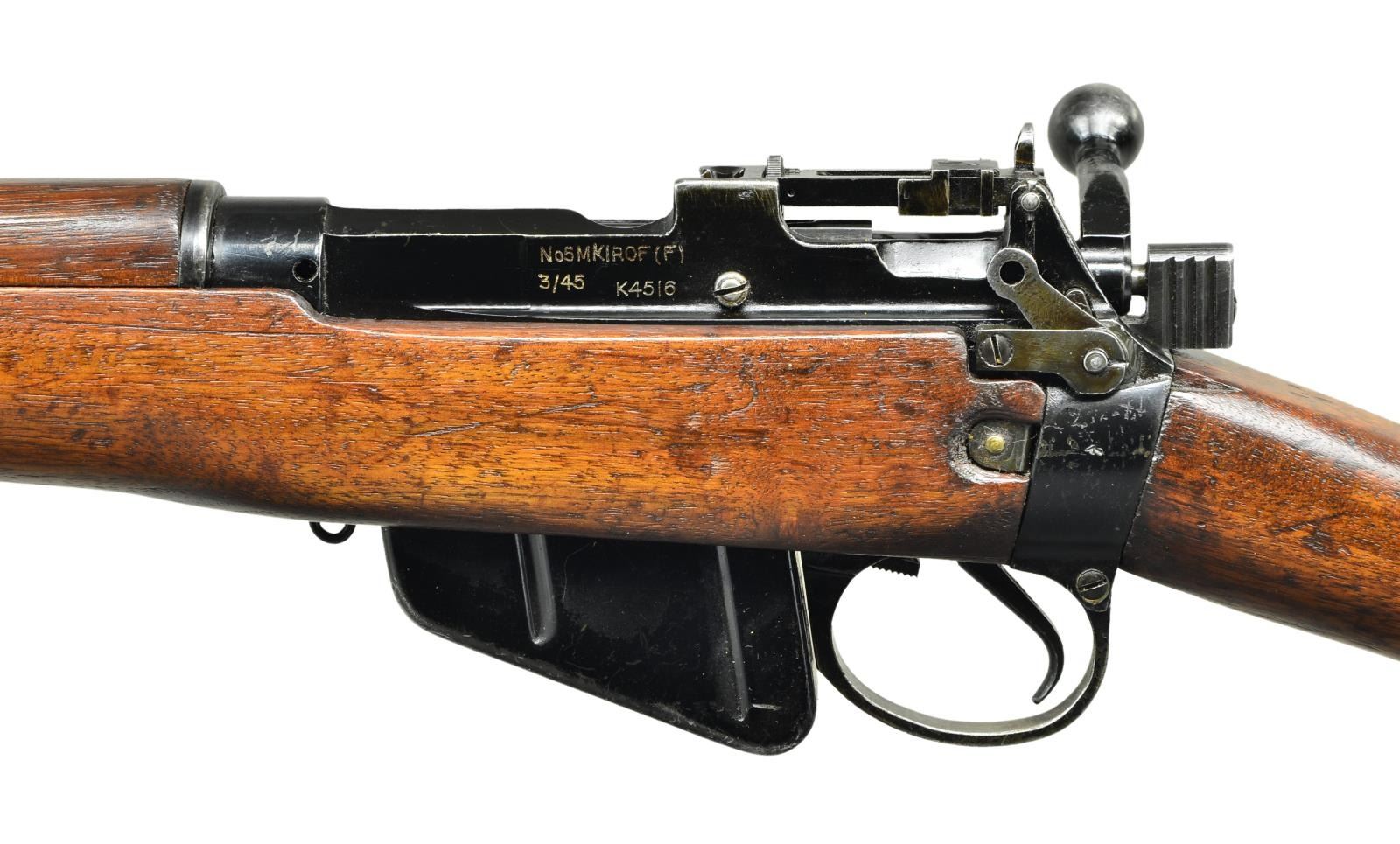 MILITARY RIFLE. Cal. 303 British. S# K4516. Bbl. 20 5/8" including flash suppressor. Aperture ladder rear sight marked "F". Graduated to 800 yards. Blade front sight w/ protective ears. Cone type flash hider w/ bayonet lug. Receiver has correct lightening cuts on top rear & is marked on left side in electro pencil "NO 5 MKI ROF(F) 3/45 S#". Butt socket is marked on left side w/ "broad arrow". Latch type bolt release. Receiver is additionally made w/out boss on right rail. Trigger guard made w/ lightening cuts at forward end. Hardwood stock set. Forend made w/out metal tip. Correct sling swivel & sling bar mounted on right side of buttplate. Buttplate has rubber recoil pad. Buttstock marked on right side "CTC 61"; marked on top of grip "R.P.B.". MAGS: 1 matching 10 rd. UNATTACHED ACCESSORIES: 7 7/8" Fullerd blade bayonet marked on right ricasso "W.S.C.". Smooth hardwood grips, birds head pommel & steel scabbard. Bayonet is in good arsenal rework condition w/ light wear & handling marks. CONDITION: stock set has light to moderate wear & handling marks over original finish. Metal retains 60% original black finish w/ thinning wear & handling marks. Very good shiny bore. (23-351/RW). CURIO. $600-900.